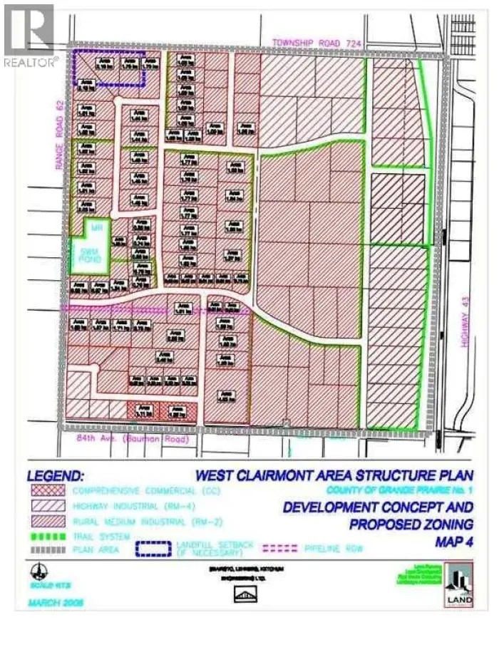 Remnant of the land NW section included in the west Clairmont industrial ASP developable to light industrial uses. 7 lots were previously subdivided as phase 1, and additional lots can be subdivided as subsequent phases. All services including water, sanitary sewer, 3phase power, telecommunication