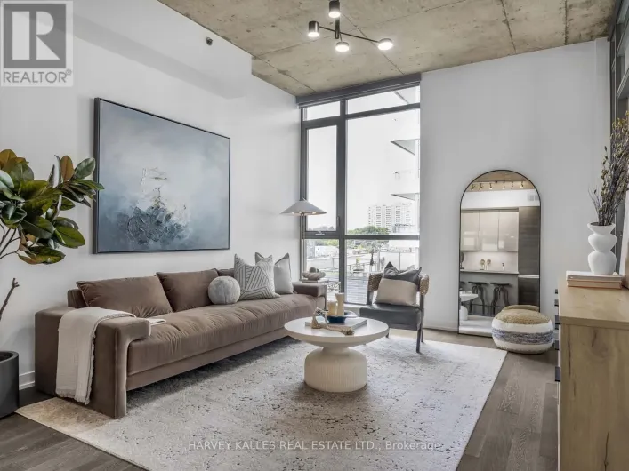 Queen & Gladstone Boutique Living in the Heart of West Queen West. Welcome to Suite 615 at 8 Gladstone, a stunning one-bedroom residence offering 630 sq. ft. of impeccably designed living space. With soaring 10-foot exposed concrete ceilings and floor-to-ceiling windows, this open-concept suite