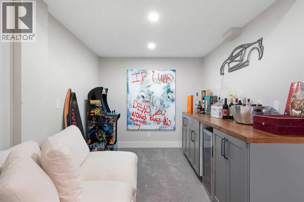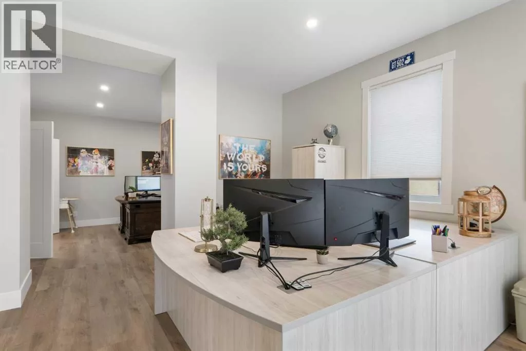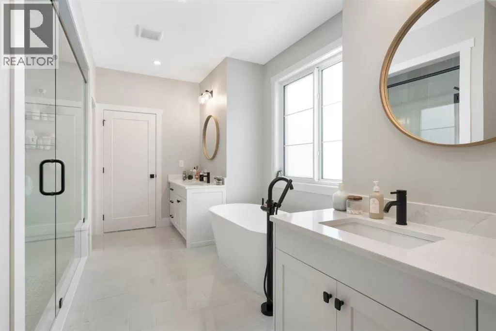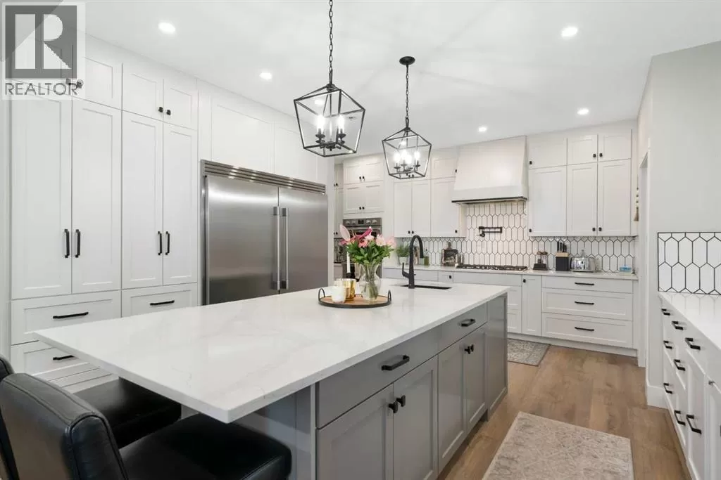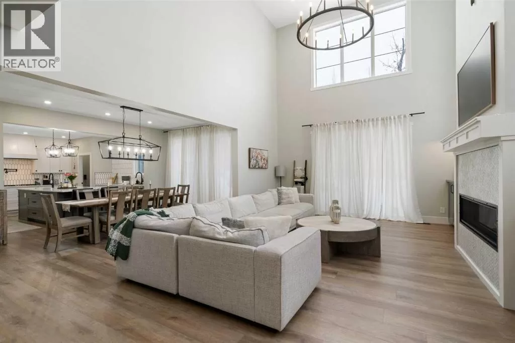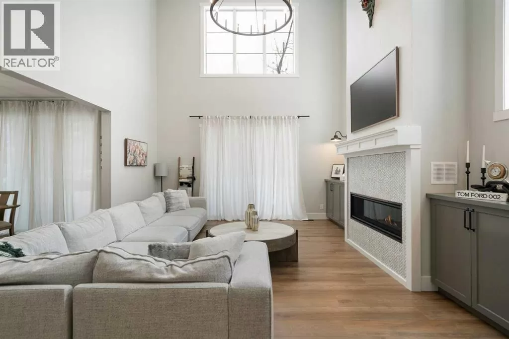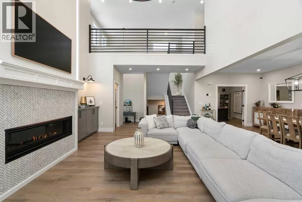 Welcome to this architectural masterpiece by Studio Wolf Designs in one of Airdrieâs most sought-after locations - The Village. This nearly new modern ranch-style estate offers an unparalleled blend of luxury, design, and functionality. Situated on an expansive 6,490 sq. ft. CORNER LOT, this home spans 3,704 sq. ft. above grade plus a fully developed 1,612 sq. ft. basement, bringing the total living space to over 5,300 sq. ft. As you enter, be captivated by 18-foot soaring ceilings in the foyer and living room, complemented by a custom-designed fireplace and surround. The gourmet kitchen is a chefâs dream with premium appliances featuring a full side-by-side freezer and refrigerator, cooled beverage centre, built-in gas cooktop, dual built-in convection and conventional ovens. Two kitchen sinks make dishes a breeze, while keeping the island sink free of clutter for your family and guestâs comfort. The oversized walk-in pantry and high-end finishes elevate this kitchen to its ultimate potential. The main floor also offers a private office/den area, flex room with courtyard access, 2-piece bathroom, and spacious mudroom leading to an oversized double attached garage with custom epoxy flooring. Upstairs, an open rail gallery provides a panoramic view of the main floor and vaulted ceilings. The upper level is designed for both comfort and sophistication, boasting 4 spacious bedrooms, including a large primary bedroom with a spa-like ensuite featuring a custom glass shower, freestanding bathtub, dual vanities, and a large walk-in closet with built-in storage. Two bedrooms share a Jack-and-Jill ensuite, while the fourth bedroom enjoys its own private 4-piece bathroom. A good size laundry room with built-in sink and folding area, and a bonus room with a covered balcony and quiet sitting area complete the upper level. The fully developed basement is an entertainerâs dream - offering a spacious recreation room, bar area, 3-piece bathroom, fifth bedroom, and sixth bedroom-tu rned-gym with sauna. Step outside to your private backyard retreat featuring new fencing and professional landscaping. This smart home is fully equipped with premium security and technology, including a full-perimeter surveillance system with 2TB storage, 12MM smash-proof window film & tint for added privacy, and custom exterior GEM lighting. Additional upgrades include two AC units and custom window coverings throughout. Nestled within walking distance to Airdrieâs downtown core, top-rated restaurants, shops, Jensen Park, Plainsmen Arena, and the Airdrie Farmers Market, with quick access to Highway 2, this residence offers the perfect blend of luxury and convenience. Experience the finest in modern ranch-style livingâthis exceptional estate is one of Airdrieâs most coveted opportunities. (id:27476)