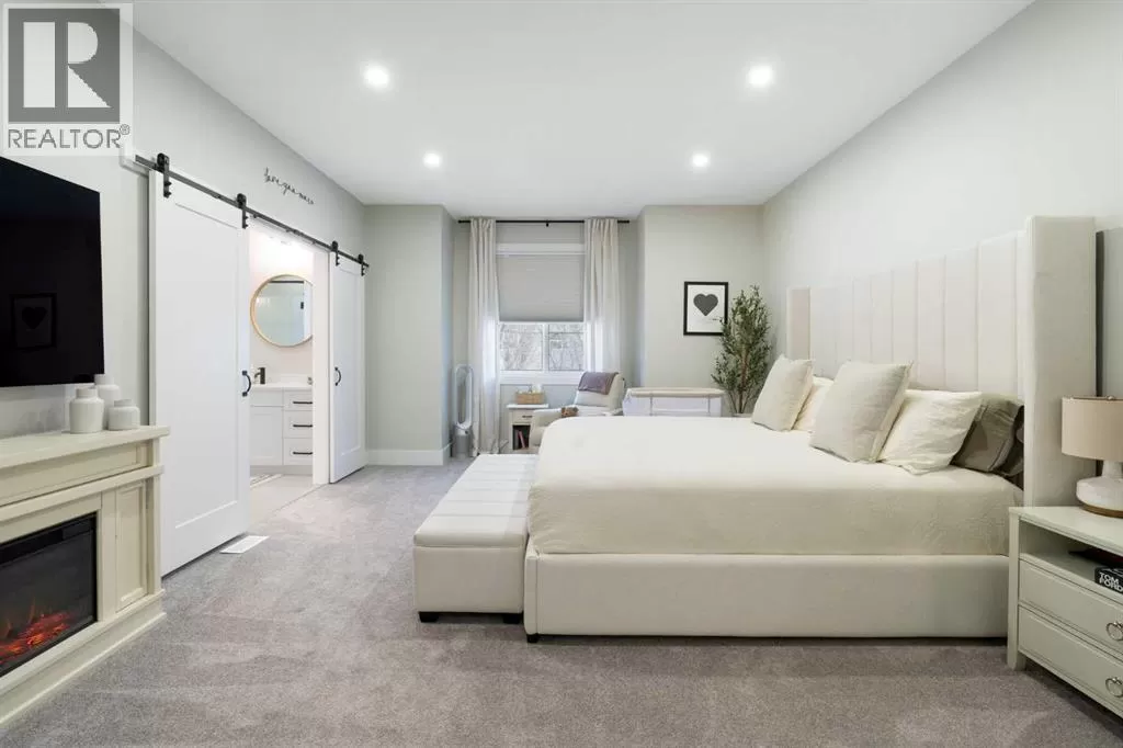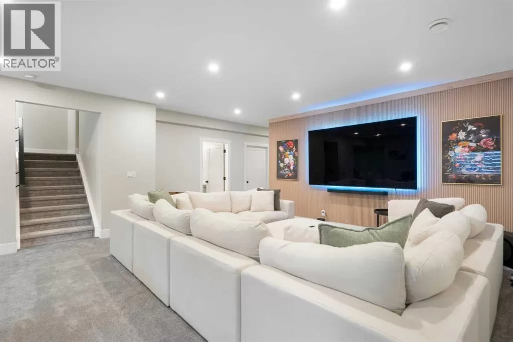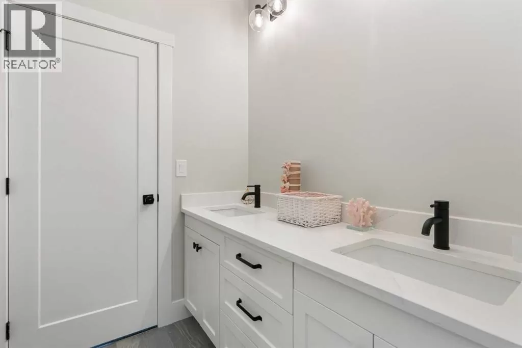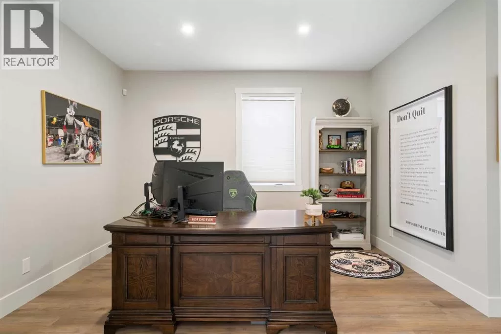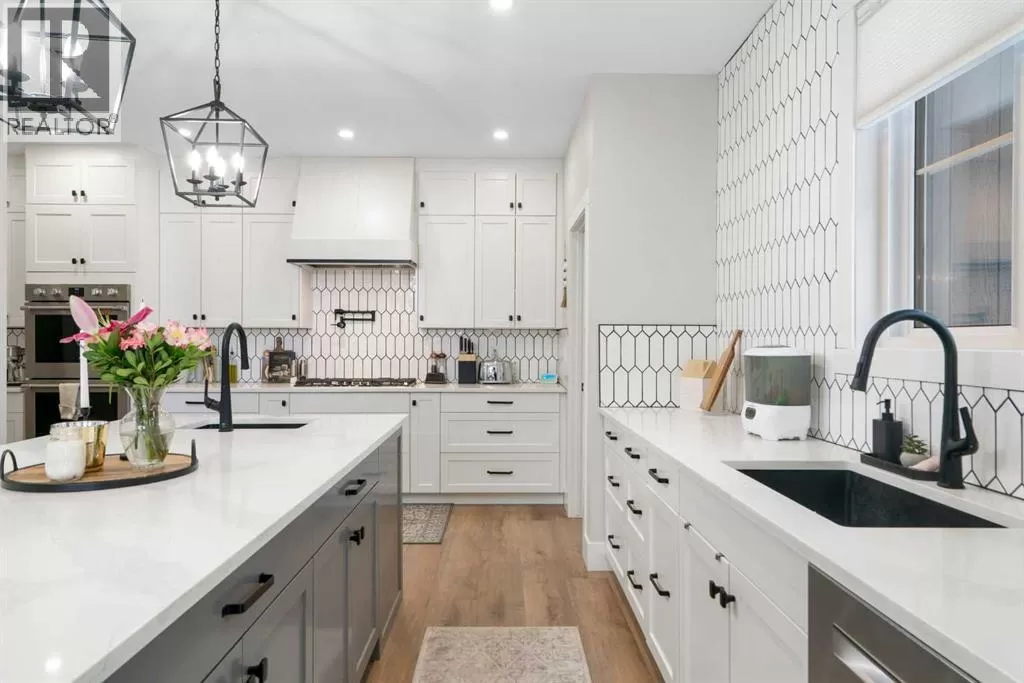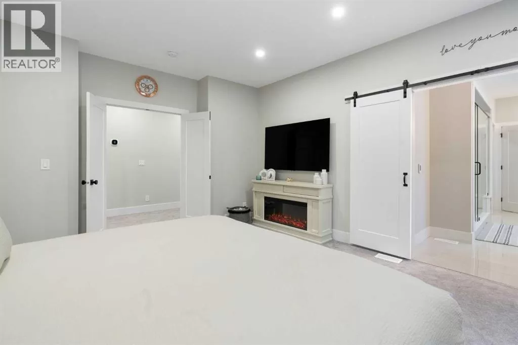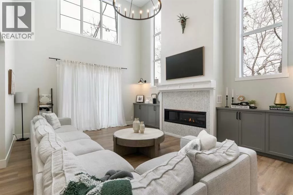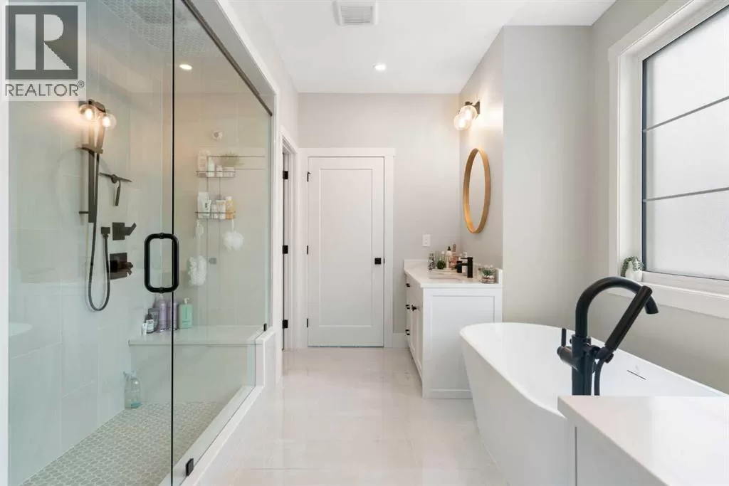 Welcome to this architectural masterpiece by Studio Wolf Designs in one of Airdrieâs most sought-after locations - The Village. This nearly new modern ranch-style estate offers an unparalleled blend of luxury, design, and functionality. Situated on an expansive 6,490 sq. ft. CORNER LOT, this home spans 3,704 sq. ft. above grade plus a fully developed 1,612 sq. ft. basement, bringing the total living space to over 5,300 sq. ft. As you enter, be captivated by 18-foot soaring ceilings in the foyer and living room, complemented by a custom-designed fireplace and surround. The gourmet kitchen is a chefâs dream with premium appliances featuring a full side-by-side freezer and refrigerator, cooled beverage centre, built-in gas cooktop, dual built-in convection and conventional ovens. Two kitchen sinks make dishes a breeze, while keeping the island sink free of clutter for your family and guestâs comfort. The oversized walk-in pantry and high-end finishes elevate this kitchen to its ultimate potential. The main floor also offers a private office/den area, flex room with courtyard access, 2-piece bathroom, and spacious mudroom leading to an oversized double attached garage with custom epoxy flooring. Upstairs, an open rail gallery provides a panoramic view of the main floor and vaulted ceilings. The upper level is designed for both comfort and sophistication, boasting 4 spacious bedrooms, including a large primary bedroom with a spa-like ensuite featuring a custom glass shower, freestanding bathtub, dual vanities, and a large walk-in closet with built-in storage. Two bedrooms share a Jack-and-Jill ensuite, while the fourth bedroom enjoys its own private 4-piece bathroom. A good size laundry room with built-in sink and folding area, and a bonus room with a covered balcony and quiet sitting area complete the upper level. The fully developed basement is an entertainerâs dream - offering a spacious recreation room, bar area, 3-piece bathroom, fifth bedroom, and sixth bedroom-tu rned-gym with sauna. Step outside to your private backyard retreat featuring new fencing and professional landscaping. This smart home is fully equipped with premium security and technology, including a full-perimeter surveillance system with 2TB storage, 12MM smash-proof window film & tint for added privacy, and custom exterior GEM lighting. Additional upgrades include two AC units and custom window coverings throughout. Nestled within walking distance to Airdrieâs downtown core, top-rated restaurants, shops, Jensen Park, Plainsmen Arena, and the Airdrie Farmers Market, with quick access to Highway 2, this residence offers the perfect blend of luxury and convenience. Experience the finest in modern ranch-style livingâthis exceptional estate is one of Airdrieâs most coveted opportunities. (id:27476)