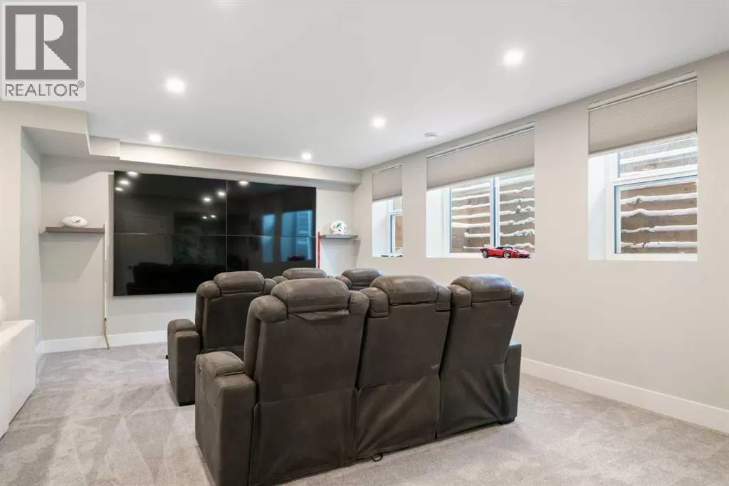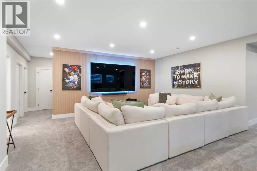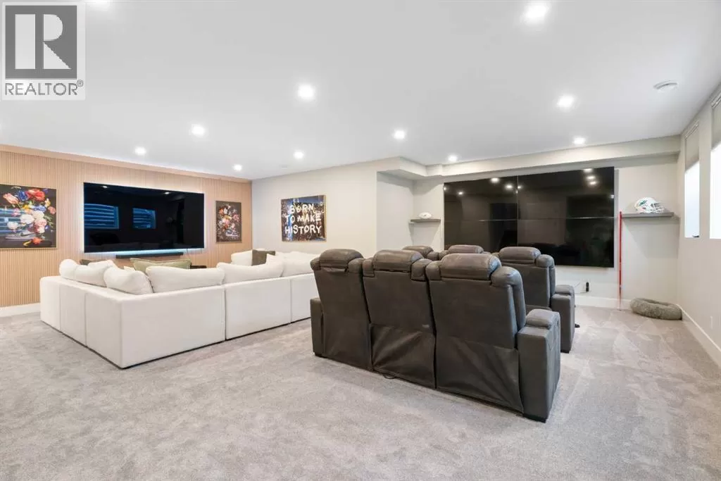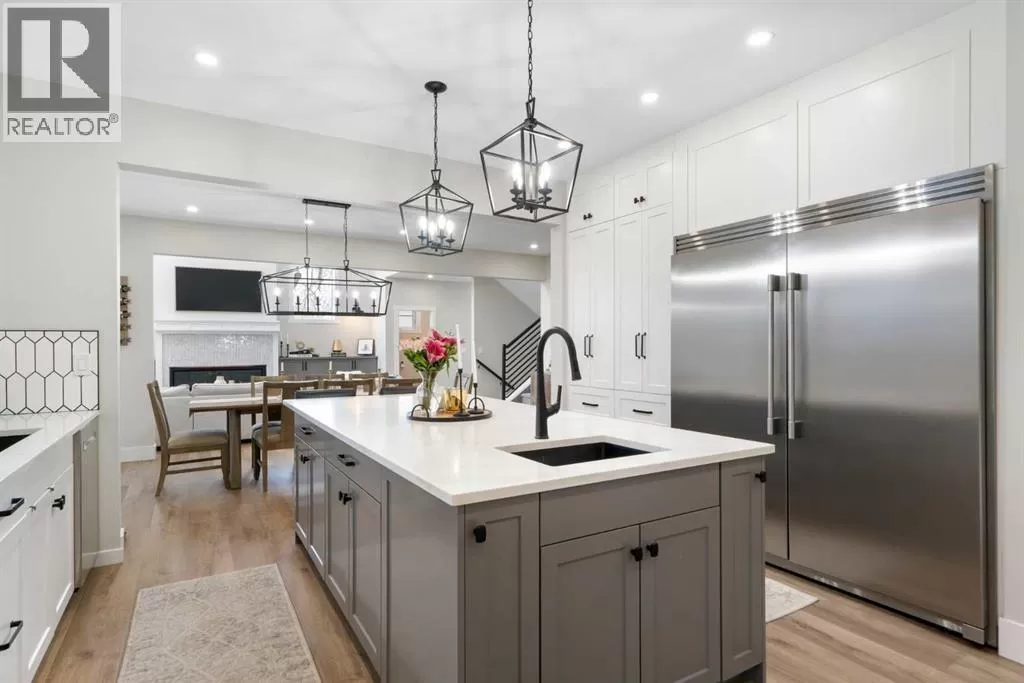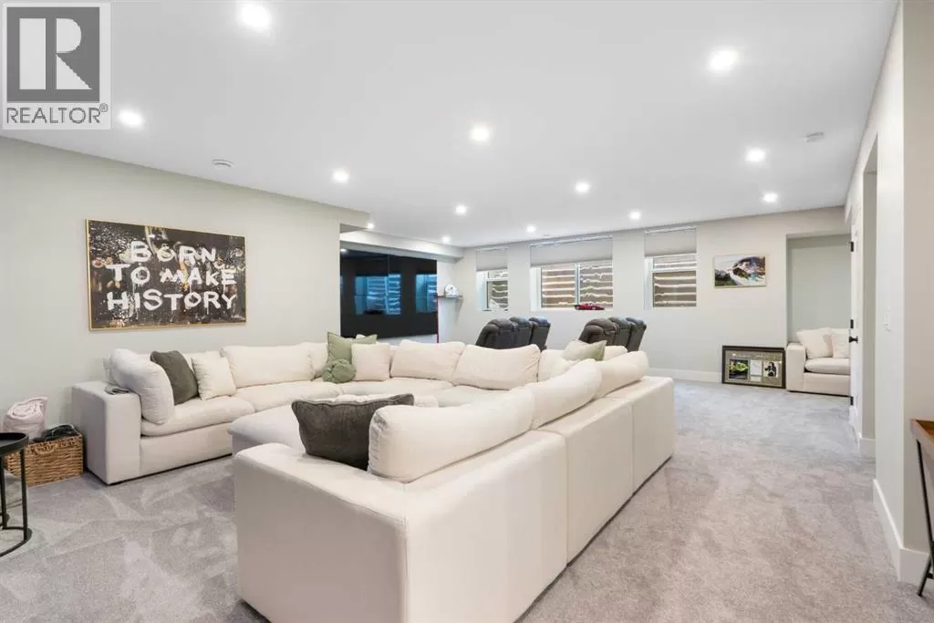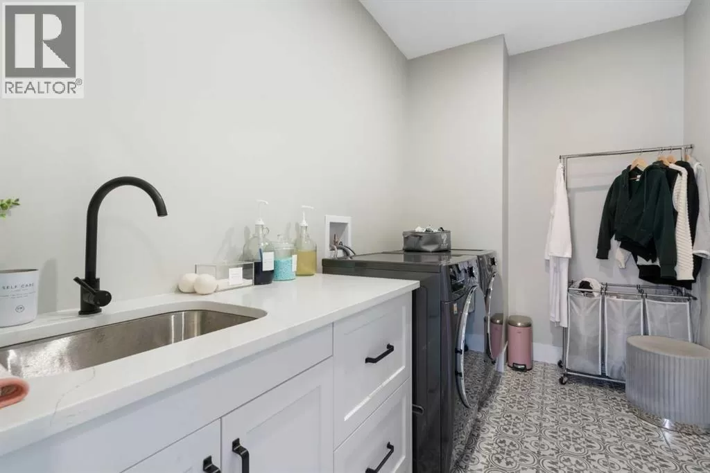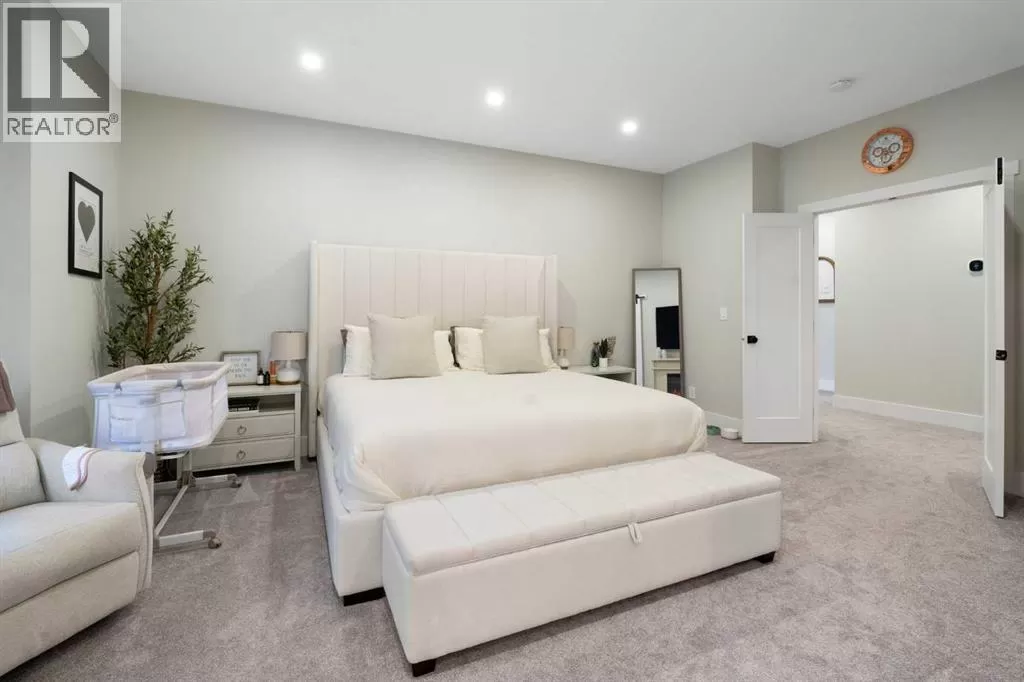 Welcome to this architectural masterpiece by Studio Wolf Designs in one of Airdrieâs most sought-after locations - The Village. This nearly new modern ranch-style estate offers an unparalleled blend of luxury, design, and functionality. Situated on an expansive 6,490 sq. ft. CORNER LOT, this home spans 3,704 sq. ft. above grade plus a fully developed 1,612 sq. ft. basement, bringing the total living space to over 5,300 sq. ft. As you enter, be captivated by 18-foot soaring ceilings in the foyer and living room, complemented by a custom-designed fireplace and surround. The gourmet kitchen is a chefâs dream with premium appliances featuring a full side-by-side freezer and refrigerator, cooled beverage centre, built-in gas cooktop, dual built-in convection and conventional ovens. Two kitchen sinks make dishes a breeze, while keeping the island sink free of clutter for your family and guestâs comfort. The oversized walk-in pantry and high-end finishes elevate this kitchen to its ultimate potential. The main floor also offers a private office/den area, flex room with courtyard access, 2-piece bathroom, and spacious mudroom leading to an oversized double attached garage with custom epoxy flooring. Upstairs, an open rail gallery provides a panoramic view of the main floor and vaulted ceilings. The upper level is designed for both comfort and sophistication, boasting 4 spacious bedrooms, including a large primary bedroom with a spa-like ensuite featuring a custom glass shower, freestanding bathtub, dual vanities, and a large walk-in closet with built-in storage. Two bedrooms share a Jack-and-Jill ensuite, while the fourth bedroom enjoys its own private 4-piece bathroom. A good size laundry room with built-in sink and folding area, and a bonus room with a covered balcony and quiet sitting area complete the upper level. The fully developed basement is an entertainerâs dream - offering a spacious recreation room, bar area, 3-piece bathroom, fifth bedroom, and sixth bedroom-tu rned-gym with sauna. Step outside to your private backyard retreat featuring new fencing and professional landscaping. This smart home is fully equipped with premium security and technology, including a full-perimeter surveillance system with 2TB storage, 12MM smash-proof window film & tint for added privacy, and custom exterior GEM lighting. Additional upgrades include two AC units and custom window coverings throughout. Nestled within walking distance to Airdrieâs downtown core, top-rated restaurants, shops, Jensen Park, Plainsmen Arena, and the Airdrie Farmers Market, with quick access to Highway 2, this residence offers the perfect blend of luxury and convenience. Experience the finest in modern ranch-style livingâthis exceptional estate is one of Airdrieâs most coveted opportunities. (id:27476)