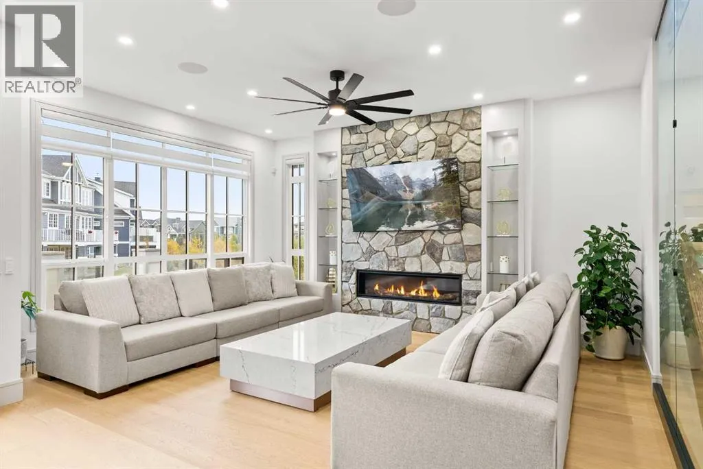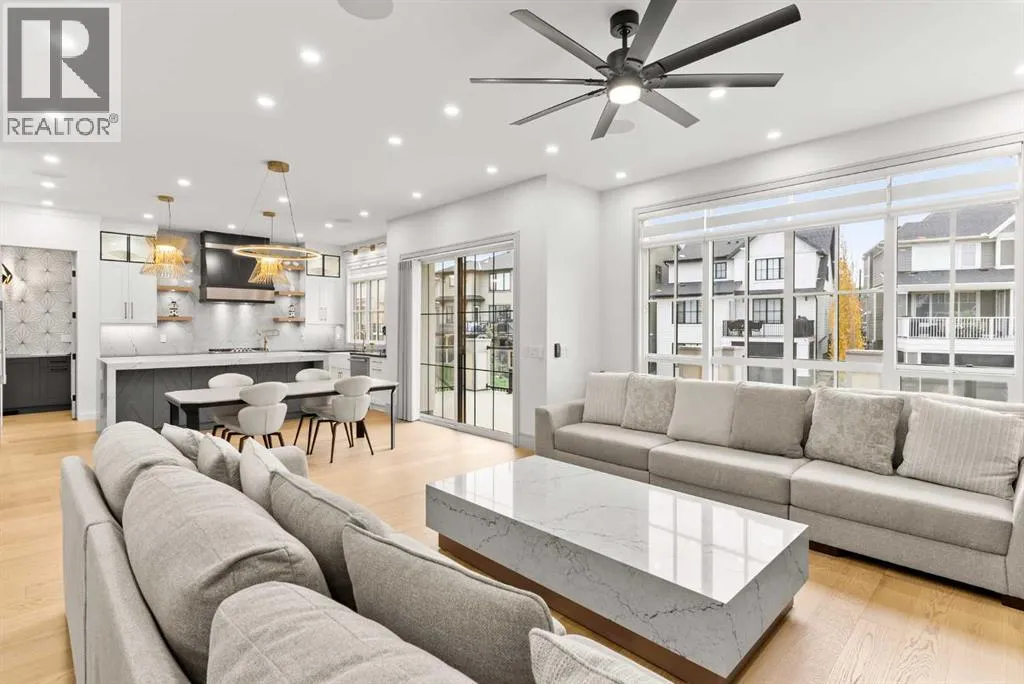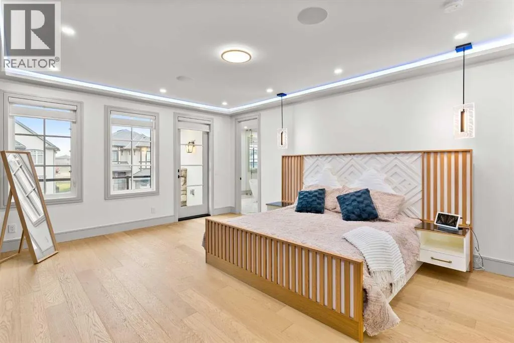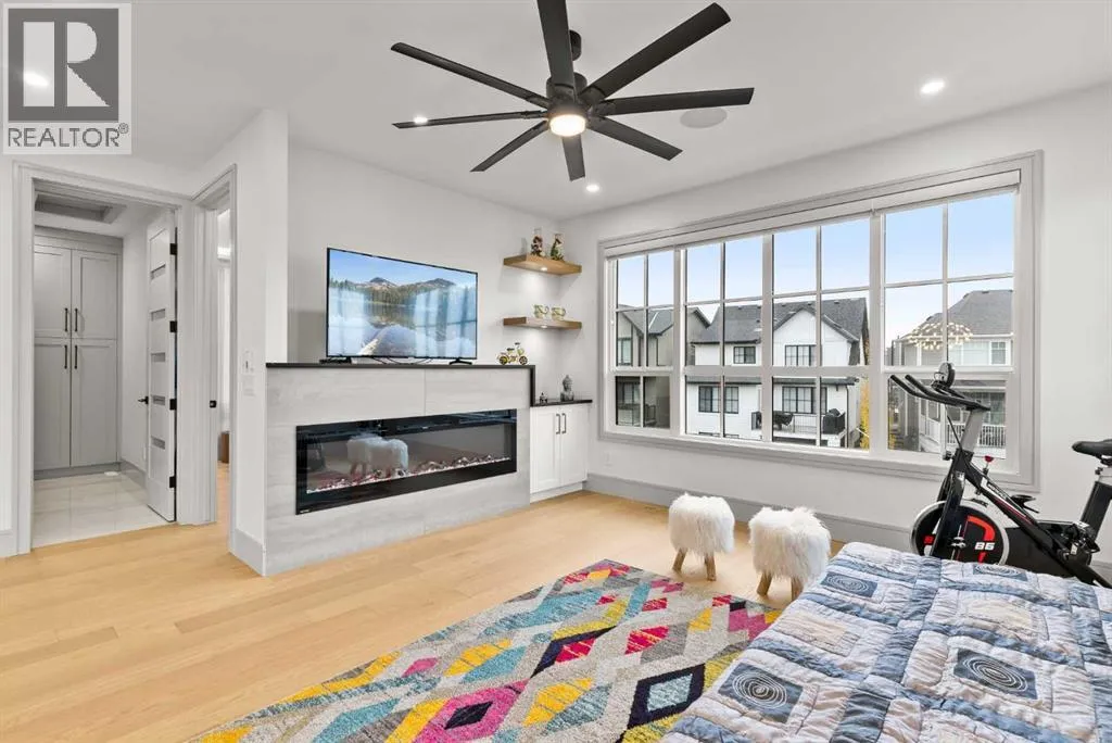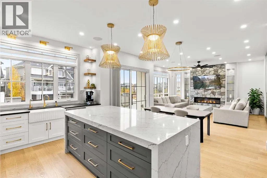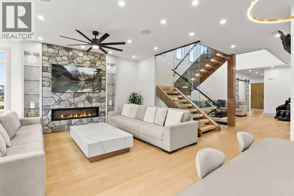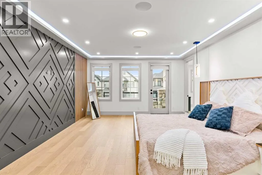 Welcome to 1473 Coopers Landing SW, an extraordinary residence backing onto a serene pond and pathway. This architectural gem boasts a total of impressive 5,528 square feet of thoughtfully designed living space, exemplifying the height of luxury. As you enter, youâre greeted by grand 10' ceilings on the main floor, featuring a sleek, modern flat paint finish. The main level flows seamlessly, including a Living Room, Formal Dining Room, Den/Office, Family Room, Nook, Main Kitchen, Spice Kitchen or Butlerâs Kitchen, and a Full Bath with a custom shower. A large low maintenance deck with plexiglass railings and stairs leading down to the backyard off the kitchen nook overlooks the numerous pathways and greenery that is a beautiful feature in Coopers Crossing. Daily life is made effortless with a convenient Mud Room and direct access to the garage. Ascending to the second floor on a one of a kind set of stairs, youâll find 9' ceilings and a versatile bonus room, ideal for a media space or home office. Four spacious bedrooms await, each with its own bathroom and walk-in closet. The luxurious custom ceiling perimeter with RGB LED lighting adds a touch of elegance. Donât overlook the intriguing Unfinished Hidden Room, a perfect canvas for your creative vision.The basement is an entertainer's dream, featuring a Rec Room, Nook, Gym, Wet Bar, and two additional bedrooms with their own full baths. A second laundry area adds to the convenience, ensuring that every need is met.Craftsmanship is unparalleled throughout, highlighted by upgraded plumbing fixtures from MOEN ALIGN in a beautiful brushed gold finish. A robust boiler system provides continuous hot water, complemented by in-floor heating in the basement(2 zones) and a hot water circulation pump for instant access at every faucet.The oversized triple tandem garage is thoughtfully roughed in for a gas heater and car charger, with hot and cold water facilities for added convenience. Outdoor elegance shines through with custom timber sourced from Revelstoke, BC, featuring a stunning timber-framed front porch and PARGOLA above the garage. The beautifully landscaped grounds include an exposed aggregate driveway, porch patio, and entry stairs.Technology is seamlessly integrated, featuring a wired security system, cameras, LCD screens, Eufy Smart Lock, dual-camera doorbell, and a speaker system throughout the home, ensuring security and entertainment are paramount.Experience warmth and sophistication with the 120â Electric Fireplace in the basement, the contemporary 60â Linear Gas Fireplace on the main floor, and the serene 72â Electric Fireplace in the bonus room. Every detail of this home reflects a commitment to comfort and luxury.Donât miss the chance to experience the epitome of luxury living in Coopers Crossing in Airdrie. Too many upgrades to list!!!. Schedule your private viewing todayâthis isnât just a house; itâs an extraordinary lifestyle. (id:27476)