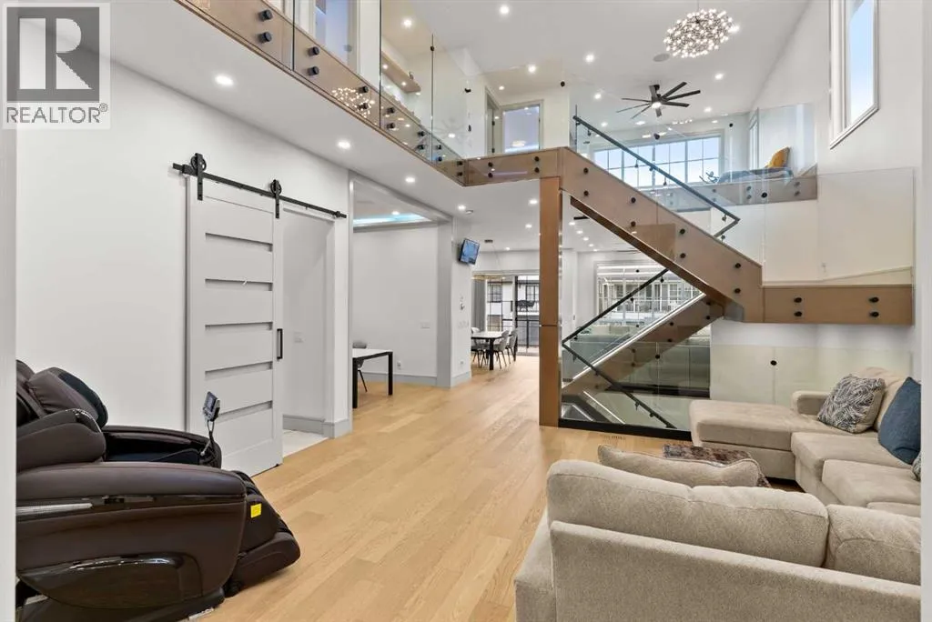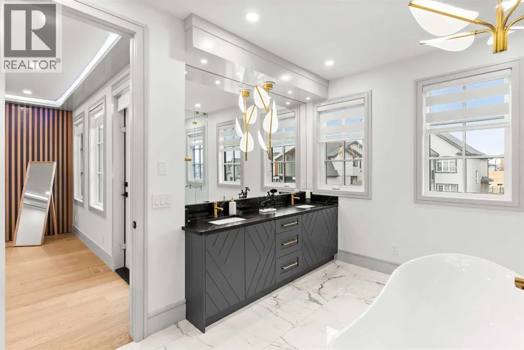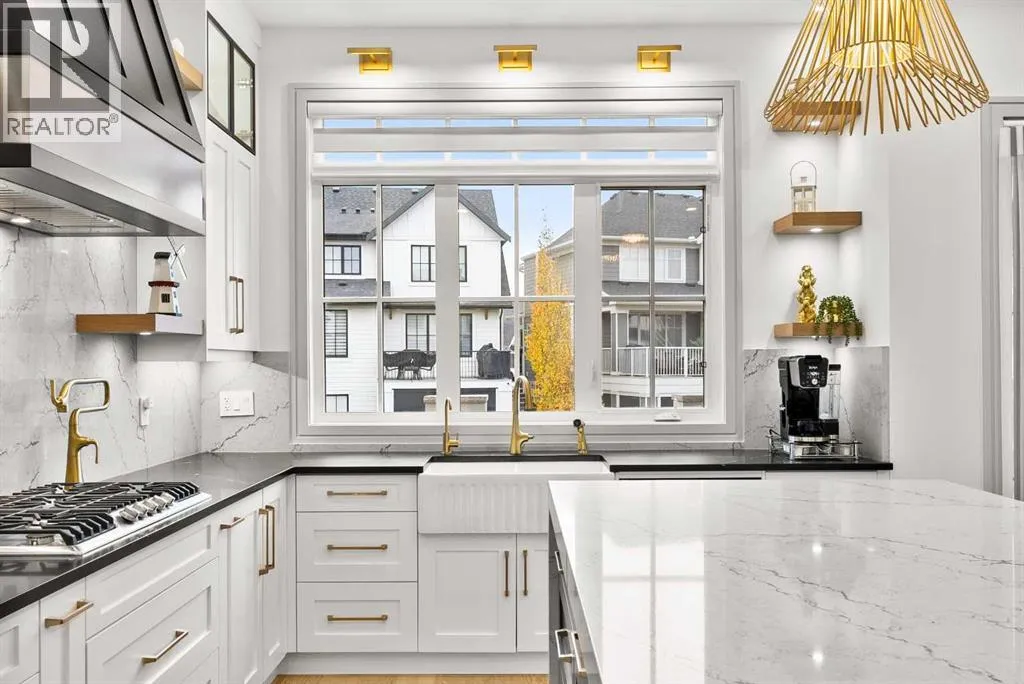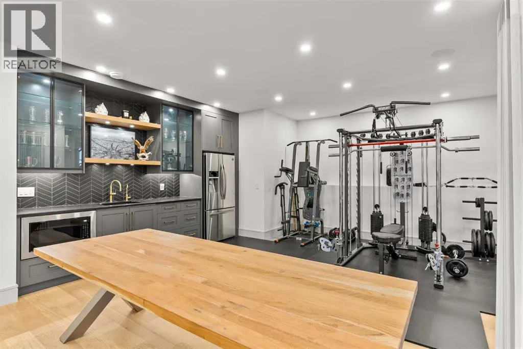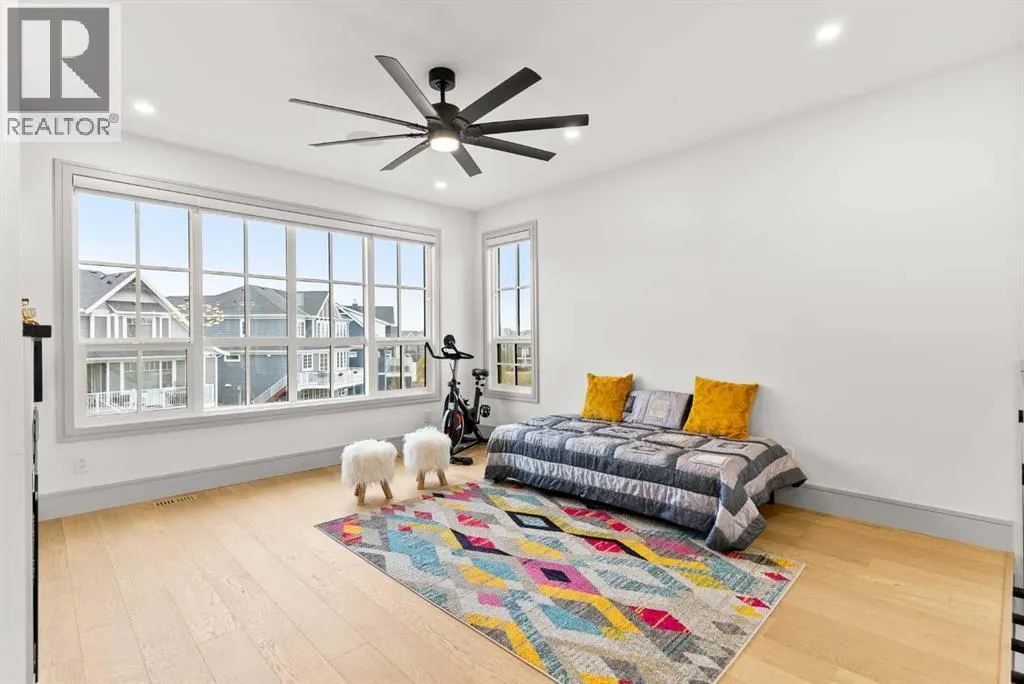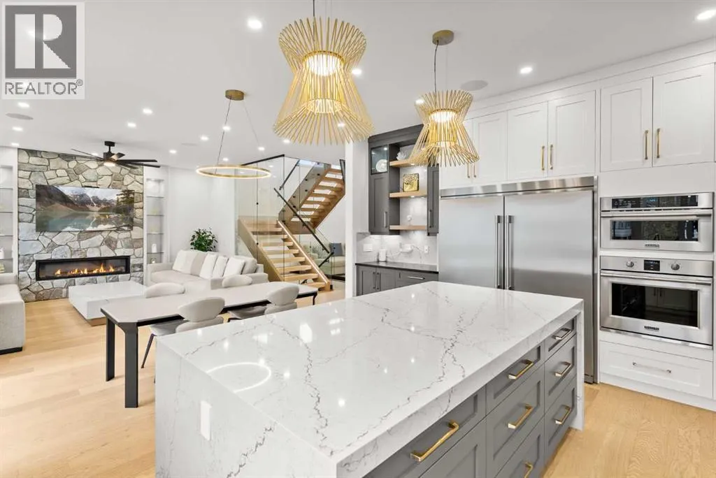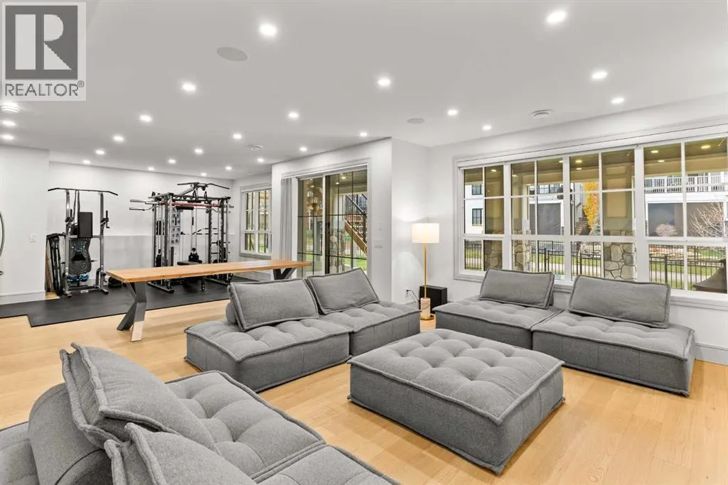 Welcome to 1473 Coopers Landing SW, an extraordinary residence backing onto a serene pond and pathway. This architectural gem boasts a total of impressive 5,528 square feet of thoughtfully designed living space, exemplifying the height of luxury. As you enter, youâre greeted by grand 10' ceilings on the main floor, featuring a sleek, modern flat paint finish. The main level flows seamlessly, including a Living Room, Formal Dining Room, Den/Office, Family Room, Nook, Main Kitchen, Spice Kitchen or Butlerâs Kitchen, and a Full Bath with a custom shower. A large low maintenance deck with plexiglass railings and stairs leading down to the backyard off the kitchen nook overlooks the numerous pathways and greenery that is a beautiful feature in Coopers Crossing. Daily life is made effortless with a convenient Mud Room and direct access to the garage. Ascending to the second floor on a one of a kind set of stairs, youâll find 9' ceilings and a versatile bonus room, ideal for a media space or home office. Four spacious bedrooms await, each with its own bathroom and walk-in closet. The luxurious custom ceiling perimeter with RGB LED lighting adds a touch of elegance. Donât overlook the intriguing Unfinished Hidden Room, a perfect canvas for your creative vision.The basement is an entertainer's dream, featuring a Rec Room, Nook, Gym, Wet Bar, and two additional bedrooms with their own full baths. A second laundry area adds to the convenience, ensuring that every need is met.Craftsmanship is unparalleled throughout, highlighted by upgraded plumbing fixtures from MOEN ALIGN in a beautiful brushed gold finish. A robust boiler system provides continuous hot water, complemented by in-floor heating in the basement(2 zones) and a hot water circulation pump for instant access at every faucet.The oversized triple tandem garage is thoughtfully roughed in for a gas heater and car charger, with hot and cold water facilities for added convenience. Outdoor elegance shines through with custom timber sourced from Revelstoke, BC, featuring a stunning timber-framed front porch and PARGOLA above the garage. The beautifully landscaped grounds include an exposed aggregate driveway, porch patio, and entry stairs.Technology is seamlessly integrated, featuring a wired security system, cameras, LCD screens, Eufy Smart Lock, dual-camera doorbell, and a speaker system throughout the home, ensuring security and entertainment are paramount.Experience warmth and sophistication with the 120â Electric Fireplace in the basement, the contemporary 60â Linear Gas Fireplace on the main floor, and the serene 72â Electric Fireplace in the bonus room. Every detail of this home reflects a commitment to comfort and luxury.Donât miss the chance to experience the epitome of luxury living in Coopers Crossing in Airdrie. Too many upgrades to list!!!. Schedule your private viewing todayâthis isnât just a house; itâs an extraordinary lifestyle. (id:27476)