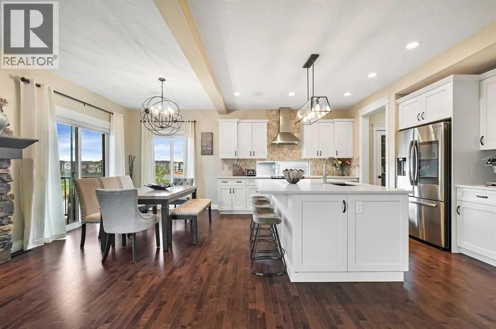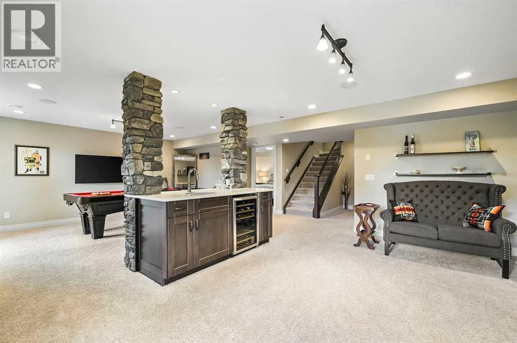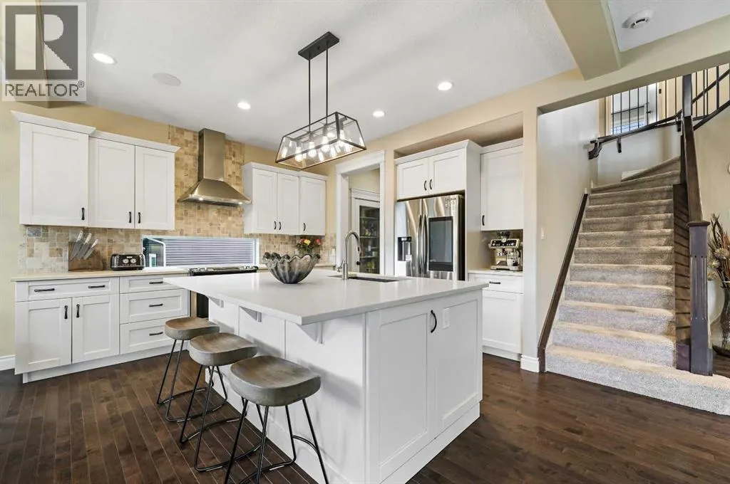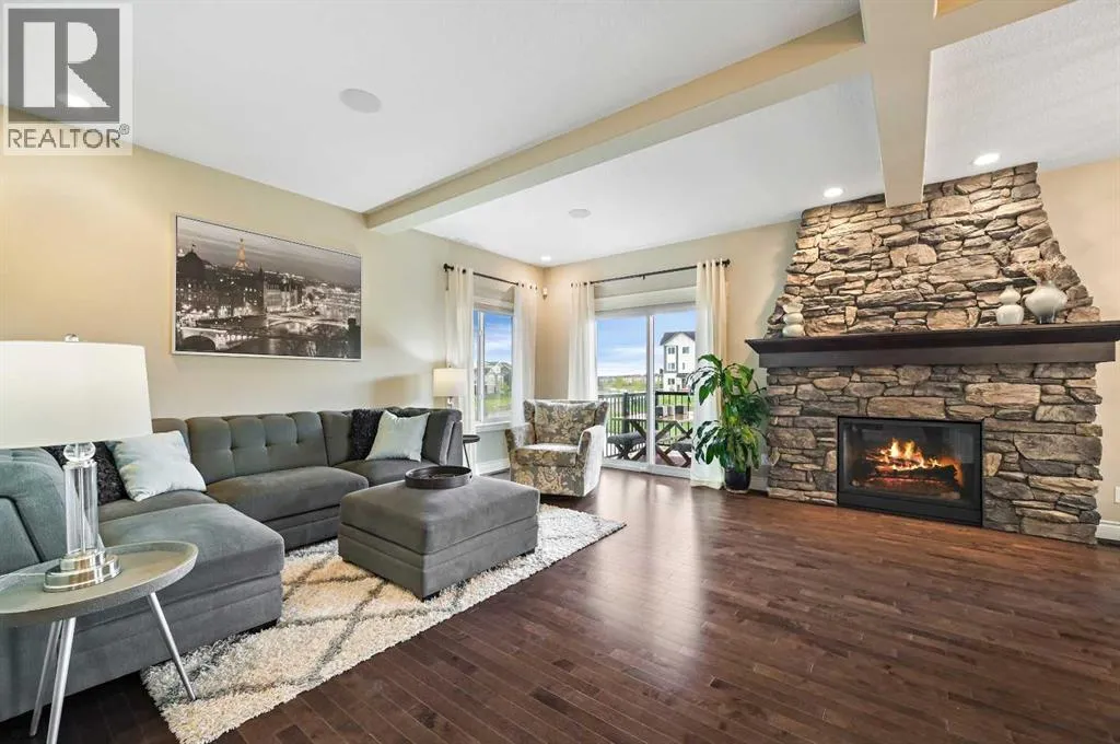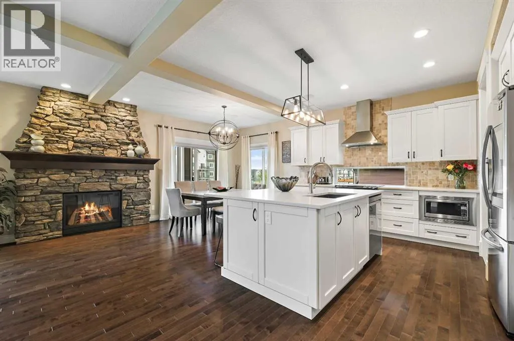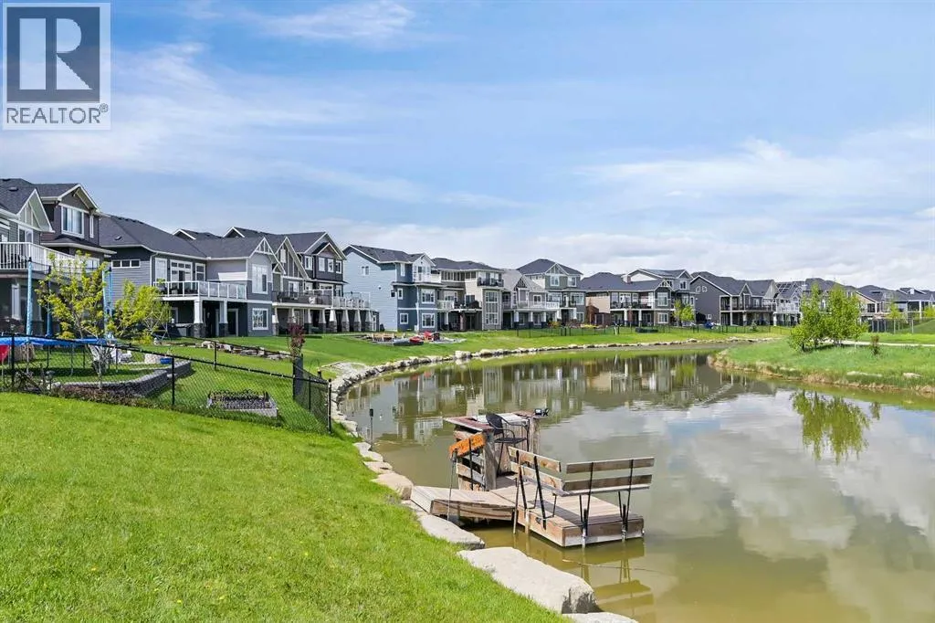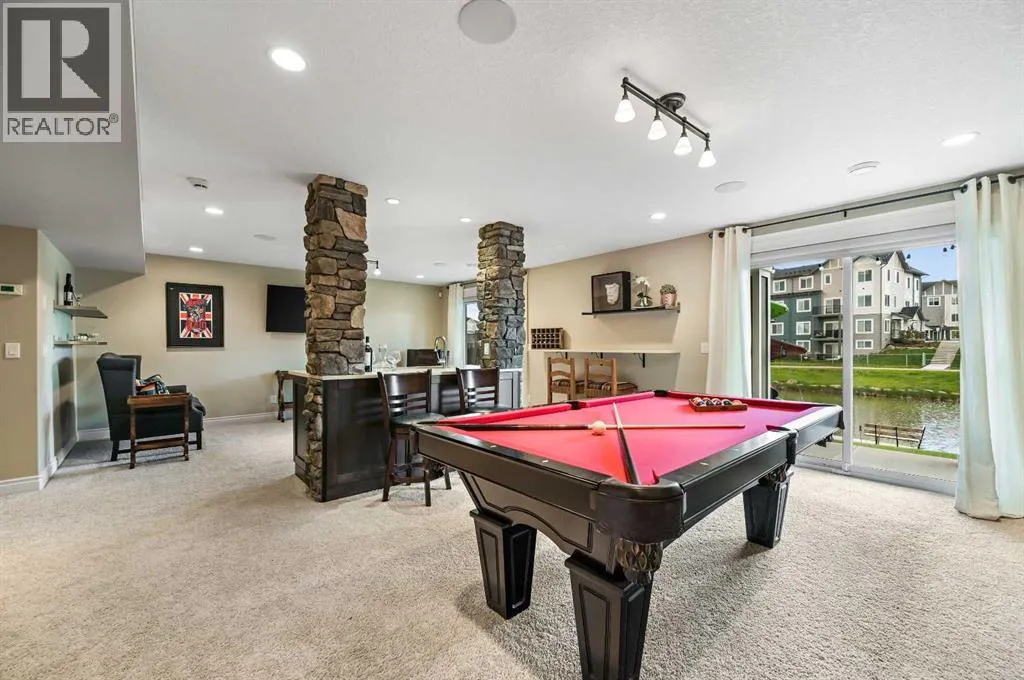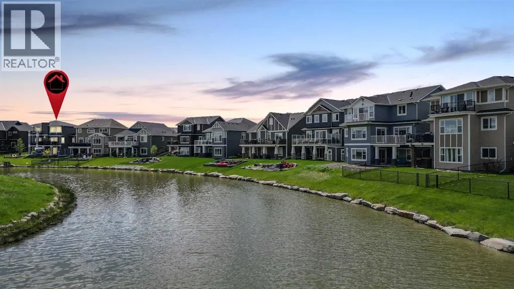 Welcome to this WATERFRONT luxury home on an oversized 7290 sq ft lot in Bayside Estates that offers a lifestyle like no other in Airdrie. With incredible craftsmanship & arguably Airdrie's best location backing onto the Bayside Estates canal with it's own private dock to offer fishing, kayaking, skating & it's a former McKee showhome! The main floor is thoughtfully designed with an open concept layout & hardwood throughout that perfectly complements the large bright windows which fill the room with tons of natural sunlight. The living room hosts a floor to ceiling stone gas fireplace feature, modern built in shelving/cabinetry and this flows seamlessly into the dining room (with a view of the canal) & an upgraded kitchen that rocks white cabinetry, stainless steel appliances (wifi enabled fridge is new!) & beautiful quartz countertops. The main floor also has a large office, a garage entryway with built-in seating/storage, a half bathroom & a large balcony with two sets of sliding doors to step out & enjoy the view because this one is 10/10 if you are searching for waterfront living in Airdrie! The upstairs greets you with a large bonus room with a built-in desk on the side & adjacent you'll be pleased with the spacious primary bedroom retreat overlooking the canal including a private primary bedroom balcony that provides epic sunsets & views of the canal! The spa-like ensuite bathroom with a deep soaker tub, dual sink vanity & a tiled shower includes the walk-in closet with custom built-in closet shelving. The spacious 2nd and 3rd upstairs bedrooms are conveniently located next to the 2nd full bathroom which is adjacent to the upstairs laundry room. The walkout basement with two more sets of sliding doors hosts a large family room with a pool table area & a custom bar with a wine fridge perfect for movie nights, as an exercise space & entertaining. Adjacent you'll find the 4th bedroom that has a unique space finished underneath the stairs that is perfect as a chil dren's playroom & another full bathroom. The mechanical in this home is excellent with a full built in media system including built in speakers throughout the home, Sonos & a boiler system to offer in-floor heat throughout the basement. Since it was a former show home the garage is completely finished with in-floor heat, light fixtures, ceiling texture, built in speakers & a back bay perfect for parking motorcycles, bikes or as a workshop space. Once the sun sets you'll be pleased to enjoy another upgraded feature of this property by turning on the Gemstone Brand architectural outdoor lighting. Location is the most important rule in real estate & this property knocks it out of the park with an extra wide lot backing the water that you will rarely find in Bayside - As a bonus there are also underground sprinklers! This home is the definition of a home that shows 10/10 and it must be viewed to fully appreciate its incredible craftsmanship & the waterfront lifestyle offered. (id:27476)