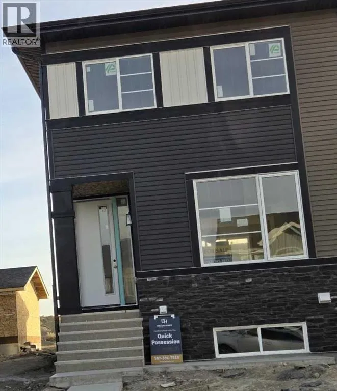 END UNIT, SIDE ENTRY TO BASEMENT. THIS HOME IS UNDER CONSTRUCTION, APPROX. 30-45 DAYS TO COMPLETION. DOUBLE DETACHED GARAGE, DECK, FENCED AND LANDSCAPED, NO CONDO FEES. PICTURES ARE OF SAME MODEL, NOT SUBJECT PROPERTY. Welcome to the "St. Andrews" townhome, by Award winning, Master Builder, Douglas Homes Ltd. From the front covered porch, the entry opens onto the spacious great room with 9ft ceiling and gleaming hardwood floors throughout the main floor. The aspiring chef will appreciate the well planned "island" kitchen. From the upgraded 42 inch, soft close cabinets, to the gorgeous quartz countertops, everything is within easy reach. The sparkling stainless steel fridge, the glass top, self cleaning electric range, dishwasher, and over the range microwave/hoodfan are all just an arms length from the kitchen sink. Opposite side of the island, provides a convenient pantry, and desk with upper cabinet for all those recipe books you will collect. The spacious dining area features a large picture window looking out upon the back yard with room for the kids to play, with a rear entry door to the deck for those summer bbq's. Here also is a 2pc powder room for your guests convenience, and perhaps the kids hurried need. Upstairs includes 2 good sized secondary bedrooms, a 4pce bathroom with quartz vanity and tile floors, a convenient upstairs laundry, and a spacious primary bedroom with large upsized window and ensuite bath, with walk in shower, with glass front, tile floor and again a quartz vanity. The full basement provides rough in plumbing for a future bath, one window for future bedroom, and enough space remaining for a spacious future family room if you decide your family needs room to spread. All this in the desirable new subdivision Cobblestone Creek, with tennis courts, playgrounds, future school reserve, pathways and numerous green spaces, on the western edge of Airdrie, with wide open country side, and views to the west.Directions: (id:27476)