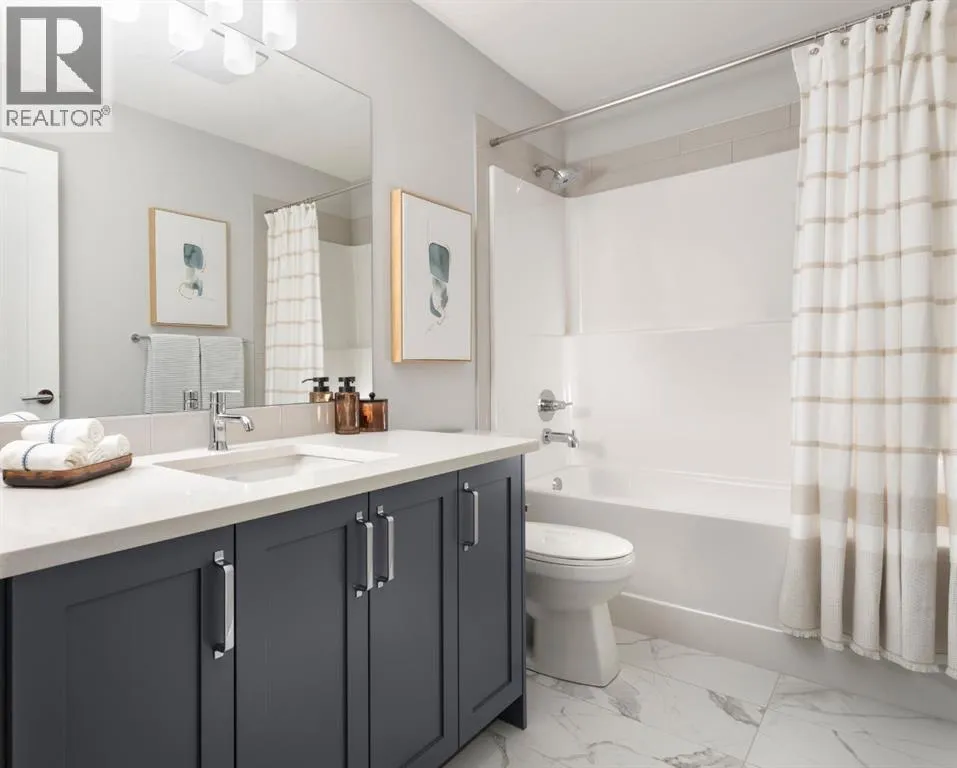 The BILD Calgary 2023 Award-winning 3-storey Village Townhomes showcase state of the art modern living with a hint of classic architecture. These homes offer homeowners all the premium home features such as spacious open layouts with 9-foot ceilings on the main floor, as well as a 3-bedroom plan with 2.5 bathrooms and a flex room. An elegant gourmet kitchen, with upgraded stainless steel appliances and a spacious center quartz countertop island, featuring a double basin stainless steel sink with a sleek pull-out vegetable sprayer. While you will find a convenient powder room on the main floor, a deluxe primary suite awaits with 2 additional bedrooms, a 4 piece main bath and a practical laundry room on the upper level. The large rear deck with a second deck off the living room will surely impress. The home includes a double-car garage and even 2 extra spots on the full-length driveway. These homes come with designer landscaped yards, with no maintenance required. (id:27476)