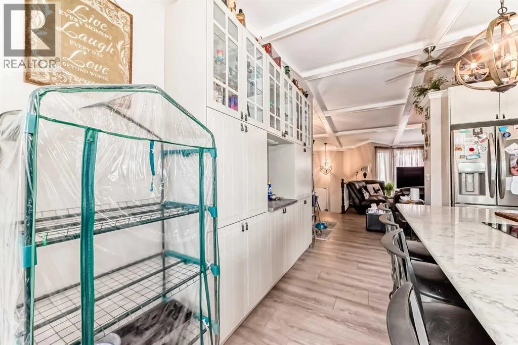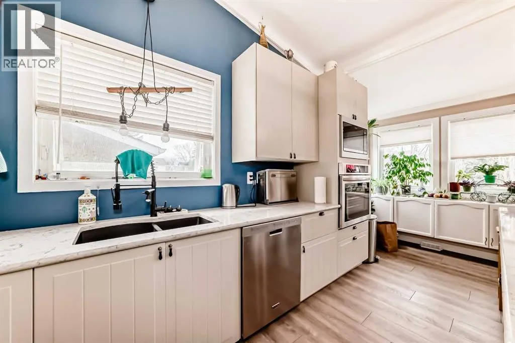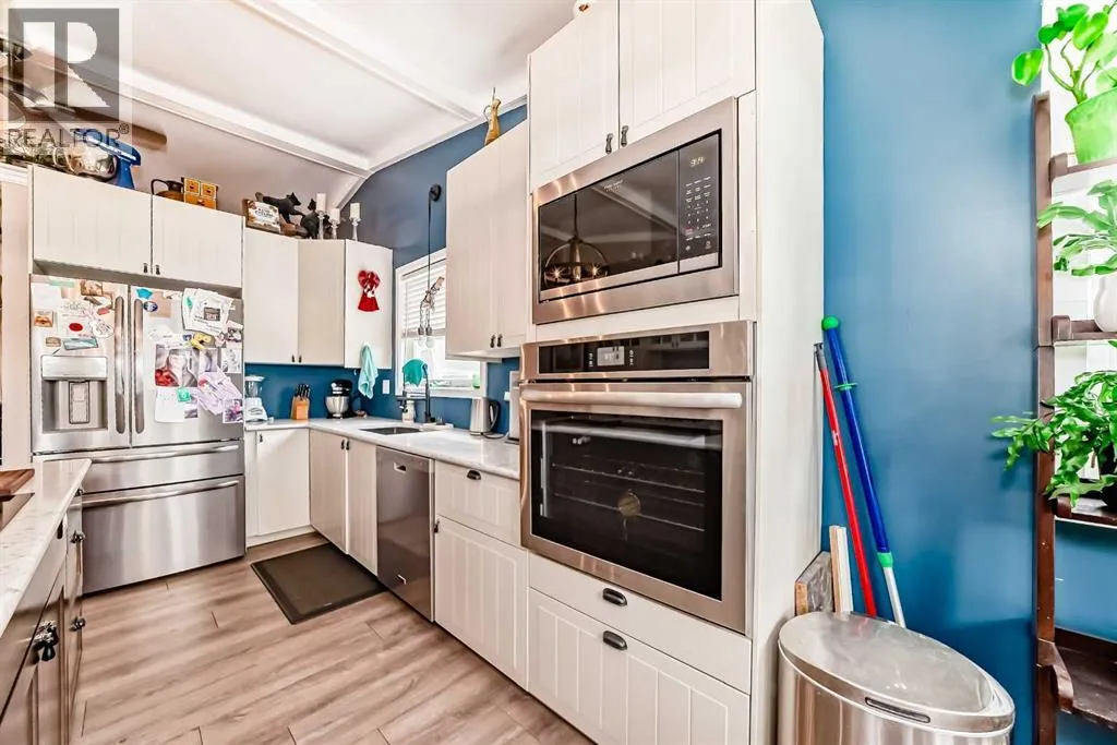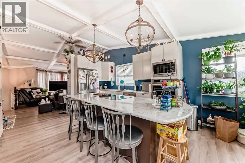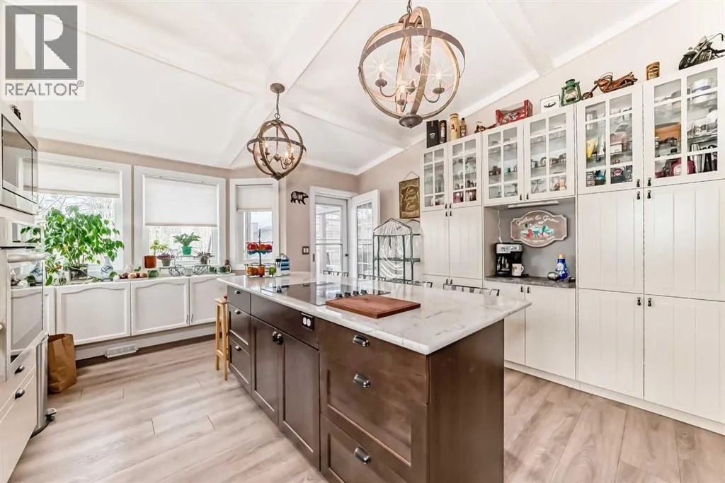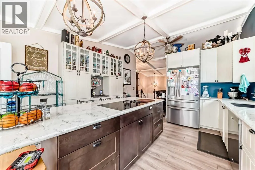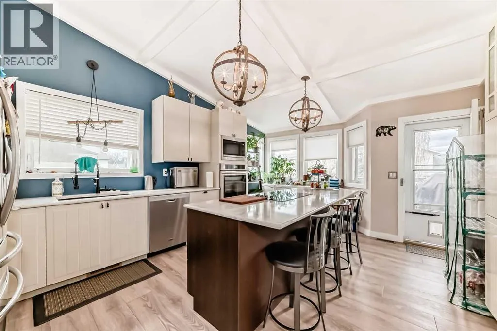 Welcome to this updated home offering a perfect blend of modern upgrades & timeless charm! Step inside to wonderful vaulted ceilings, complemented by a cozy wood-burning fireplace with gas log lighter (cleaned in 2024). The main floor boasts luxury vinyl plank flooring, leading to a completely renovated kitchen featuring two-tone cabinets, quartz countertops, a massive 82â island, built-in coffee bar/pantry, upgraded appliances, & an under-mount sink with upgraded faucet. The spacious master bedroom includes a huge walk-in closet & 3 piece ensuite, while the good sized second bedroom, currently used as an office, offers versatility for your needs. The fully finished basement adds even more space with a large family room, 2 additional bedrooms with big windows & a 3rd full bathroom. Major upgrades include Poly B plumbing removal, a new furnace & 50 gallon hot water tank (2020), & a garage door, opener/remotes (2024). The garage has upgraded wiring with extra plugs & lights. Enjoy outdoor living with a huge deck off the kitchen, built-in benches, a pergola, interlocking brick sidewalks, patio, & underground irrigation in the front yard. This move-in ready home is fully fenced & landscaped, providing both style & functionality. Donât miss your chance to make this home your own. (id:27476)