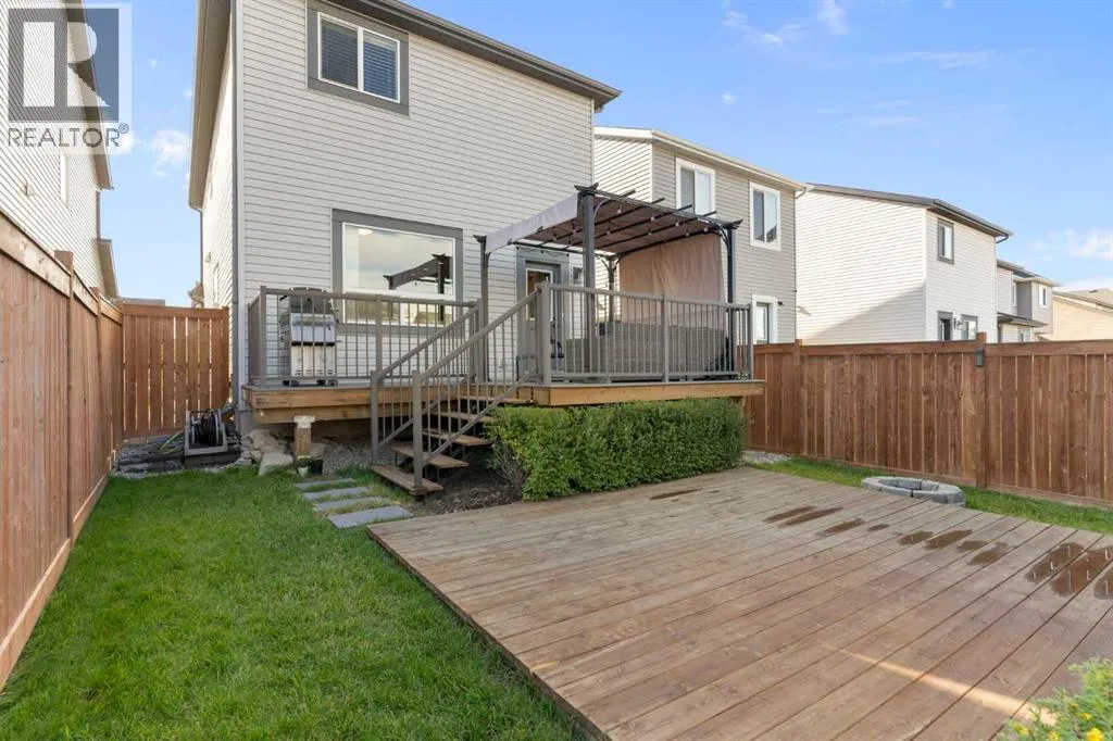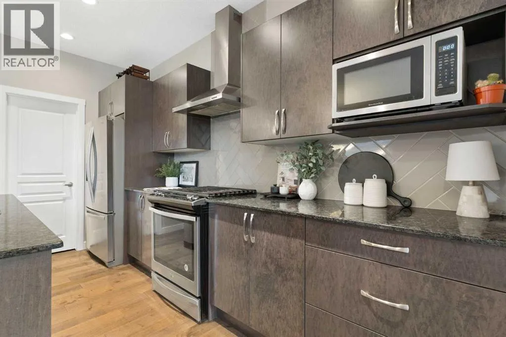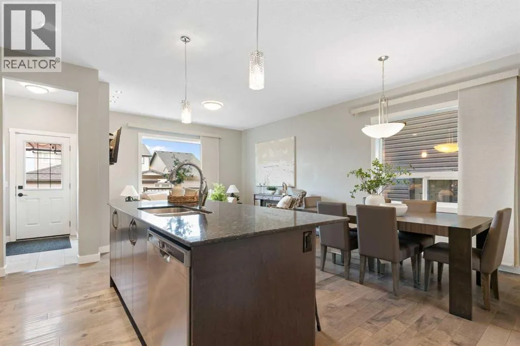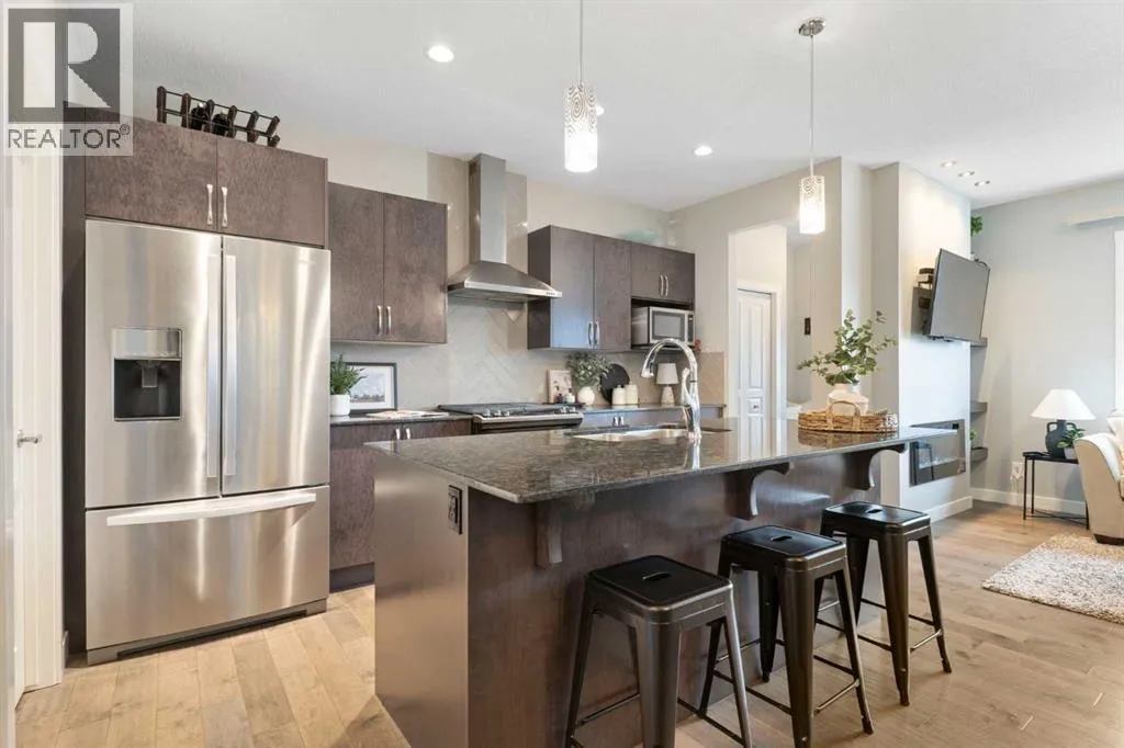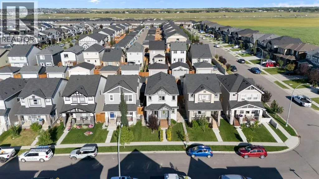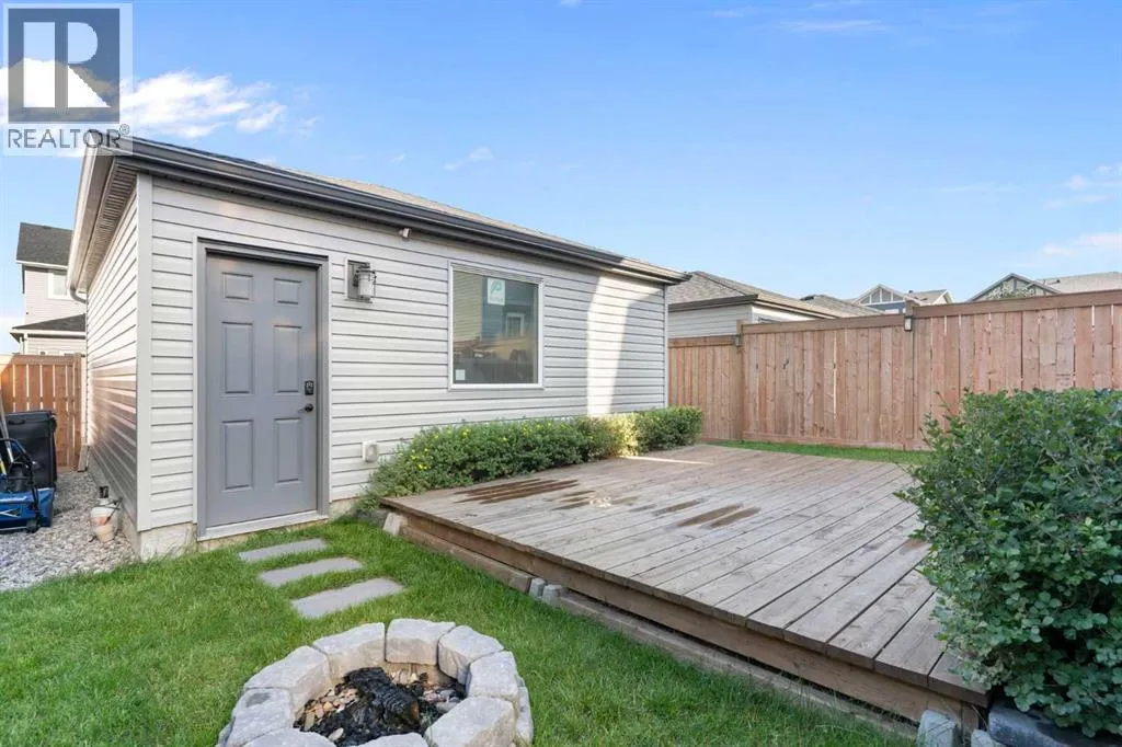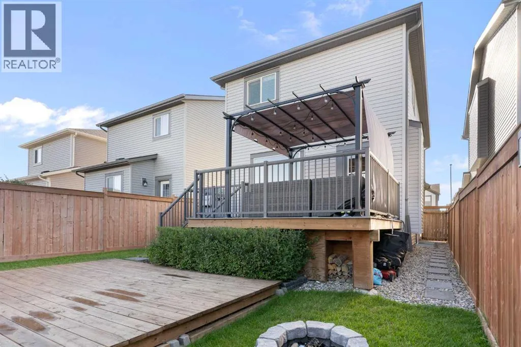 Hello Gorgeous! Welcome to Hillcrest! This custom detached home is beautifully designed with thoughtful upgrades across all three levels, offering over 2,300 sq. ft. of fully developed living space. From the moment you step inside, youâll notice the attention to detail that makes this property both stylish and functional. The main floor spans over 805 sq. ft. and features engineered hardwood flooring, with tile in the bathroom for durability. A private office with glass French doors is perfect for working from home, while the living room is anchored by a sleek electric fireplace for cozy evenings. The kitchen will impress with granite countertops, a gas range, stainless steel hood fan, fridge, and dishwasherâblending elegance and practicality for everyday cooking or entertaining. Upstairs, youâll find three generously sized bedrooms each offer spacious walk-in closets, while the bathrooms boast tile flooring, granite countertops, and an upgraded main bath complete with an extended soaker tub and glass shower, plus upgraded carpet throughout. A convenient second-floor laundry room, equipped with a brand-new Samsung washer and dryer, makes everyday chores a breeze. The fully developed basement adds another 711 sq. ft. of versatile living. Finished with laminate flooring, it includes a built-in bookstand, electric fireplace, and a wired entertainment area ready for your home theater setup. A large office space, plus a full secondary kitchen with quartz countertops, microwave, and fridge, expand your options for hosting or multi-generational living. The basement also includes a spacious closet, ample storage, and a full bathroom finished in tile. Outside, enjoy both a composite rear deck and a lower wood deck overlooking the green space, complete with a fire pit for outdoor gatherings. The extended garage provides excellent storage and easily accommodates two large SUVs or trucks. This property combines custom craftsmanship, modern finishes, and flexible living spacesâm aking it an incredible place to call home. Hillcrest is a fantasic family-friendly community - this home is surrounded by walking paths, parks, playgrounds, and stunning mountain views. Everyday conveniences are just minutes away with schools, shops, dining, and quick access to Calgary all within easy reach. Hillcrest combines modern amenities with small-town charm, making it the perfect place to put down roots â book your showing today! (id:27476)