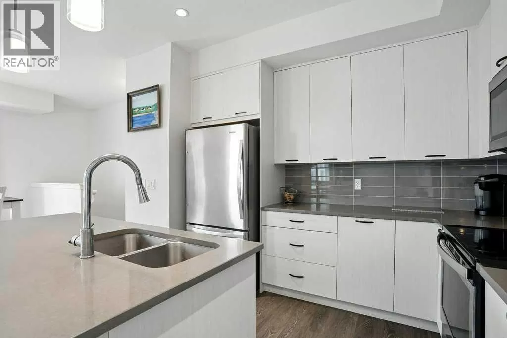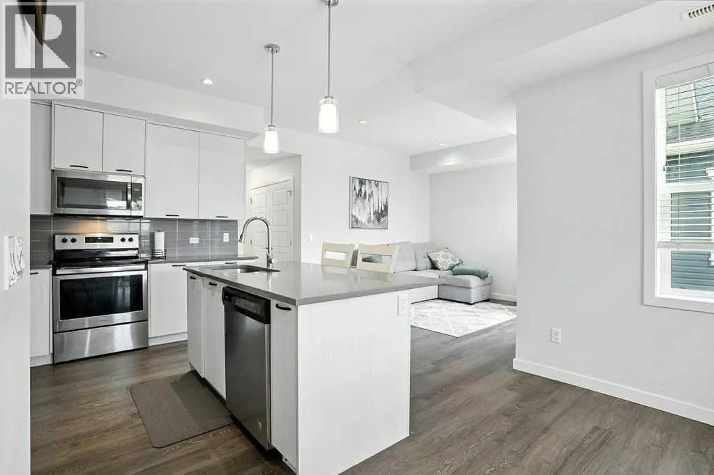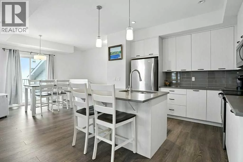 Welcome to this beautifully appointed 2-bedroom, 1-bathroom raised townhome in the vibrant community of the Canals. Offering a thoughtful layout with 9 ft knockdown ceilings and an abundance of natural light, this home feels open and inviting from the moment you step inside. The bright kitchen is designed with both style and function in mind, featuring quartz countertops, stainless steel appliances, ample cabinet space for storage, and modern pendant lighting over the island. The dining area is perfectly positioned beside large windows, creating a warm and welcoming space for everyday meals or entertaining guests. The spacious living and dining areas flow seamlessly onto a huge elevated deck, providing plenty of room for relaxing outdoors, enjoying summer barbecues, or simply taking in the fresh air. Both bedrooms are generously sized with easy access to the well-appointed 4-piece bathroom. Additional highlights include laminate flooring throughout, a modern colour palette, and an overall design that blends comfort with convenience. The ground floor features a welcoming foyer and a single attached garage. Very well maintained condo complex, beautifully maintained grounds & landscaping and visitor parking throughout the complex. Located in one of Airdrieâs most sought-after communities, this property is within walking distance to schools, soccer fields, churches, and picturesque ponds. Whether youâre a first-time buyer, downsizing, or looking for a smart investment, this home offers excellent value in a prime location with easy access to amenities, parks, and pathways. Donât wait, call your favourite realtor and book a showing today! (id:27476)