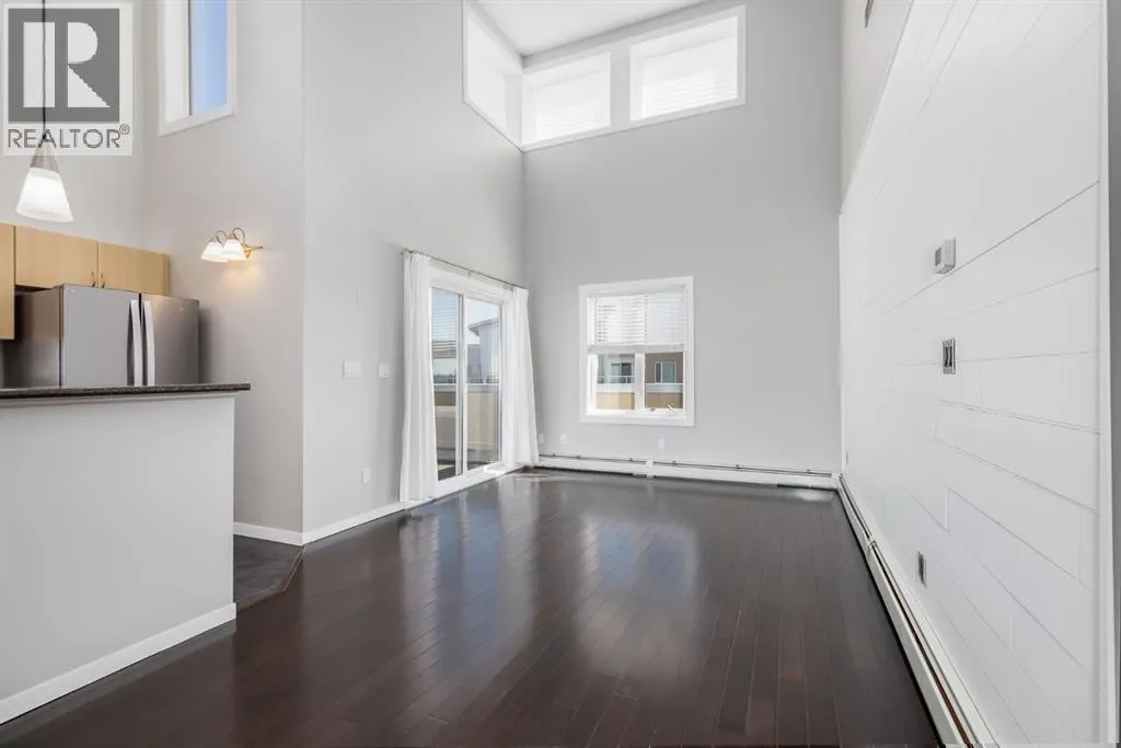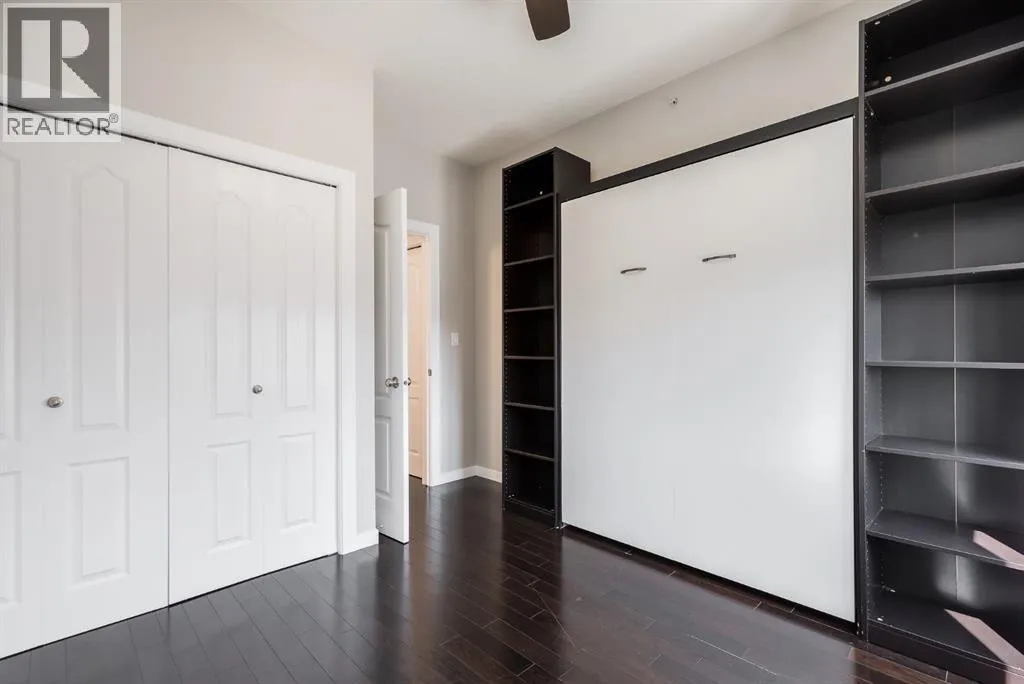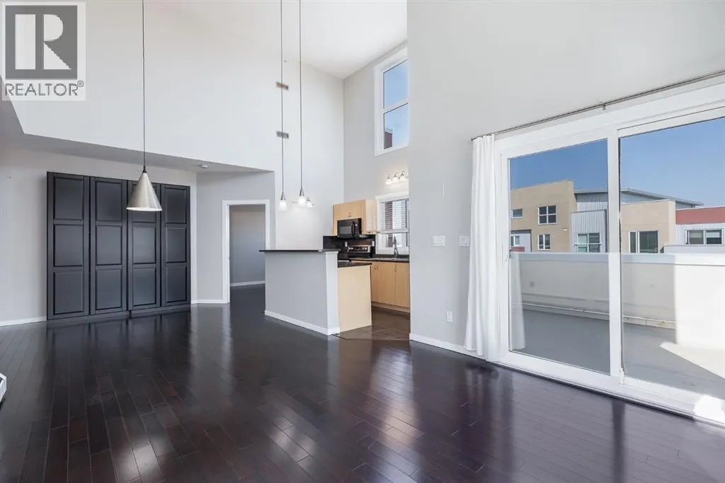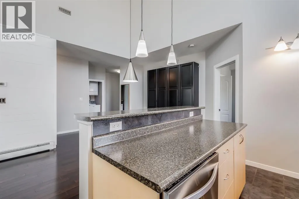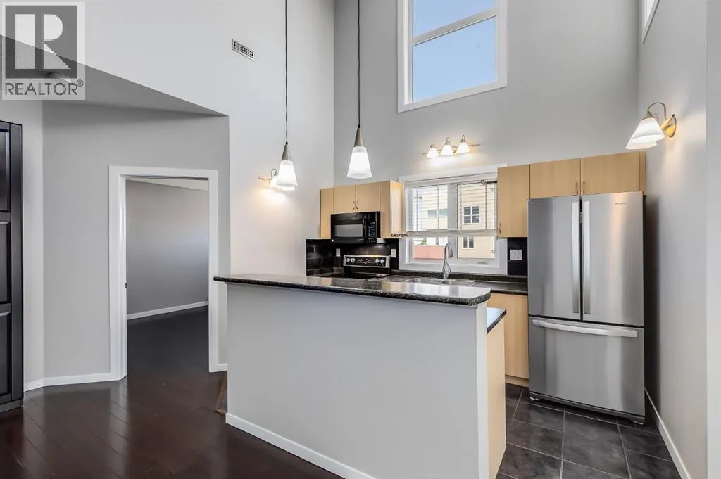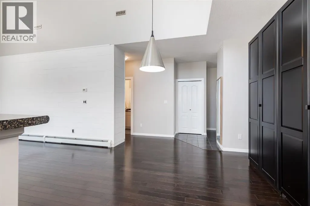 NEW PRICE NOV 3rd ** RARE OPPORTUNITY to own this Gorgeous Top Floor, Corner Unit with Soaring Cathedral Ceilings, Large Private Deck, and has an Underground Parking Stall. ** This Fantastic 2 Bedroom, 2 Bathroom Condo has 960 sqft of Amazing Living Space and is Ready for a QUICK POSSESSION. When you enter this Condo, you will immediately notice the Private Foyer that has a Large Storage Room off the entry. The HARDWOOD FLOORS welcome you to the Main area that has the EXPANSIVE 18' HIGH CATHEDRAL CEILING that allows lots of Natural Light from the Extra Windows. The Living Room has a great Shiplap Wall and Opens to the Oversized Deck that is private and has great space for your Patio Furniture. The Kitchen has a Large Island and Newer Stainless Steel Appliances, and opens to the Dining Area that has a Built in Wall Unit for extra storage. The Primary Bedroom is 14'1" x 11'3" and has a Walk through Closet to the 4 pc Ensuite. Bedroom 2 is 10'3" x 12'1", is located on the opposite end of the Condo and includes a Murphy Bed for your Guests with the 4 pc Main Bathroom steps away. There is also a Laundry Room. The Condo includes an Underground Parking Stall. This Great Complex is located beside Genesis Place which is perfect for Lifestyle Living if you are active and want swim, skate, work out in the Gym, or partake in the many classes provided. It is also close to Transportation, and Dining. Condo fees include all your utilities except electricity. Pets are allowed with Board Approval. (id:27476)