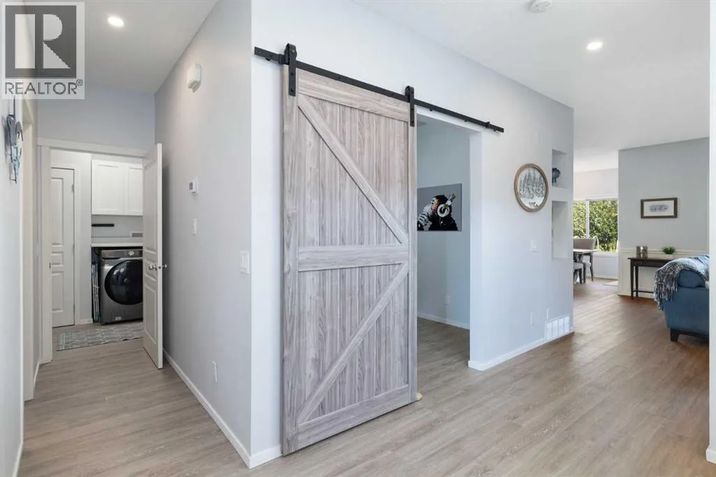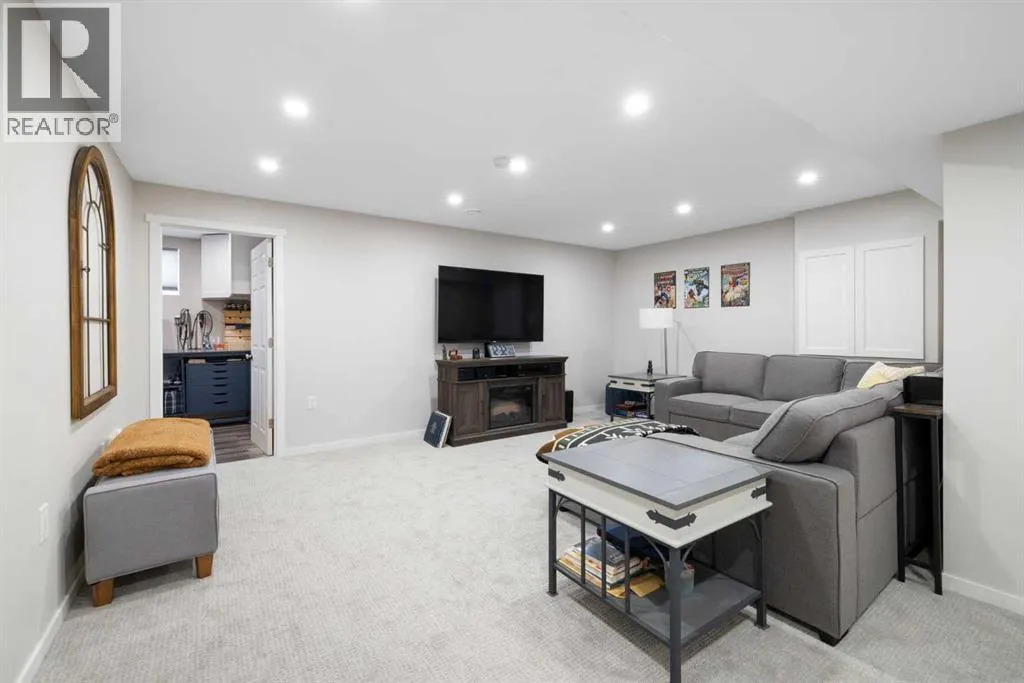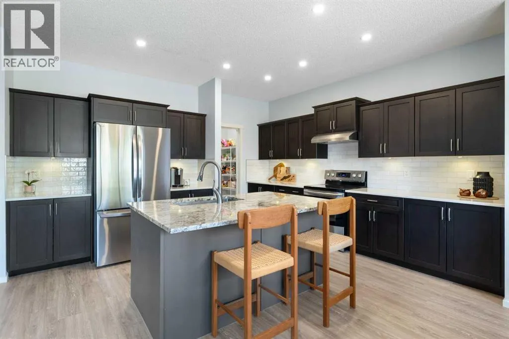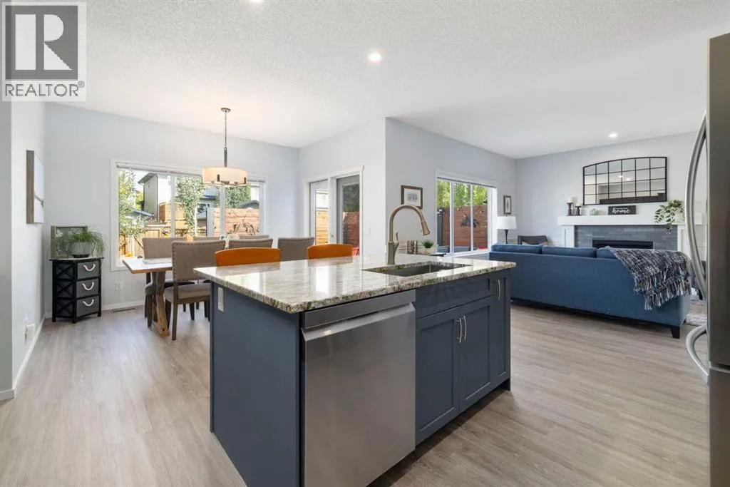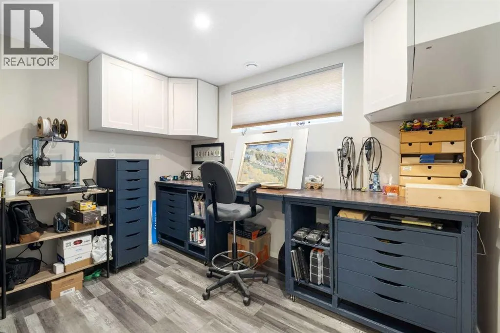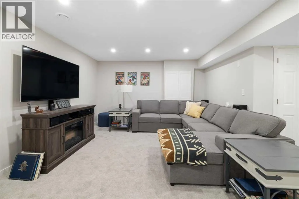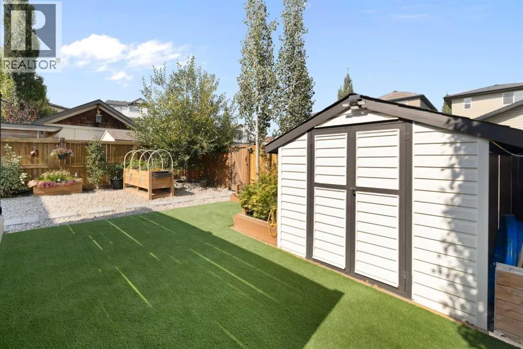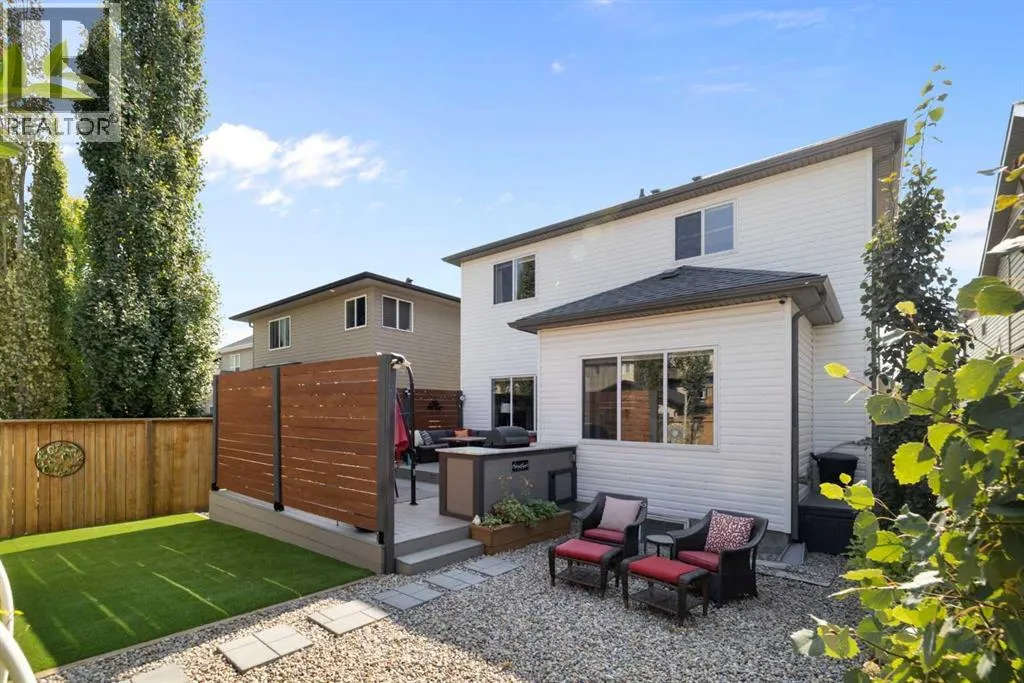 Welcoming and Well-Appointed family home, close to School, Parks, & Pathways. Step inside to a bright foyer with vinyl plank flooring, setting the tone for a home that balances comfort and function. The main floor offers a versatile office with a barn door, a stylish 2-piece bath with pocket door. Spacious great room features a gas fireplace with surround and mantle. The kitchen is designed for both cooking and gathering, with vinyl plank floors, granite counters, stainless steel appliances (including fridge with bottom freezer, electric stove, hood fan, and dishwasher), and a walk-through pantry that connects to the garage, laundry area with cabinets above the washer/dryer, and additional hallway storage. The adjoining breakfast nook boasts a large window overlooking the yard and opens through double doors onto the deck. The bonus room faces south, filled with natural light and is finished with vinyl plank flooring & ceiling fan. The primary suite includes carpet, ceiling fan, two walk-in closets, and a luxurious 5-piece ensuite with double vanity, soaker tub, and shower. Two additional bedrooms (both carpeted) share a 4-piece main bath with quartz counters and vinyl plank flooring. The lower level is fully developed (with permits) with a cozy family room (pot lighting, smooth ceiling, carpet), an additional bedroom, a full bathroom with shower and ceiling-high surround, plus a hobby area with built-in wall cabinets. Outdoors, the backyard is designed for easy enjoyment with artificial grass, a privacy-fenced deck, built-in BBQ with electrical hookup, water barrel, standalone planter, shed, and mature trees. Double Attached garage. The front of the home showcases a charming wood porch. Enjoy the the perfect location in this easy maintenance lifestyle in this move-in-ready home. (id:27476)