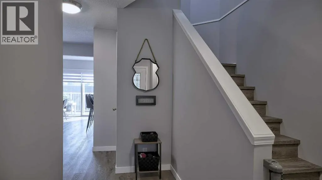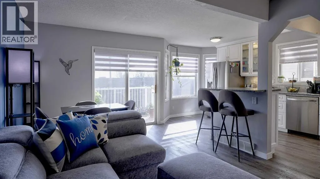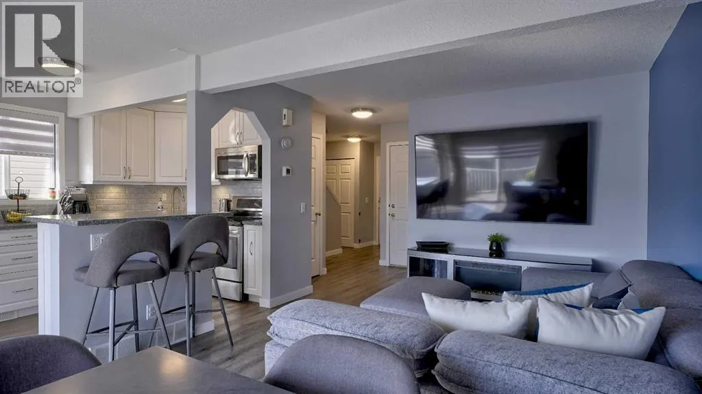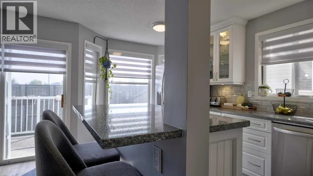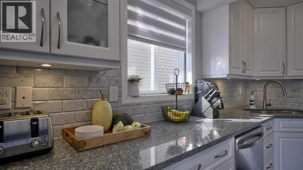 Truly a chefâs delight! Featuring sleek quartz countertops, gleaming white cabinetry, and an eat-up breakfast bar perfect for family gatherings. Open concept is seamless to the living room, with plenty of room for relaxing. As an end unit, youâll enjoy extra windows that flood the home with natural light. Entry way hosts the convenient half bath plus linen closet, and a jacket closet. Built in desk for your home office, at the top of the stairs. 2 spare bedrooms upstairs, one with extra high ceiling and would make a great bonus room! Primary bedroom is great size, with a double closet. The updated full bathroom boasts double sinks, dual mirrors, and modern finishes. Luxury vinyl plank throughout this home, and NO CARPET, for those with allergies. Versatile Rec room is a great size, or could be converted to another bedroom, if you need. Good sized windows in the lower level allow a ton of natural light in. 3 pce bath with your stand up shower. Plus, there's ample storage to keep everything organized. Custom window shutters on windows in this home. Single attached garage, plus parking pad out front. Visitor parking is conveniently located just steps away. Front and back deck are maintenance free for easy outdoor living. (id:27476)