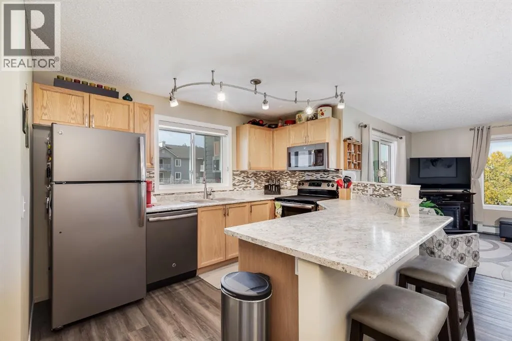 Rare Opportunity to own this CORNER CONDO with WRAP AROUND BALCONY that has its own STORAGE ROOM!!! Don't miss this Gorgeous Condo that exudes Pride of Ownership! This Beautiful Condo offers Extra Windows that are Brand New throughout, Newer Luxury Vinyl Plank Flooring, Kitchen Updates, and more. When you arrive you will notice the Foyer Entrance that allows plenty of space to Welcome your Guests, and the Laminate Flooring making this a No Carpet Home. The Living Room is bathed in light from the Oversized Window and Balcony access with Gorgeous views of the Greenspace. The Kitchen has been updated with Stainless Steel Appliances, an Open Island that provides extra Counterspace and Island Seating, Lovely Cabinetry, and an Extra Window over the Sink for more natural light. The Dining area can host a Larger Table. The Primary Bedroom is 11'3" x 14'1 and can hold a King Bed. The Walk through Closet leads to the 3 Pc Ensuite with a Shower Stall. The 2nd Bedroom is 10'10" x 10'3" and is close to the 4 pc Main Bathroom. The Condo also has a Storage Room inside the Unit, In-Suite Laundry and the MASSIVE 20'4" x 11'4" Wrap Around Balcony with its own Storage Room making it a bonus to have your extra items so closeby. The Parking Stall #19 is right outside the Bldg 2000 door for extra convenience. The CONDO FEES INCLUDE ALL UTILITIES. This Complex is well Managed. No Dogs Permitted. Close to Shopping, Grocery, Dining, Transportation, and is easy to access facilities like the New Library. Make sure to see this Beautiful Home... You will be impressed. (id:27476)