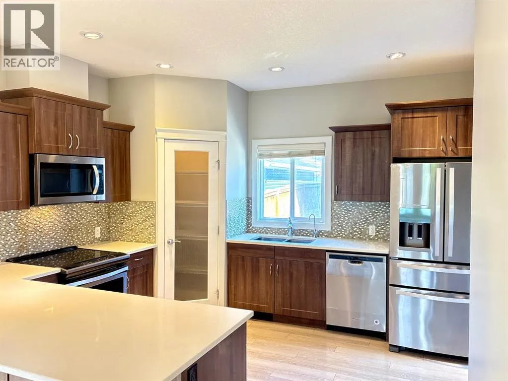 Welcome to this wonderful family home in the friendly community of Ravenswood, ideally located just across the street from Heloise Lorimer School and only minutes from major shopping. From the moment you enter, a spacious foyer opens to an inviting main floor where the bright living room fills with natural light and flows into a comfortable dining area and a beautiful kitchen featuring a large island and corner pantry. Itâs the perfect setting for everyday living and family gatherings plus half bathroom. Upstairs offers three bedrooms, including a cozy master retreat with its own full ensuite and walk-in closet, along with two perfectly sized bedrooms, another full bathroom, and the convenience of upper-floor laundry. The finished basement expands your living space with a warm family room, an additional bedroom, and another full bathroom, providing plenty of room for everyone. Step outside to enjoy a sunny deck for summer evenings and a double garage for added comfort and ease. This home truly combines warmth, space, and locationâan ideal place for your family to grow. (id:27476)