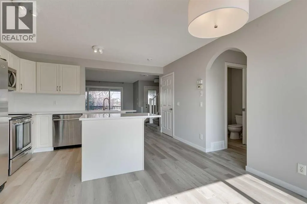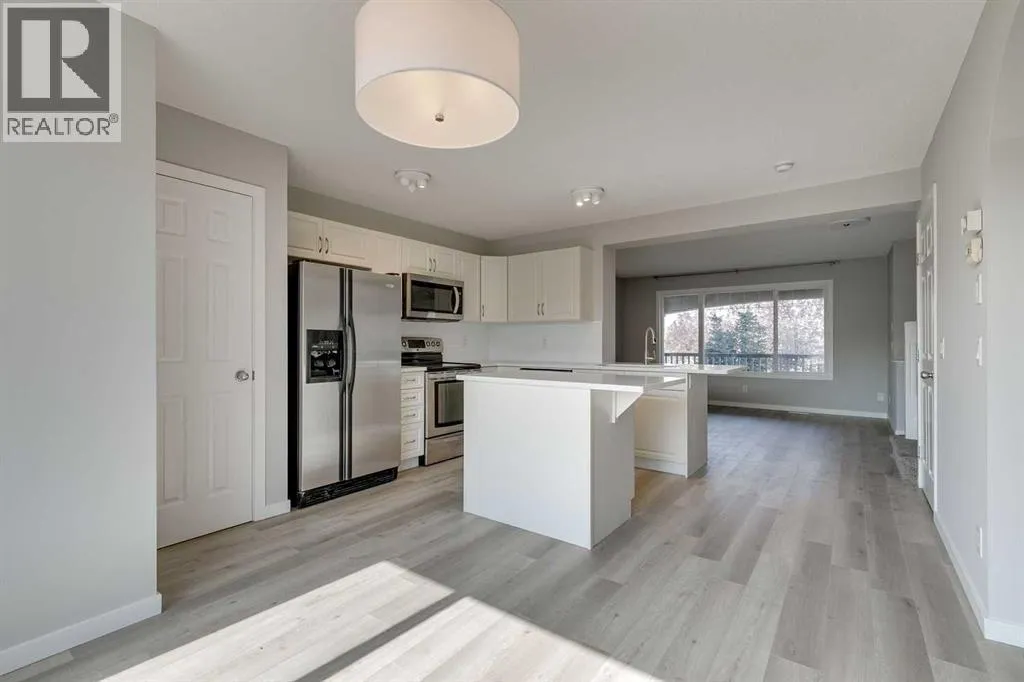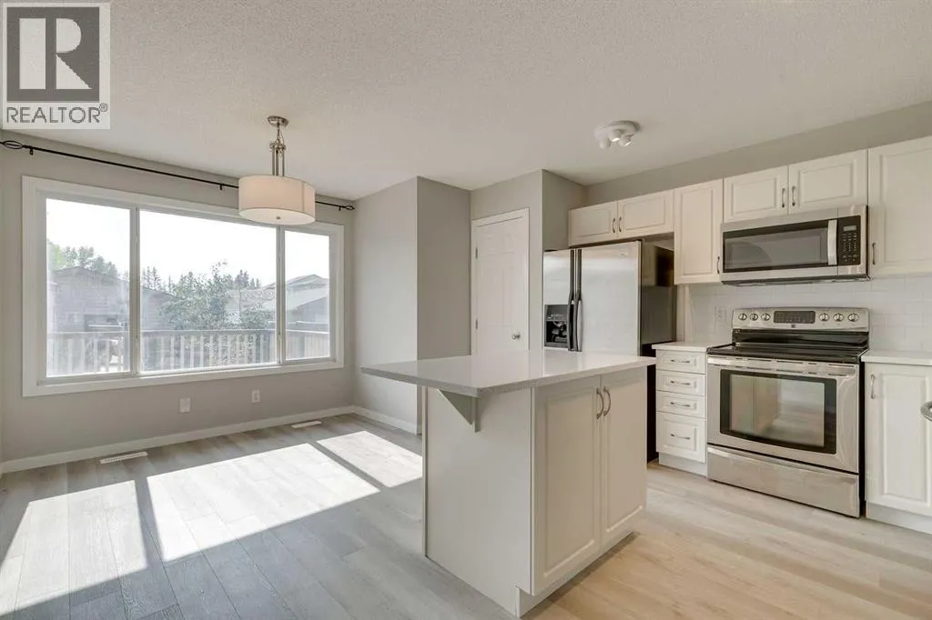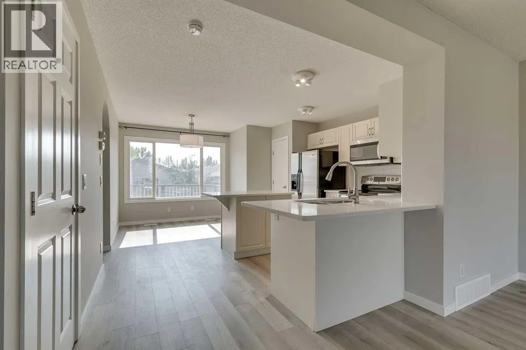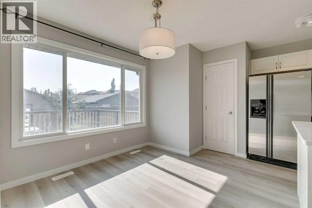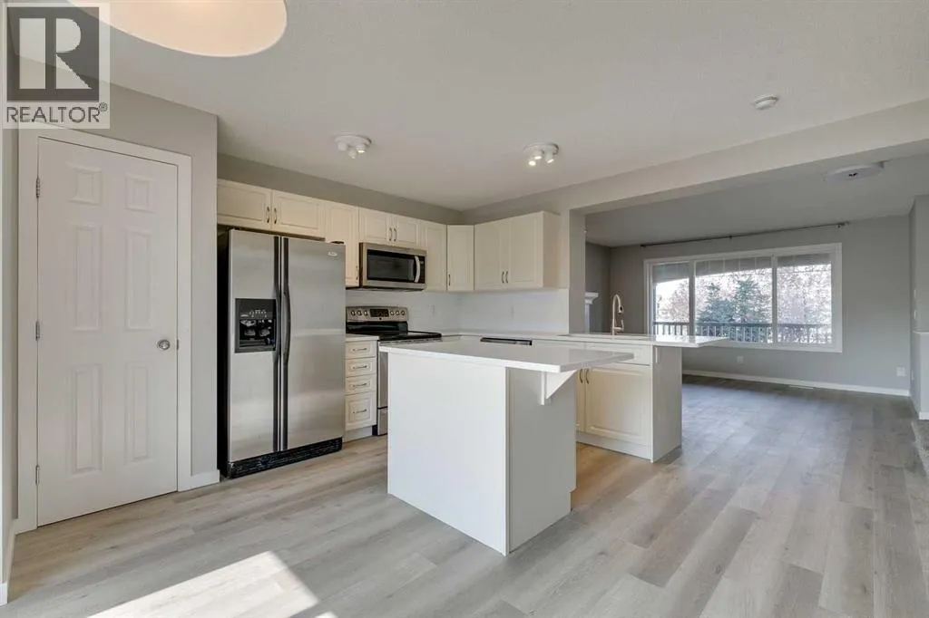 Acroos from a park and close to schools! Welcome to this charming 2-storey in Airdrieâs beloved Reunion community, where everyday comforts meet thoughtful updates. A classic front porch sets the scene for morning coffees or evening lounging, while inside sunlight pours through large windows into the living room, anchored by a cozy gas fireplace. The kitchen is the true heart of the homeâquartz counters gleam against beautiful cream coloured cabinetry, and stainless steel appliances stand ready for your next culinary adventure. The island and breakfast bar offers the perfect perch for taste-testers and storytellers alike, with a sunny dining nook overlooking the south-facing backyard. Upstairs, three inviting bedrooms await, including a serene primary suite with its own private ensuite, while the additional bedrooms share a bright, well-appointed bath. The newly developed fully finished basement extends your living space with a spacious family room, a fourth bedroom, and a full bathâideal for guests, teens, or cozy movie nights. Recent upgrades include new vinyl plank flooring, designer lighting, fresh paint, and a newly built double detached garage. (id:27476)
