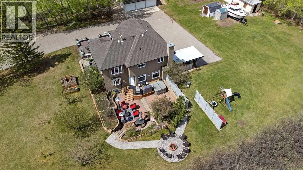Welcome to Airdrie - country living with city convenience. As you arrive, youâll be greeted by a stunning two-story home on 3.2 acres within city limits. The property includes a triple detached garage, providing ample space for your vehicles and hobbies, in addition to the double attached garage for everyday convenience. Inside, the main floor features a traditional layout, including a formal living room and dining room. The heart of this home is undoubtedly the custom kitchen, adorned with solid wood cabinets, granite countertops, and top-of-the-line stainless steel appliances. A walk-in pantry ensures you have plenty of storage. Enjoy your morning coffee in the cozy breakfast nook, overlooking the gorgeous backyard. Adjacent to the kitchen, a sunken living room invites you to unwind by the gas fireplace, creating a warm and inviting atmosphere. Off the living room is a home office that could also function as an additional bedroom, along with a convenient two-piece bathroom and a custom mudroom with a sink, situated just off the garage. Up the curved staircase with skylights above, youâll discover four bedrooms, including the primary bedroom with a walk-in closet and a separate wardrobe and hidden storage. The five-piece bathroom is shared for upstairs while you get your own personal ensuite with a corner shower and a jetted tub. The fully finished basement features a spacious entertainment rec room equipped with a wet bar and ample cabinet space. Itâs the perfect spot for family movie nights and hosting friends. Additionally, youâll find a well-appointed four-piece bathroom, a cold room, and a hobby room, plus a SEPERATE ENTRY COVERED WALK UP that gives the basement easy and private access. Now, letâs talk about the outdoor space. Your backyard is complete with a playground, fire pit area, and an entertainment zone where you can host barbecues and soak in your hot tub. The mature trees provide natural privacy, and thereâs plenty of storage for your RV, boats, and all your toys. Donât miss the opportunity to make this extraordinary property your forever home! (id:27476)