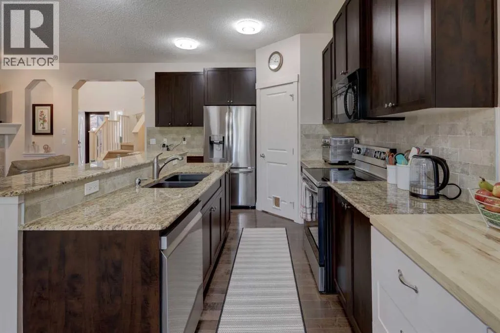This home is absolutely immaculate and nestled on a quiet crescent in the heart of King's Heights, close to schools, walking paths, pond and shopping! This charming 3 bedroom, 3 and a half bath, fully developed home offers the perfect blend of comfort, style and location! Freshly painted throughout the main living areas, the interior exudes a bright, clean and modern open plan that is functional and move in ready. Step inside to discover a spacious main floor, featuring hardwood floors, a bright and inviting living room with built in speakers, a corner gas fireplace and large windows all open to the island kitchen with breakfast bar and dining area with views to the rear yard. One of the "stand out" features of this home is the spacious 3 season sun room, providing additional living space and an ideal area to enjoy relaxing with your coffee in the morning, entertaining or dining throughout the warmer months. On the upper level, functionality is evident in the spacious and bright bonus room with a designated area perfect for a computer desk, homework or craft area. Down the hall from the bonus room, you will find, 2 bedrooms, a full 4 piece bathroom and the master bedroom with walk in closet, and 5 piece ensuite with separate vanities, shower and jetted soaker tub, it is a retreat that will not disappoint. The fully finished lower level, offers even more living space, featuring a massive recreation room with electric fireplace, built in storage, and a modern 3 piece bathroom. Pride of ownership is evident throughout this property, and you will enjoy peace of mind knowing the built in dishwasher, electric stove, washer and dryer were replaced in 2024 and the refrigerator in 2023 and note there is a gas outlet behind the current stove. A beautiful property sure to impress! (id:27476)