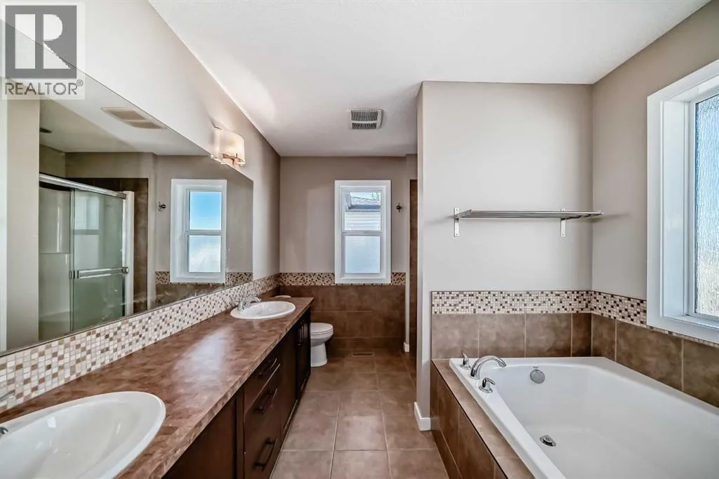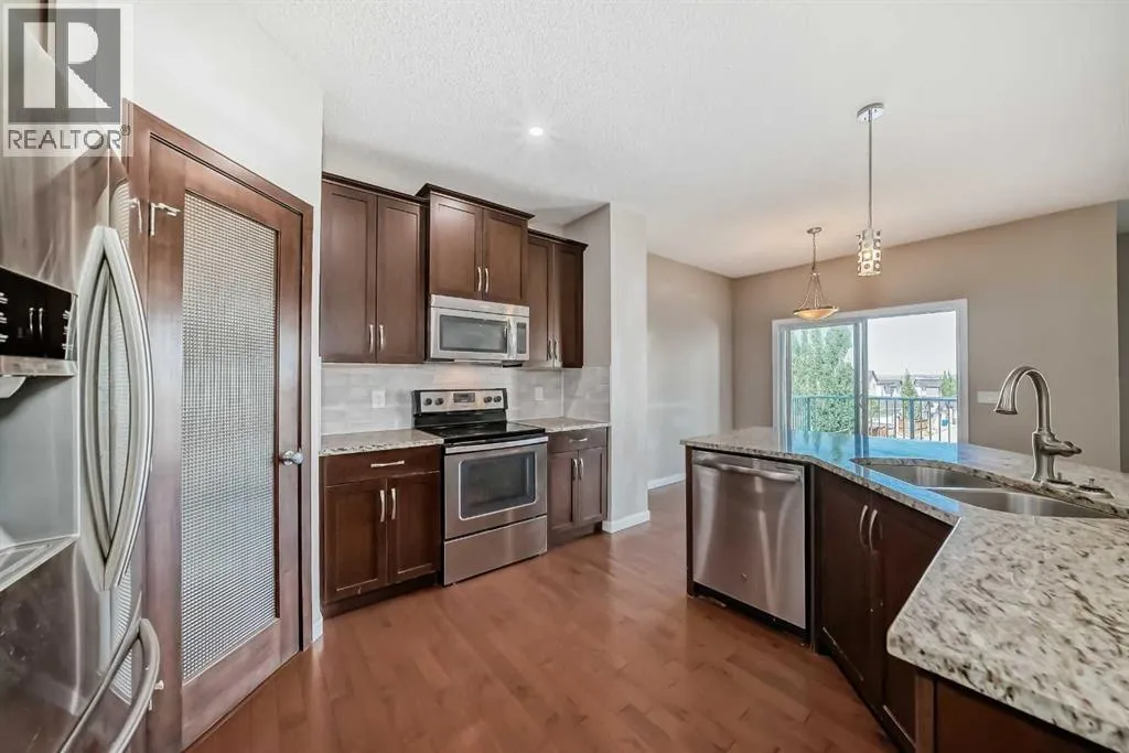 The One You've Been Waiting For in Reunion, AirdrieIf youâve been holding out for that perfect Airdrie home â your patience has finally paid off.Welcome to this beautifully finished walkout home in the sought-after, family-friendly community of Reunion. Nestled on a quiet, low-traffic street, just a short walk to Herons Crossing School, this property is ideal for families looking to settle into a vibrant, welcoming neighborhood filled with parks, playgrounds, and scenic walking paths.Step inside and be greeted by a grand entrance with soaring cathedral ceilings, setting the tone for the spacious, open-concept layout throughout the main floor. The chefâs kitchen features stainless steel appliances, granite countertops, a central island perfect for entertaining, and a convenient walk-through pantry that connects to the mudroom. The adjacent dining area opens to a raised deck with sweeping views â thanks to the homeâs elevated position â and stairs that lead to the fully fenced yard below.The cozy living room boasts large windows that flood the space with natural light and a fireplace framed with a rich wood mantle for those cozy evenings at home. A main floor office offers the perfect work-from-home setup, or could easily function as an additional bedroom.Upstairs, the bonus room provides a flexible space â ideal as a playroom, media room, or family lounge. The primary suite is a true retreat, complete with a custom wood feature wall, a walk-in closet, and a luxurious 5-piece ensuite featuring a deep soaker tub, dual vanities, and a stand-up shower. Two more generous bedrooms and a 4-piece bathroom round out the upper level.The fully finished walkout basement is bright and functional, with luxury vinyl plank flooring, a wet bar perfect for game days, and a large rec room with space for a home gym. The 4th bedroom (with rustic barn doors) and a spa-inspired 3-piece bath with heated floors make this the ultimate guest suite.Outside, enjoy the private lower patio, ideal for relaxing while the kids play in the yard. With back lane access, thereâs even room to park a trailer.Just minutes to shopping, schools, green spaces, and major routes â this is the one you donât want to miss. (id:27476)
