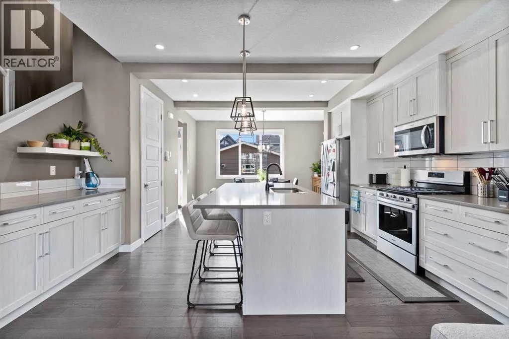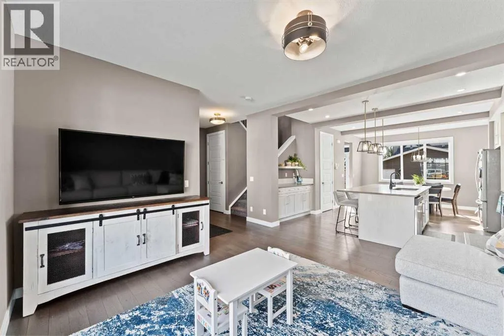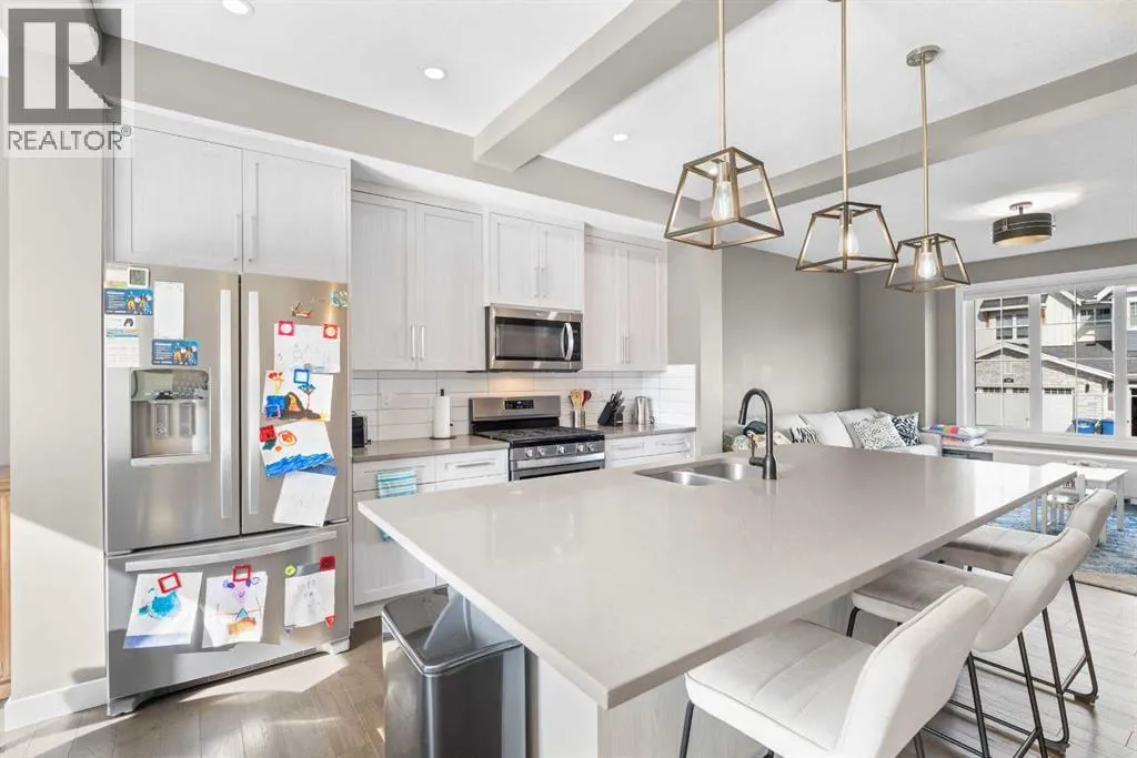 Welcome to this stunning, condo-free townhome located in the award-winning community of Coopers Crossing in Airdrie, AB. Built in 2019 by a respected local builder, this meticulously maintained home offers over 2,300 square feet of beautifully developed space and combines thoughtful design, quality craftsmanship, and premium upgrades throughout.Situated on a quiet, family-friendly street, this 4-bedroom home boasts remarkable curb appeal, a fully landscaped yard, and a rear detached double garage, providing both function and charm. Step inside to find an inviting open-concept main floor with central air conditioning, perfect for year-round comfort.The heart of the home is the chef-inspired kitchen, featuring upgraded stainless steel appliances, an oversized quartz island, custom cabinetry, and stylish fixturesâideal for entertaining or casual family living. Adjacent, the bright and spacious living and dining areas flow seamlessly, creating a welcoming atmosphere for gatherings.Upstairs, retreat to the luxurious primary suite, complete with a 4-piece ensuite featuring a walk-in shower, double vanity and toilet closet as well as a generous walk-in closet. Two additional bedrooms, a full bath, and a conveniently located laundry area complete the upper level.The fully developed basement includes a fourth bedroom, a spacious family or recreation room, and plenty of storageâoffering versatility for a guest suite, home office, or gym.Enjoy peace of mind knowing this property is move-in ready, with high-end finishes, well-maintained systems, and friendly, community-minded neighbors all around. Located within walking distance to parks, pathways, schools, and local amenities, and just minutes to all that Airdrie has to offer, this home truly combines comfort, location, and lifestyle.Key Features:Over 2,300 Sq Ft of Developed Living SpaceBuilt in 2019 by a Local BuilderCondo-Free, No Condo Fees4 Bedrooms | 3.5 BathroomsLarge Primary Bedroom with 4-Piece Ensuite & Wa lk-In ClosetCentral Air ConditioningUpgraded Appliances ThroughoutOversized Kitchen IslandFully Landscaped YardRear Detached Double Car GarageLocated on a Quiet Street in Coopers CrossingSurrounded by Wonderful NeighborsThis is a rare opportunity to own a high-quality home in one of Airdrieâs most sought-after neighborhoods. Donât miss your chanceâbook your private showing today! (id:27476)