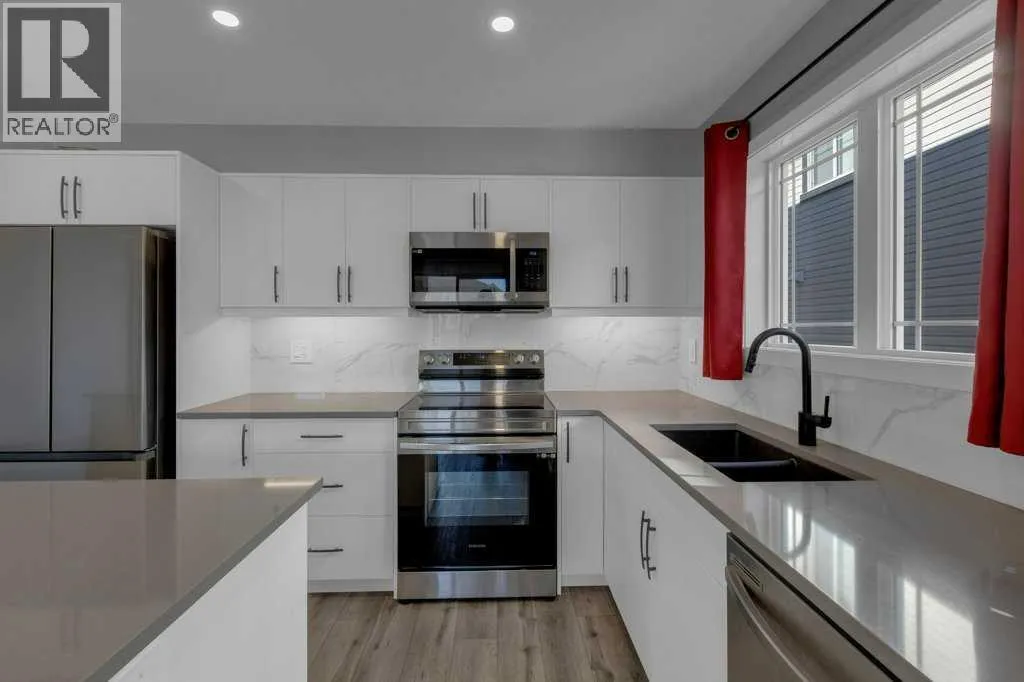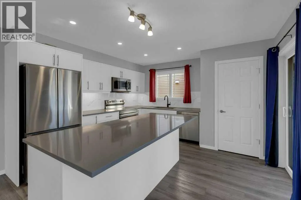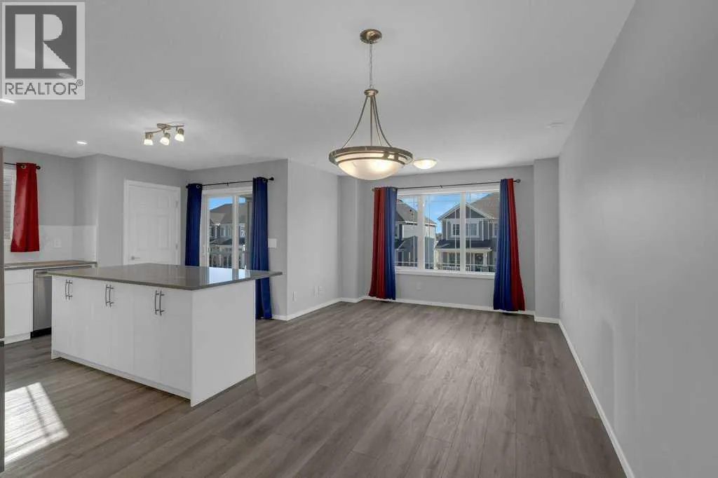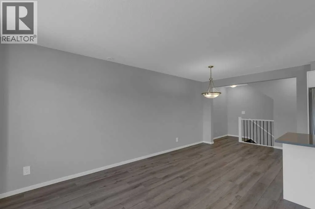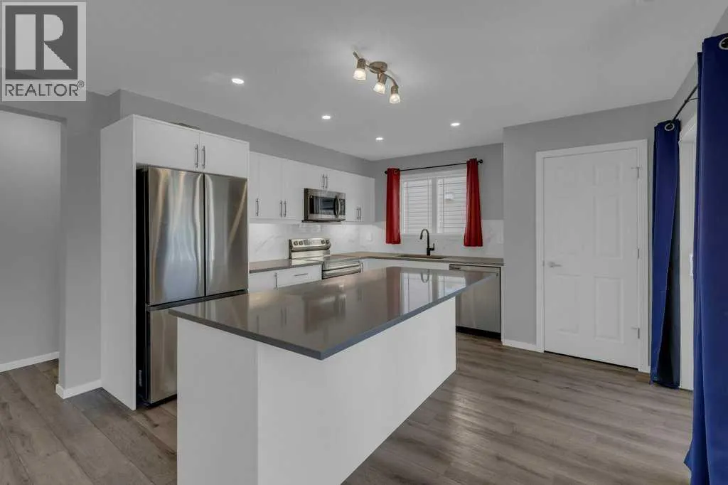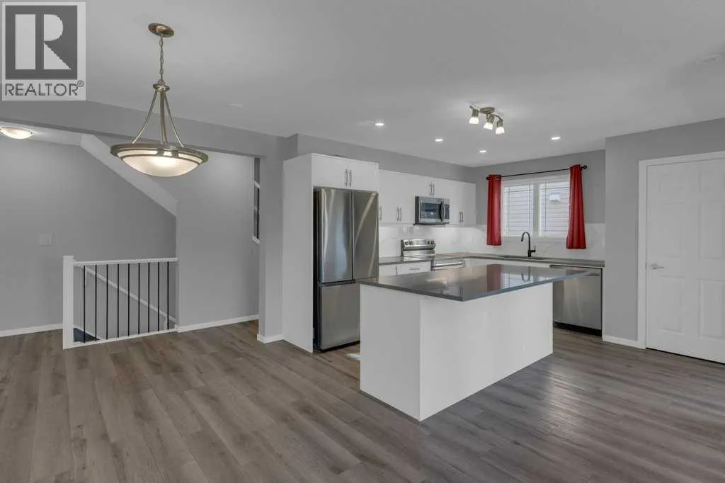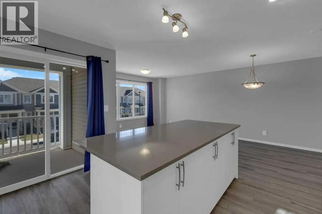 Modern End-Unit in Windsong!Set on a sunny corner in Windsong, this townhome blends contemporary finishes with a smart three-level layout and a single attached garage. Offering 3 bedrooms and 2.5 baths, and lots of living space, this home is move-in ready.The ground level welcomes you with a bright foyer and a large utility/storage room, and access to your own single attached garage. Upstairs on the second level, you will fall in love with the natural light that pours into the open, airy main floor, anchored by a sleek kitchen featuring quartz countertops and an oversized island with seating. A convenient 2-piece powder room sits nearby. Dine inside or step out from the dining area to a spacious southwest-facing balcony, perfect for evening sun. The generous living room easily accommodates a sectional and media setup, framed by big windows.On the top level, youâll find two comfortable bedrooms, a laundry room, and an upgraded 4-piece bath. The private primary suite includes a walk-in closet and its own 4-piece ensuite. Additional highlights include luxury vinyl plank flooring, upgraded finishes throughout, a single attached garage, and a small front yard, great for pets.The location checks every box: steps to playgrounds, pathways, and a pond, with shopping, restaurants, schools, transit, and parks close by. Commuters will appreciate quick access to Highway 2 and the short drive into Calgary. (id:27476)