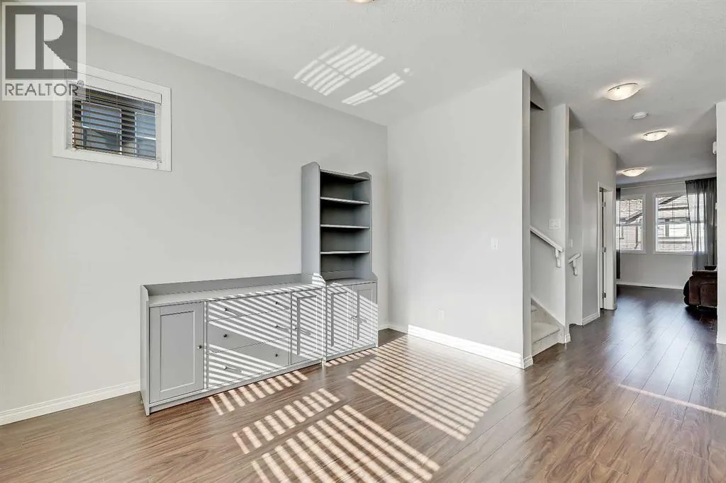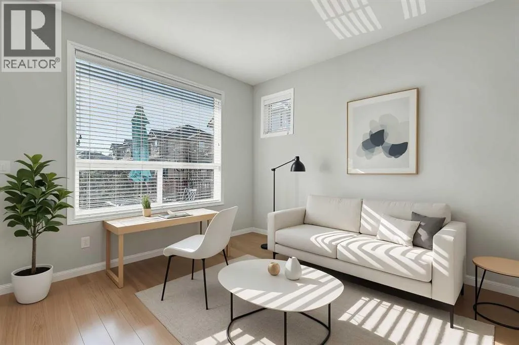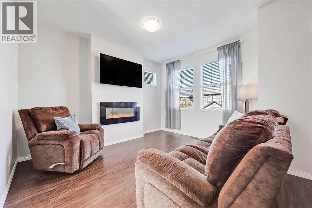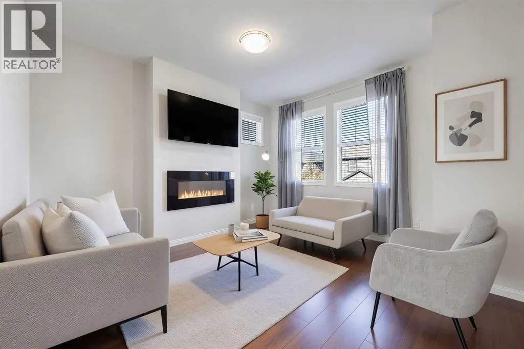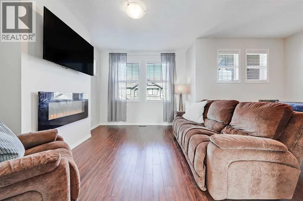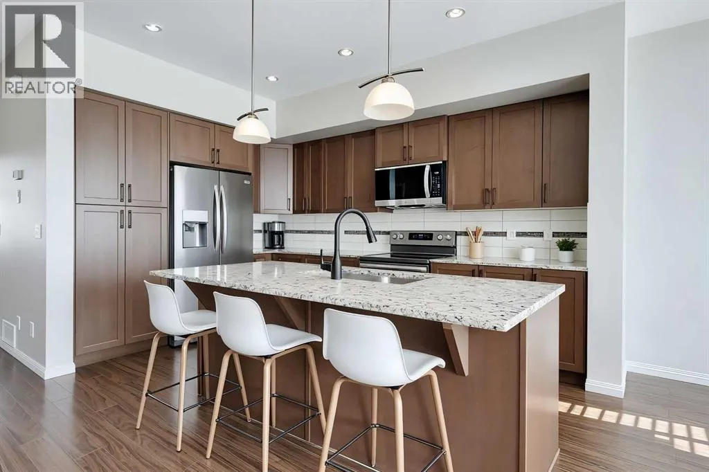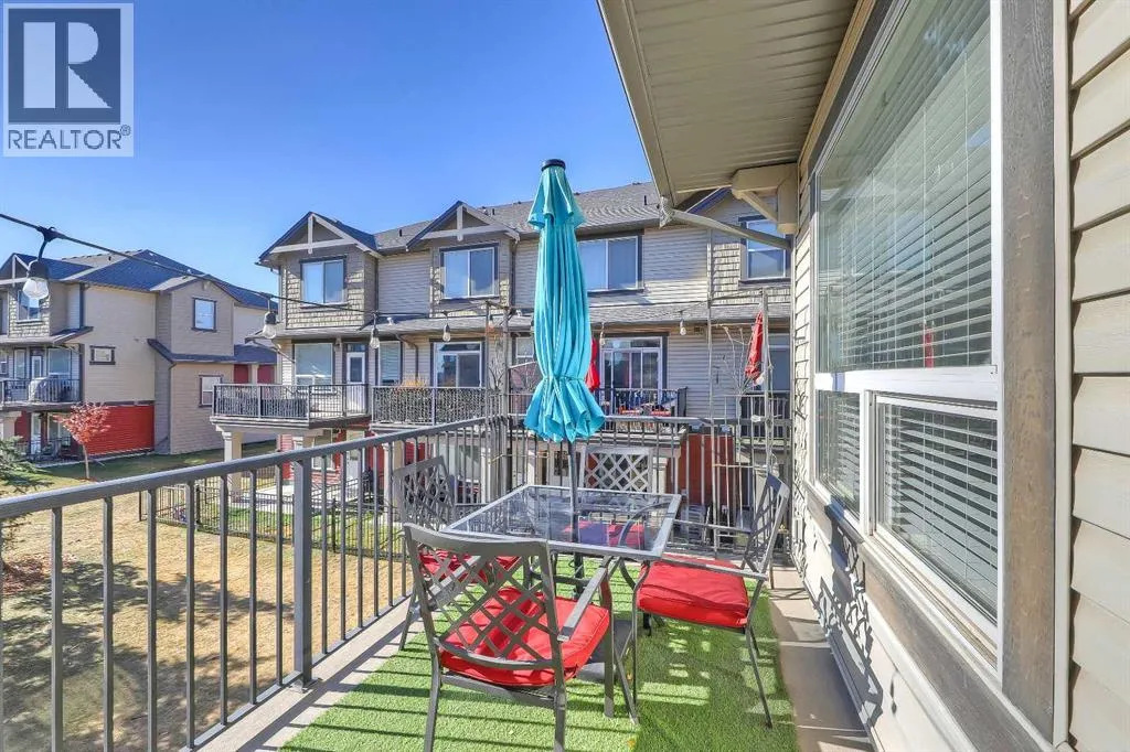 BRIGHT END UNIT | DOUBLE GARAGE | FINISHED WALKOUT BASEMENT | SCHOOL & NATURE PRESERVE STEPS AWAY! This spacious end unit in the family and pet-friendly Bridges at Williamstown complex offers an exceptional location with a south-facing balcony and enclosed yard that overlook the central courtyard. This property also provides easy access to an absolute abundance of amenities including playgrounds, parks, pathways, sports fields, Herons Crossing School just steps away, direct access to Williamstown Nose Creek Preserve right from the complex and close proximity to Reunion Pond, Woodside Golf Course and the shops, services, restaurants and retail along Veterans Boulevard.As you enter the property you will discover a main floor designed for both comfort and functionality. The spacious front foyer welcomes you with a large closet and easy access to the main and lower walkout levels of the home. Wide plank laminate floors flow throughout, enhancing the open-concept layout. The well-appointed kitchen offers rich cabinetry, stainless steel appliances, a pantry closet, ample granite countertop space, island with sit up breakfast bar, nook and a stylish stacked tile backsplash. The main living room is connected to the designated dining room and is warm and welcoming with bright windows and an attractive electric fireplace, perfect for relaxing evenings or gathering with friends. The main floor is completed with a half bathroom and a functional flex space that is ideal as a sitting room, reading area or computer station and provides direct access to the balcony. Upstairs, the home continues to impress, the spacious primary bedroom is a true retreat offering room for a king-sized bed, a generous walk-in closet and a 4-piece ensuite with a double vanity and a fully tiled shower. There are 2 additional bedrooms that offer size and versatility - ideal for kids/teens or a home office. Finishing off the upper level is a 4-piece bathroom with a large vanity and full tub/show er combination and a convenient laundry closet. The fully finished lower walkout level is as versatile as it is welcoming. It can easily serve as a 4th bedroom with a separate entrance and dedicated bathroom, or as a multi-use space for a home theatre or games room. Highlights include a modern 3-piece bathroom with in-floor heating, privacy door separating the space and oversized windows. From this level, youâll also find access to the utility room and the attached double garage.The outdoor living areas are outstanding with a sunny, south-facing raised balcony on the main level that overlooks the courtyard and a good-sized lower concrete patio and fenced yard off the lower level, perfect for sipping your morning coffee or just relaxing and enjoying the space. Additional features include 9â ceilings on the main level, new stove and over the range microwave (2024), new paint (2025), large driveway with room for 2 vehicles, ample visitor parking close to the unit and more. Welcome Home. (id:27476)