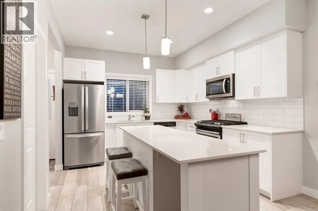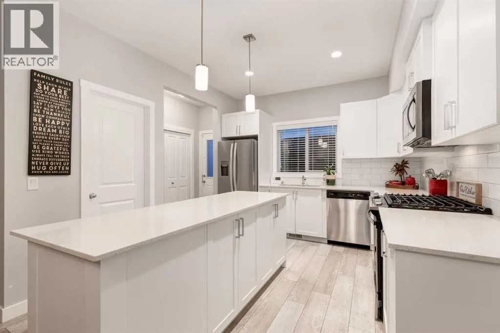 WELCOME to this IMMACULATE 2-Storey ROW HOME offering 2,002 sq ft of beautifully developed living space in the SOUGHT-AFTER community of MIDTOWN! Set on a CORNER LOT with NO CONDO FEES, this home blends STYLE, FUNCTIONALITY, and COMFORT, complete with a FULLY DEVELOPED BASEMENT and an INSULATED DOUBLE DETACHED GARAGE. Step inside to a BRIGHT and INVITING Foyer with 9â KNOCKDOWN CEILINGS, NEUTRAL Colours and sleek LAMINATE FLOORING that flows into the OPEN Living Room-perfect for relaxing or entertaining. The Dining Area comfortably fits your dinner party or weeknight meals, and flows into a CHEF-INSPIRED Kitchen featuring White Cabinetry, QUARTZ Counters, SS Appliances including a GAS COOKTOP, Whirlpool Fridge, Fresh White TILE Backsplash, and a central Island with Breakfast Bar. A dedicated PANTRY and a well-designed Mudroom with access to the backyard add to the everyday convenience, along with a stylish 2pc Bath on the main level. The upper level hosts 3 Bedrooms, including a large Primary Suite thatâs FLOODED with NATURAL Light, a WALK-IN Closet and a PRIVATE 3pc EN-SUITE featuring a Glass door SHOWER. Two more well-sized Bedrooms share a 4pc Bath with a SOAKER TUB, and an UPPER FLOOR LAUNDRY adds everyday ease. The FULLY FINISHED BASEMENT provides even more space with a large REC ROOM, a 4th BEDROOM with a WALK-IN-CLOSET, a full 4pc Bath, and a Utility Room-great for guests, teens, or extended family. Step outside to your EAST-FACING BACKYARD and enjoy morning coffee on the PATIO and weekend BBQs, a DOUBLE GARAGE that's DRYWALLED, INSULATED, and even ROUGHED-IN for a heater + an ADDITIONAL Gravel Parking Pad!! Located in the family-friendly Midtown community, youâre just steps from parks, walking paths, a pond, schools, shops, and more. Easy access to 8th Street and Deerfoot makes commuting a breeze. This is more than a home - itâs a TURNKEY LIFESTYLE in one of Airdrieâs best new neighborhoods. BOOK YOUR SHOWING NOW! (id:27476)