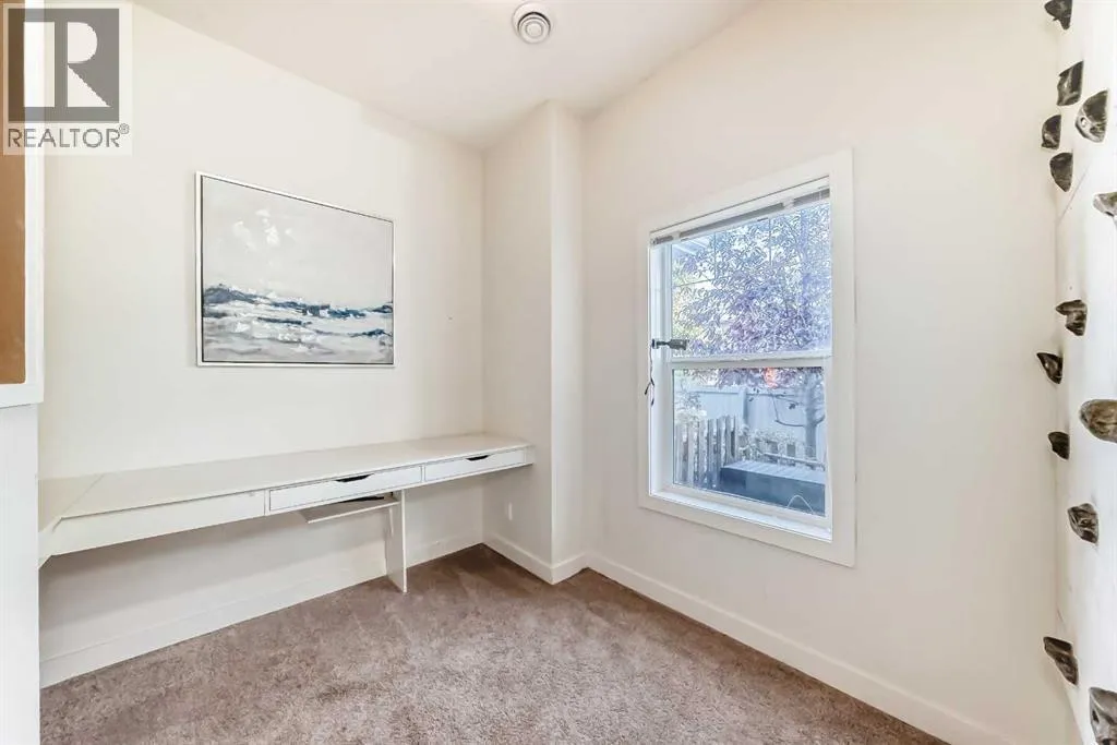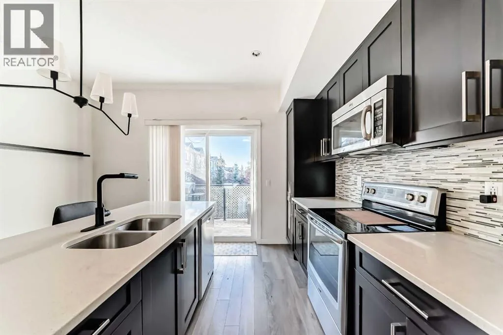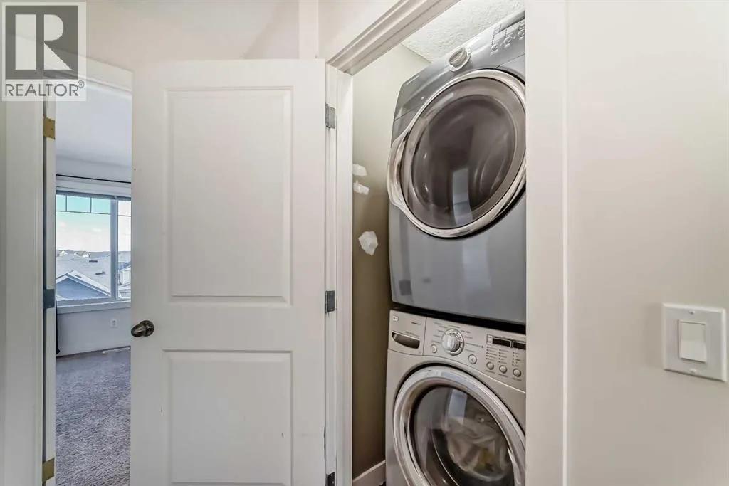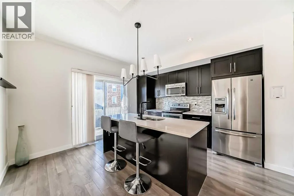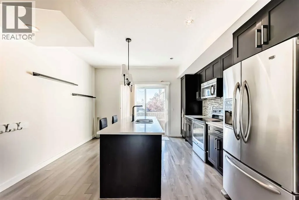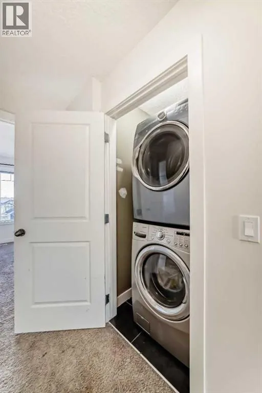 The ground floor entrance near garage leads to fabulous office workspace with built in desk and shelving. Entrance foyer with large closet and access to 2 pc bath, as well as inside entrance to garage where you will find the furnace/mechanical room. Carpeted stairs lead up to a beautiful open, spacious full of natural light main living area. There is a beautiful accent wall in dining and living room plus almost full width windows which floods the room with natural light. Kitchen features lots of rich dark natural wood cabinetry which highlights the gorgeous white quartz countertops and island. Gleaming stainless steel appliances complete your dream kitchen. Sliding patio doors lead to a balcony with enough room for the whole family. The upper level has 3 spacious bedrooms including a primary bedroom with a 3 piece ensuite and 2 double clothes closets. The upper level laundry room with stackable washer/dryer is a real step saver. Front yard is a fenced and private mini oasis with low maintenance landscaping with trees and bushes providing almost total privacy. Call your favourite Realtor to view this great family home. (id:27476)