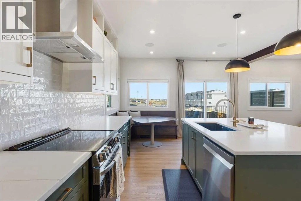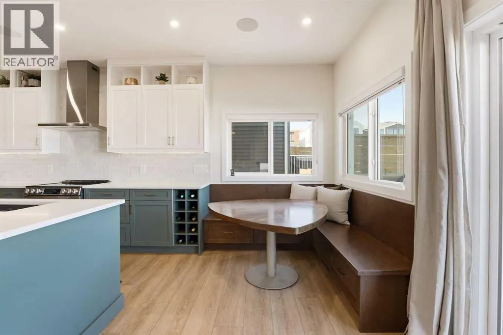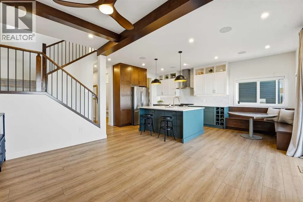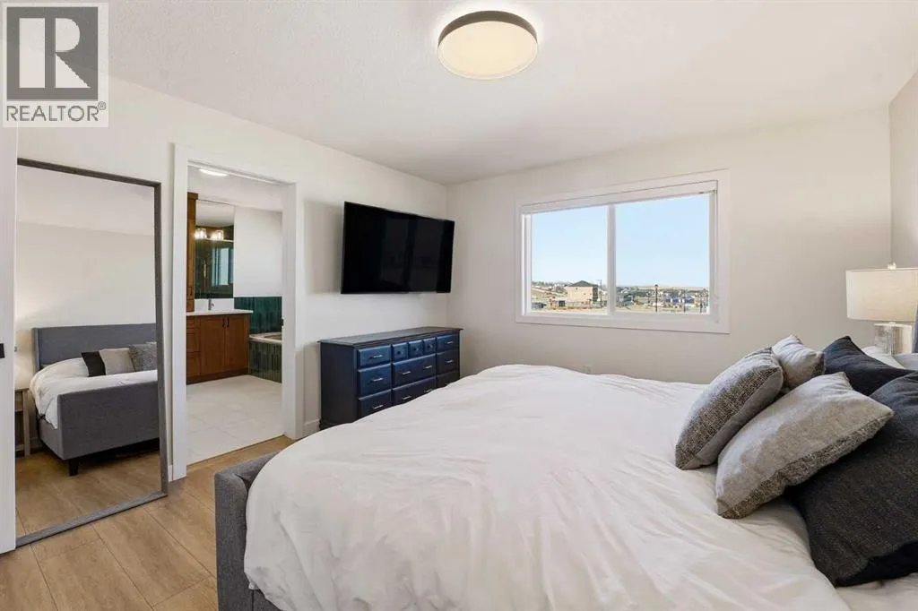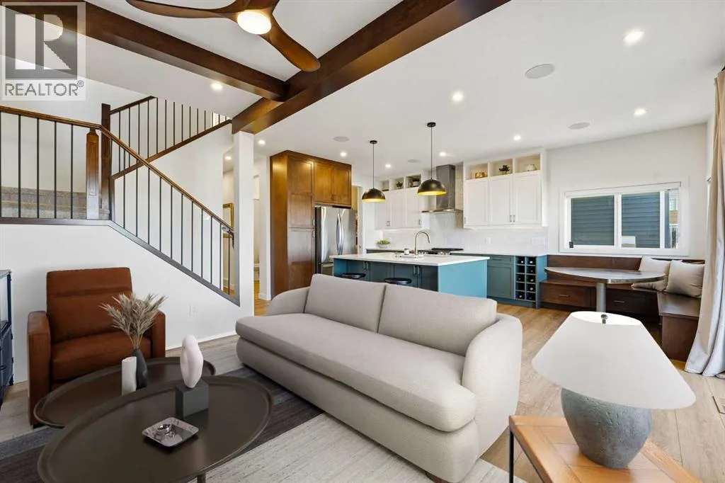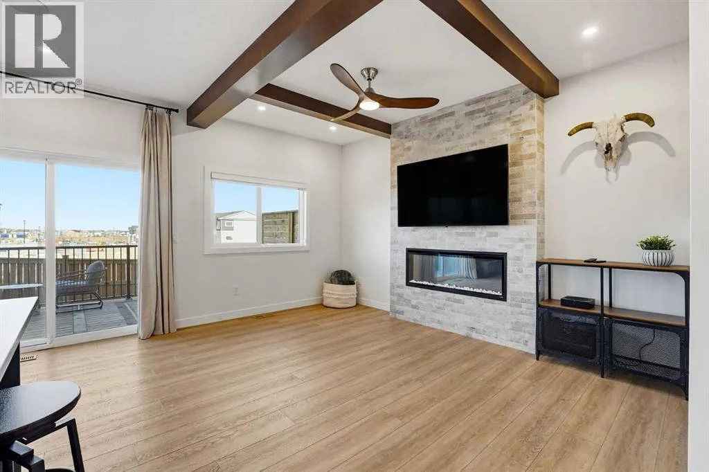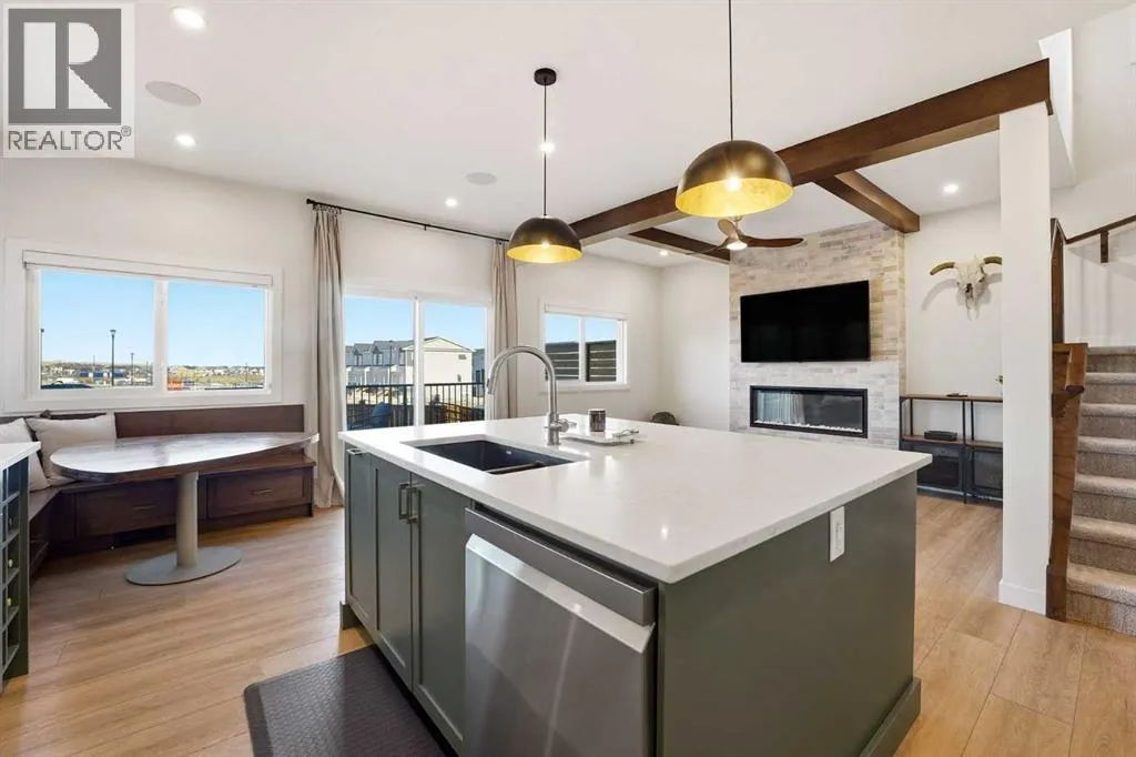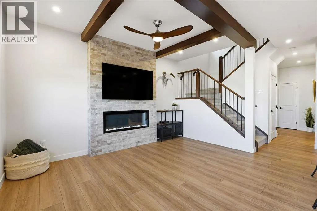 Welcome to 16 Key Cove in the Brand New Community of Key Ranch, Airdrie! Where luxury and functionality come together in perfect harmony. Built in 2024, this stunning home blends high-end design with everyday comfort and trust us, the photos don't do it justice! From the moment you step inside, you'll fall in love with the spacious front entry and rich flooring that flows seamlessly through the main level. The open-concept layout features an inviting living area, highlighted by gorgeous wood-beam ceiling details and a floor-to-ceiling fireplace that makes an incredible statement. The chef-inspired kitchen is a true showstopper, complete with rich cabinetry, upgraded countertops, premium appliances, a custom dining nook, and even a built-in wine rack. The walk-through pantry connects effortlessly to a generous mudroom for added convenience. Step outside to enjoy a fully landscaped backyard, featuring a large deck and new fencing, perfect for relaxing or entertaining guests. Upstairs, a central bonus room provides the ideal space for movie nights or homework sessions. You'll also find upstairs laundry, two spacious secondary bedrooms, and a luxurious primary suite that truly impresses. The spa-inspired 5-piece ensuite offers a walk-in tile shower, soaker tub, dual vanities, and a large walk-in closet. Your private retreat awaits! Additional features include central air conditioning, epoxy-coated garage flooring, and thoughtful upgrades throughout. This home truly has it all: style, comfort, and unbeatable value in one of Airdrie's most exciting new communities. See for yourself why 16 Key Cove should be your next address! (id:27476)