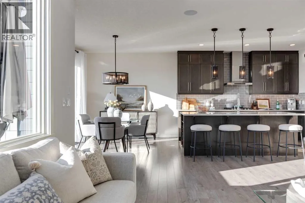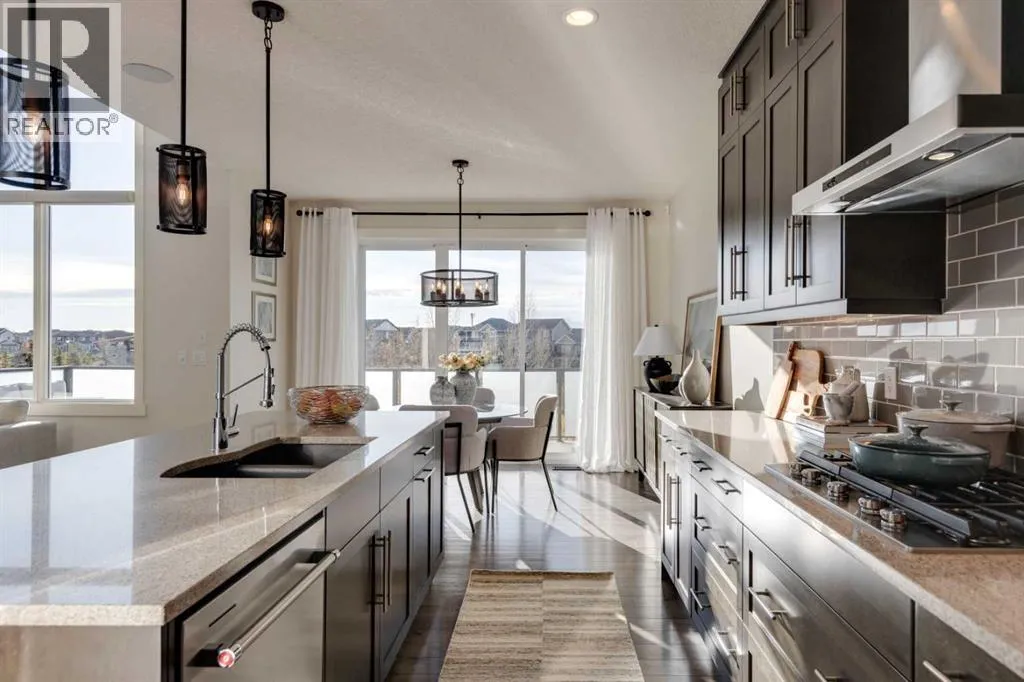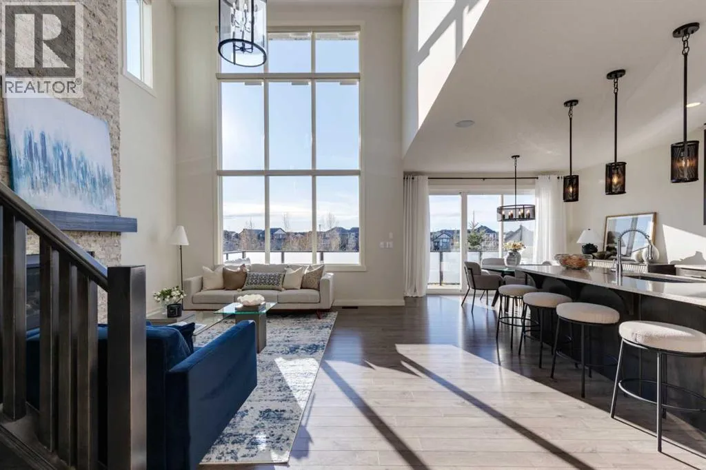 Welcome to 161 Kingsmere Cove SE, where thoughtful design meets refined living. Nestled in a quiet cul-de-sac, on an pie shaped lot just shy of 9,000 sq. ft., this pristine walkout home backs onto a tranquil pond and walking path. Offering picturesque views, privacy and a safe family-friendly connection to nature; this home captivates as you enter. Inside, a soaring 22â ceiling frames the striking stone surround gas fireplace, filling the open concept layout with warmth and natural light through the expansive windows. The chef-inspired kitchen features granite countertops, soft-close cabinetry, a walk-through pantry, and a large island overlooking the dining area; perfect for cooking, conversation, and connection. The thoughtful layout lets you flow from inside to the balcony, which is complete with two gas lines. Here you can unwind with southwest-facing sunset views over the water. Upstairs, you'll find three generous bedrooms including the primary, a bright bonus room and laundry. The primary oasis offers vaulted ceilings, a spa-like 5-pc ensuite with heated floors, soaker tub, six jet shower, dual sinks, and walk-in closet. The upper laundry adds convenience with its sink, shelving, and countertop workspace. The finished walkout basement expands living to 3,168 sq. ft., ideal for a 4th bedroom, gym, or office space, and includes a 3-pc bath featuring heated floors and a large recreational room for board games or watching your favourite sports team! Outside, you'll love the covered patio, a show stopper for entertaining and lounging alike! This outdoor sanctuary is fully equipped with sprinklers, privacy walls, a gas line, hot tub rough-in that opens to a fully fenced yard including a dog run, a custom shed to match the home, a fully manicured lawn with mature trees, and your own private gate to the pathway for evening strolls in the fall. You can also enjoy skating with your family and neighbours on the pond in winter! This home has received over $160,000 in upg rades since 2019; including new roof, shelving & organizers in the heated triple garage with space for a lift, furnace, A/C, powered shades with solar charging, smart security, composite siding, 6-zone built-in speakers & so much more. No detail was missed in this stunning masterpiece. It blends sophistication, comfort, and lifestyle in perfect harmony! All of this comes with easy access to great schools, parks, playgrounds, shopping & the new HWY 2 intersection at 40th Avenue. (id:27476)