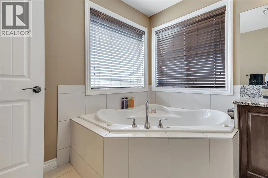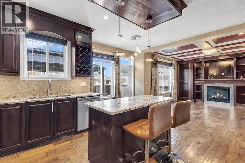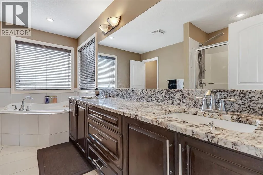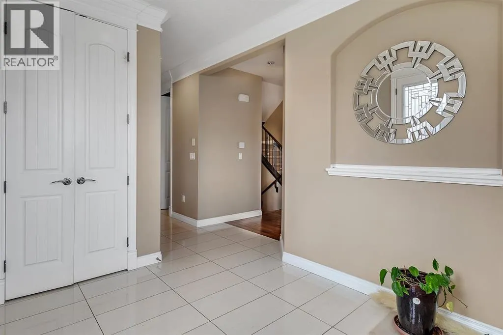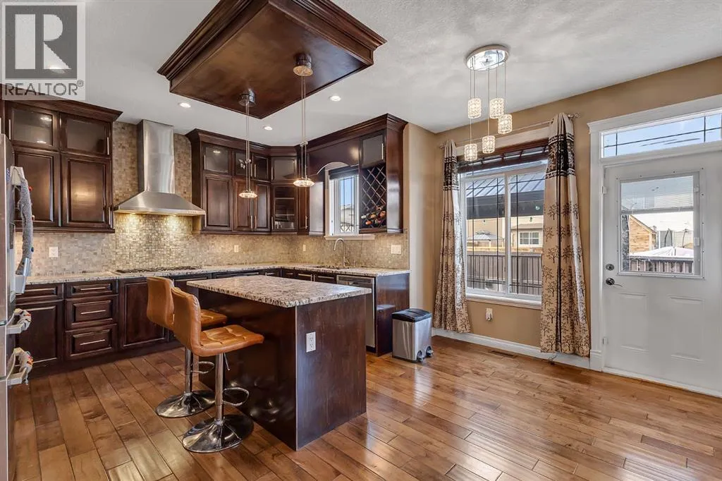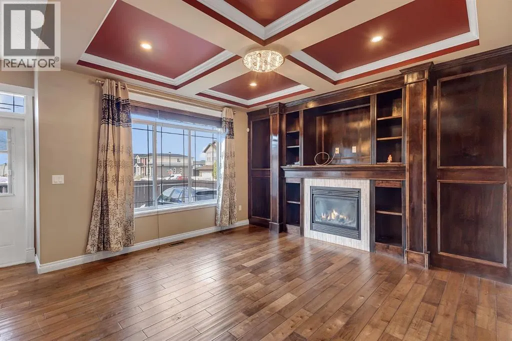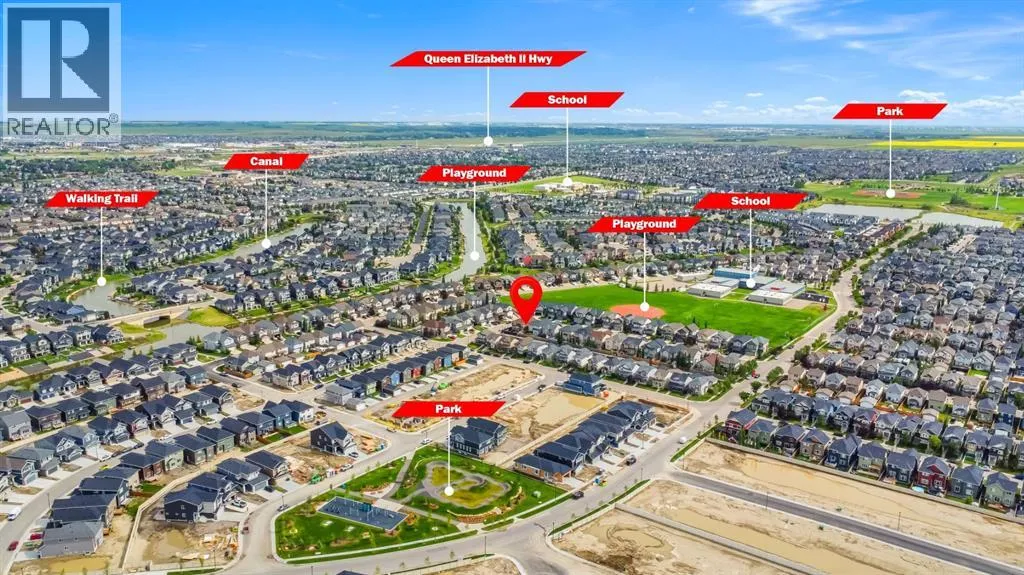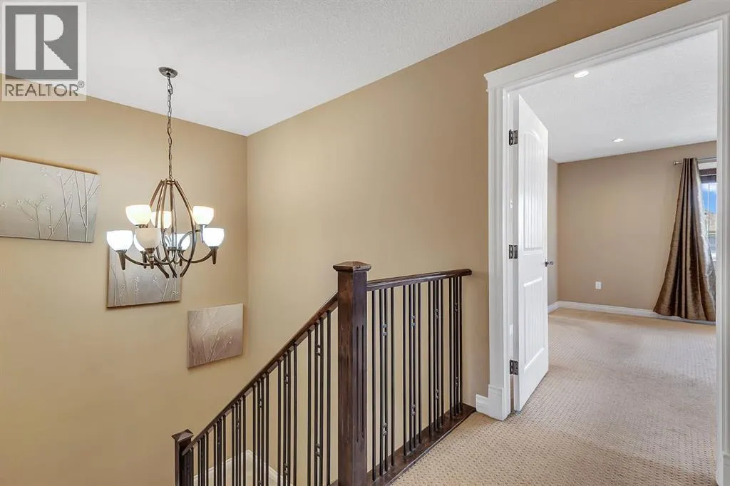 Corner Lot | Approx 2500 SQFT | Mainfloor Bedroom | Custom Woodwork | 2 Ensuites. Stunning 2,500 sq. ft. Fully Upgraded Two-Storey in Bayside. Discover this beautifully designed two-storey home in the sought-after Baywater community, ideally located on a spacious corner lot with a rear paved laneâjust steps from Nose Creek Elementary School, parks, and the scenic Canal pathway. This custom-built layout offers a bright family room with a cozy fireplace and built-in cabinetry, a chefâs kitchen with ceiling-height cabinetry and a walk-through pantry, and a formal dining roomâperfect for entertaining. A versatile main-floor den can serve as a home office or optional fourth bedroom. Upstairs, youâll find three generously sized bedrooms and three full bathrooms. The luxurious primary suite boasts a spa-inspired 5-piece ensuite. The second bedroom features its own 4-piece ensuite, while the third bedroom enjoys convenient access to the main 4-piece bath. A spacious bonus room and an upper-level laundry add practicality and comfort. This home showcases exceptional finishes, including hand-scraped hardwood, designer tile, custom railings, in-stair lighting, 8' doors with oversized headers, and 9' ceilings on both the main and lower levels. The exterior is equally impressive with upgraded siding, a rear deck, and an insulated 21' x 23' garage. A perfect family-friendly location where kids can easily walk to school and nearby parks. (id:27476)