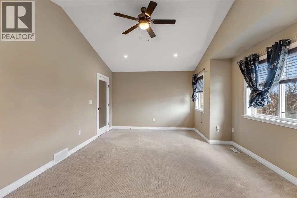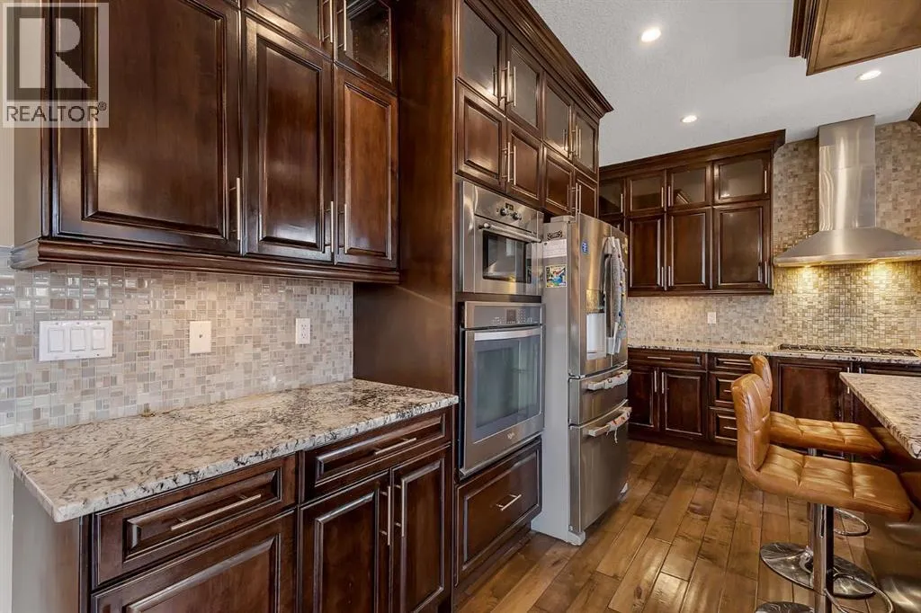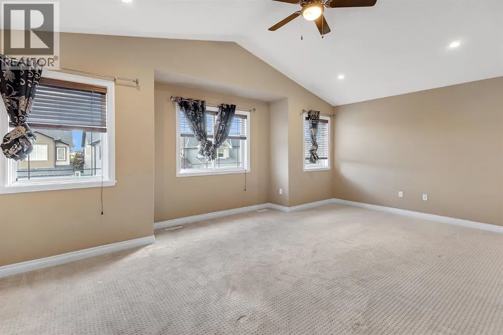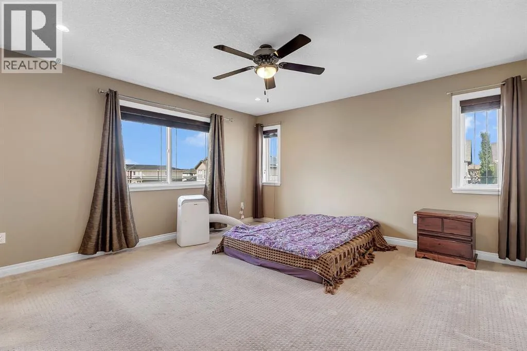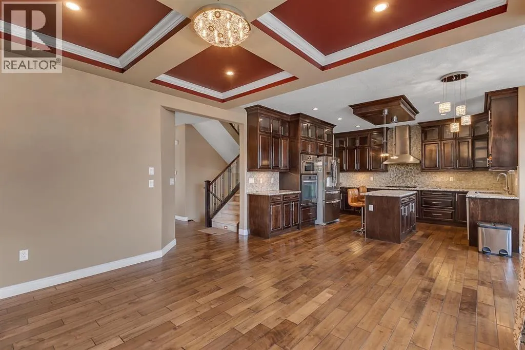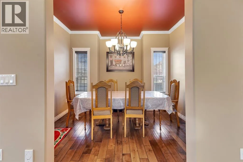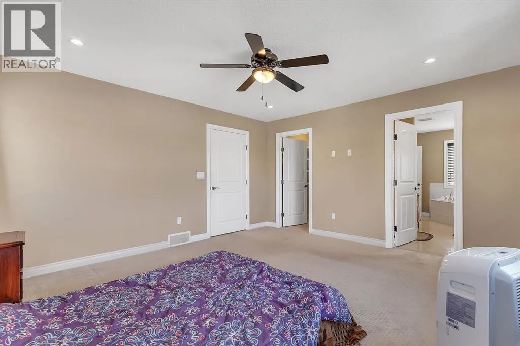 Corner Lot | Approx 2500 SQFT | Mainfloor Bedroom | Custom Woodwork | 2 Ensuites. Stunning 2,500 sq. ft. Fully Upgraded Two-Storey in Bayside. Discover this beautifully designed two-storey home in the sought-after Baywater community, ideally located on a spacious corner lot with a rear paved laneâjust steps from Nose Creek Elementary School, parks, and the scenic Canal pathway. This custom-built layout offers a bright family room with a cozy fireplace and built-in cabinetry, a chefâs kitchen with ceiling-height cabinetry and a walk-through pantry, and a formal dining roomâperfect for entertaining. A versatile main-floor den can serve as a home office or optional fourth bedroom. Upstairs, youâll find three generously sized bedrooms and three full bathrooms. The luxurious primary suite boasts a spa-inspired 5-piece ensuite. The second bedroom features its own 4-piece ensuite, while the third bedroom enjoys convenient access to the main 4-piece bath. A spacious bonus room and an upper-level laundry add practicality and comfort. This home showcases exceptional finishes, including hand-scraped hardwood, designer tile, custom railings, in-stair lighting, 8' doors with oversized headers, and 9' ceilings on both the main and lower levels. The exterior is equally impressive with upgraded siding, a rear deck, and an insulated 21' x 23' garage. A perfect family-friendly location where kids can easily walk to school and nearby parks. (id:27476)