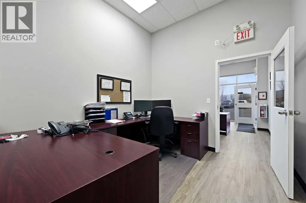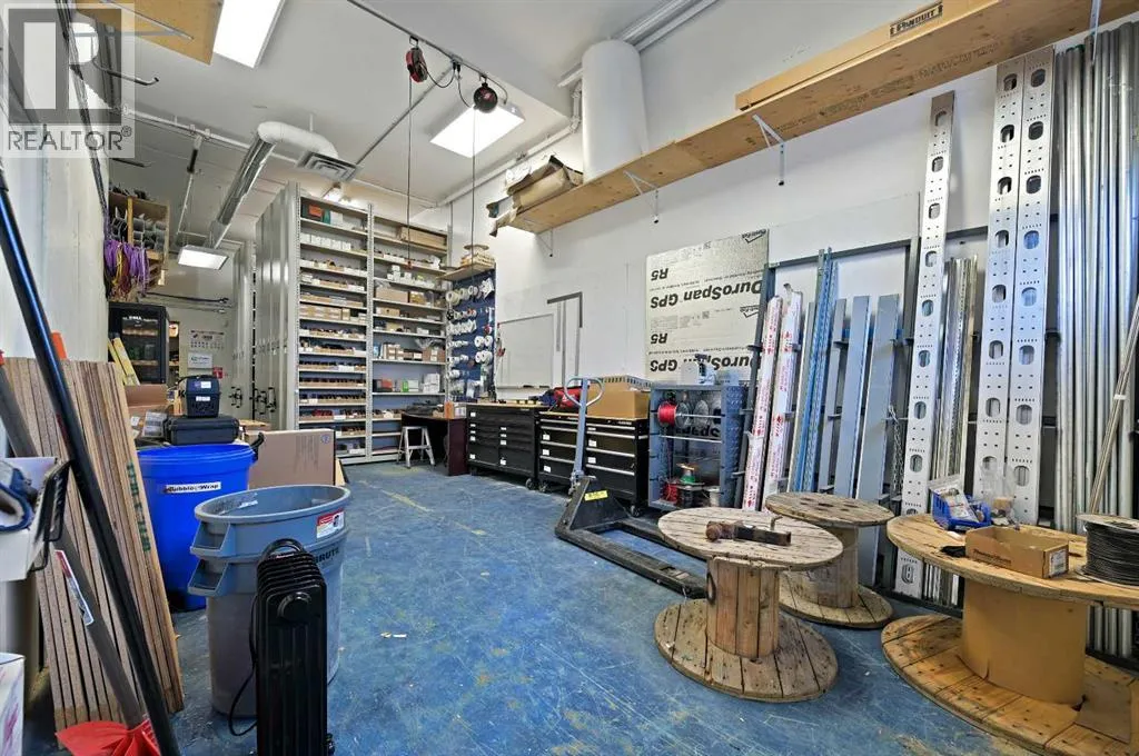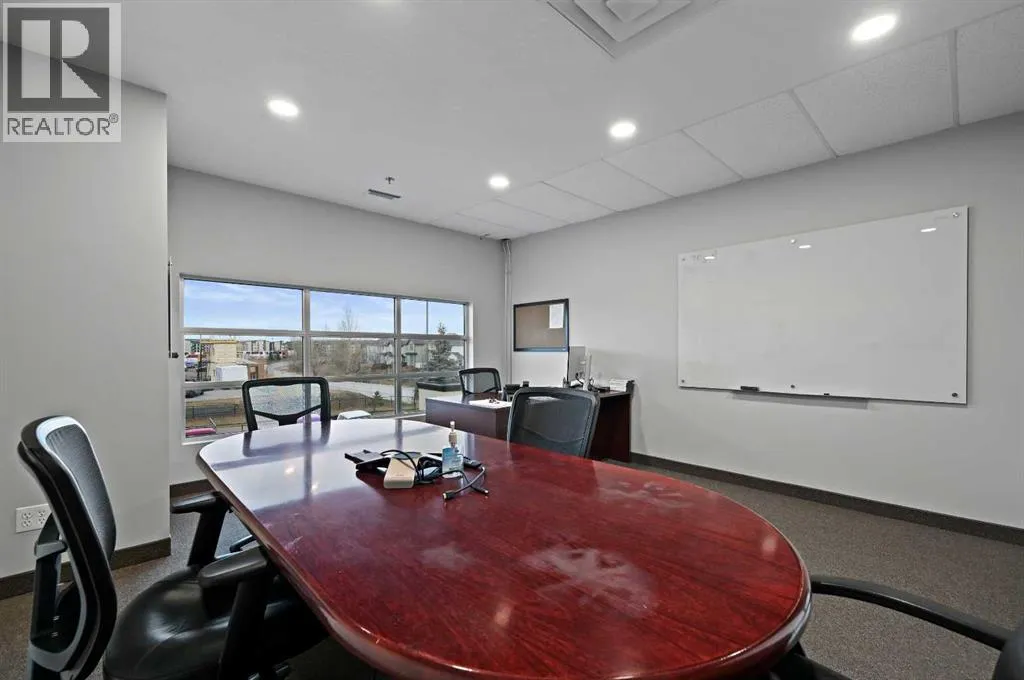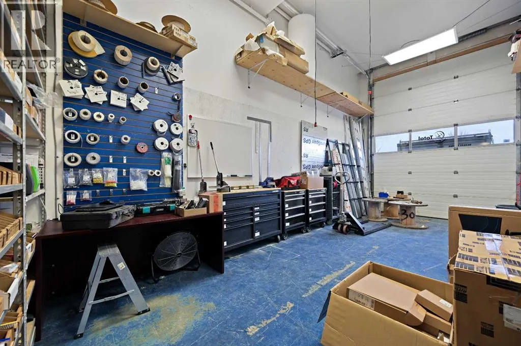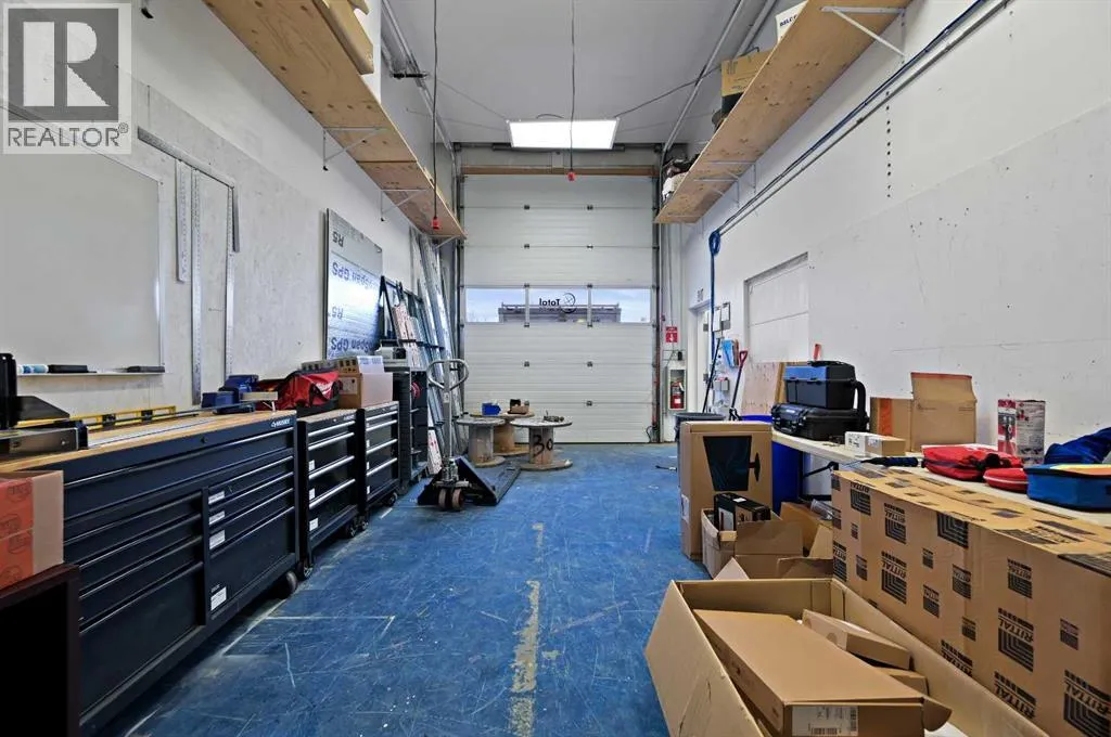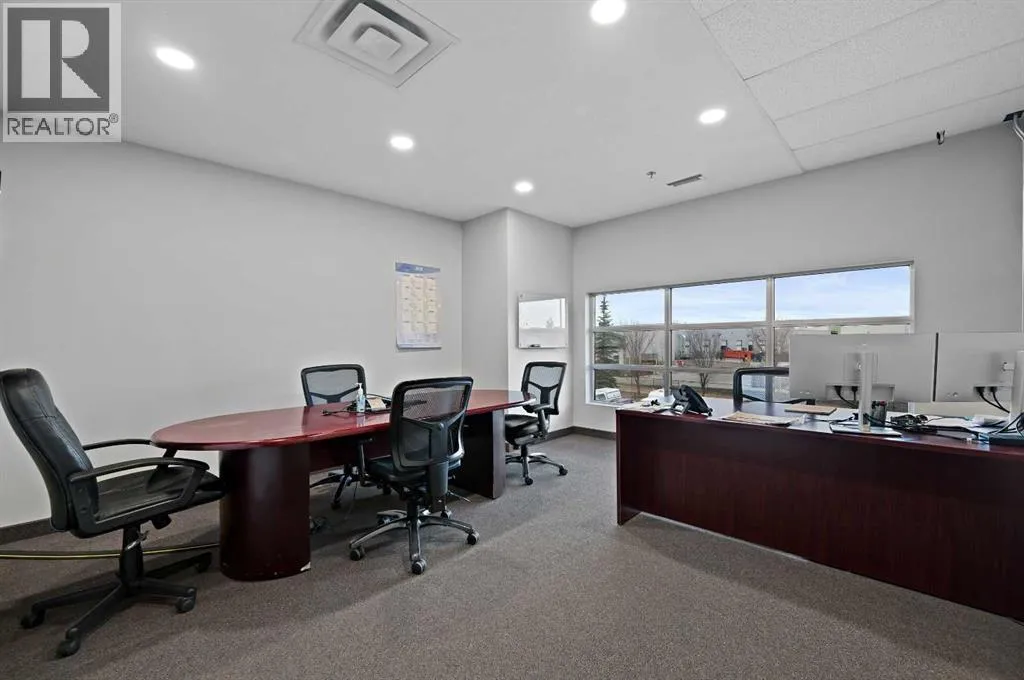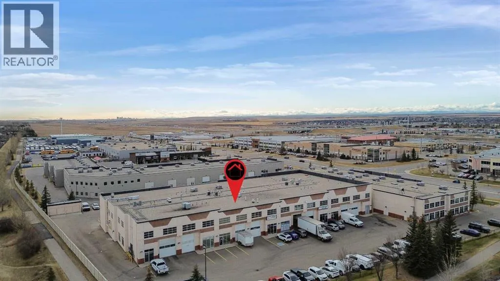 Commercial condos of this type are rare to find on the market in Airdrie. The unit is within the Kingsview Plaza, with excellent access to 40th Ave, Deerfoot Trail, Kingsview Market and Yankee Valley Blvd. The zoning is IB-1 for a variety of businesses, including business services, some retail and industrial services, animal services, microbrewery, health care and more. The condo includes 3,110 sq. ft. on 2 levels, consisting of a 570 sq. ft. shop / warehouse, reception, office, kitchen, bathroom and storage on the main level. The shop has 15 ft. clear height. The air conditioned second level is well designed offices and open area perfect for training plus a second bathroom. Loading is via a grade level 10 x 14 overhead door plus office entrance. Don't need both levels? - the second level can be easily secured from the main level for rental income. With assigned parking at the door and plenty of scramble parking, there is room for everyone. The rolling shelving system in the shop is available as a separate sale. (id:27476)