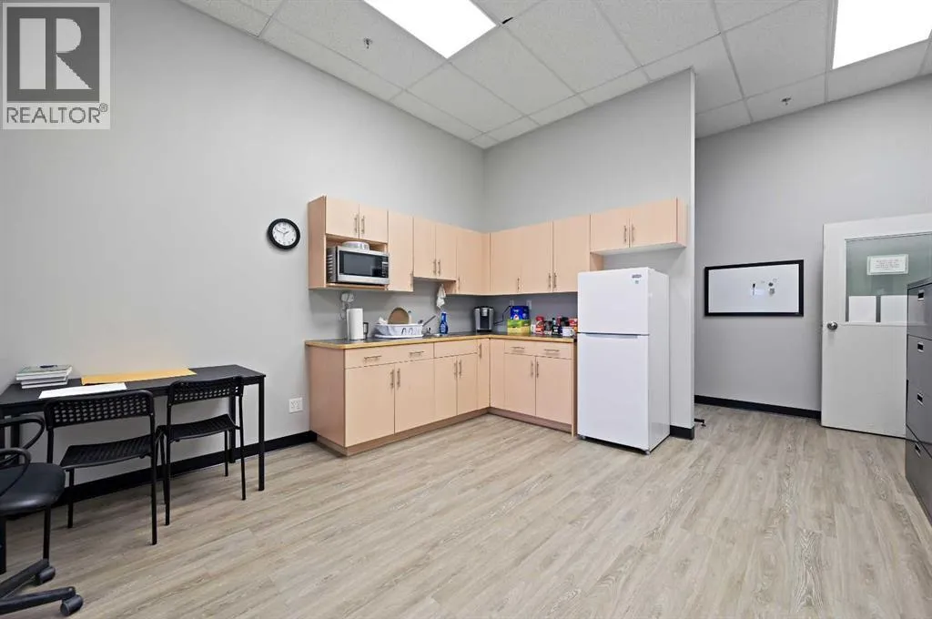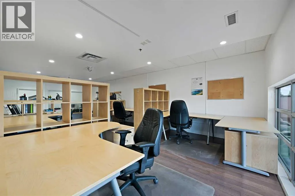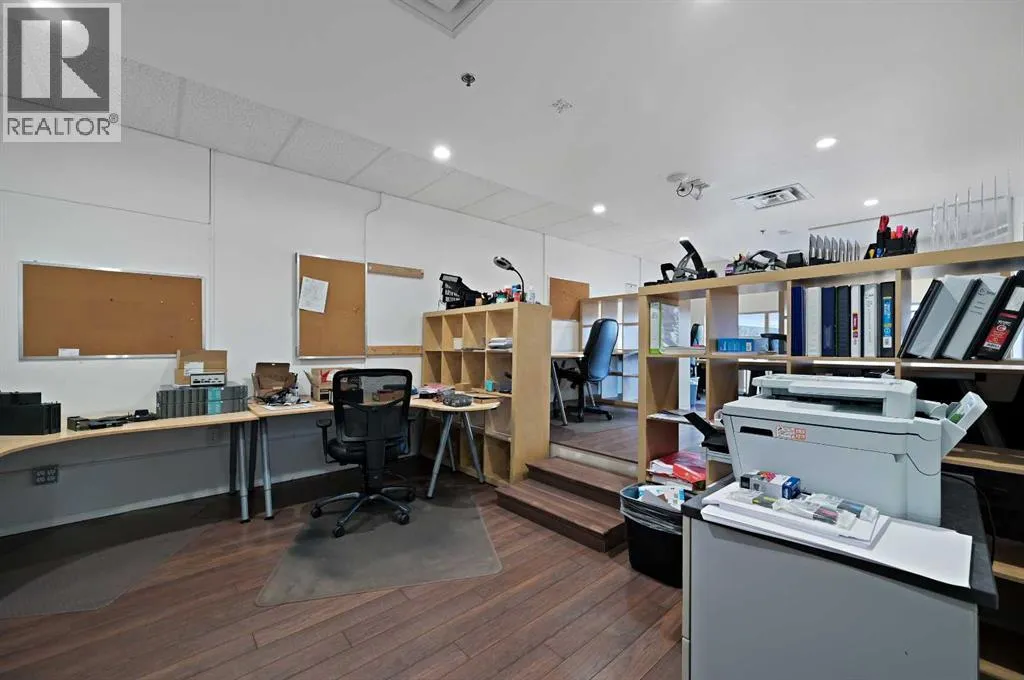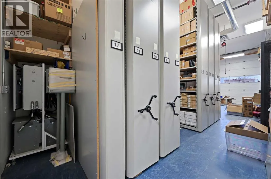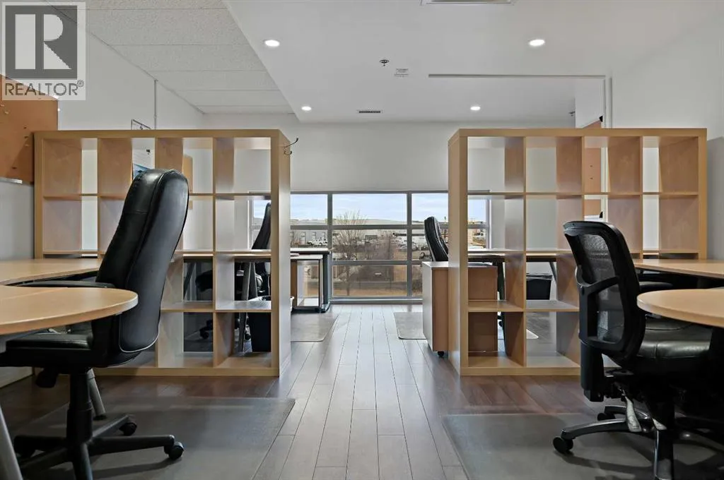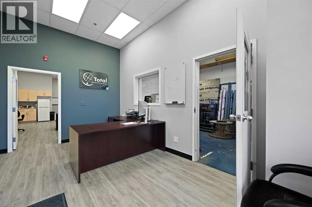Commercial condos of this type are rare to find on the market in Airdrie. The unit is within the Kingsview Plaza, with excellent access to 40th Ave, Deerfoot Trail, Kingsview Market and Yankee Valley Blvd. The zoning is IB-1 for a variety of businesses, including business services, some retail and industrial services, animal services, microbrewery, health care and more. The condo includes 3,110 sq. ft. on 2 levels, consisting of a 570 sq. ft. shop / warehouse, reception, office, kitchen, bathroom and storage on the main level. The shop has 15 ft. clear height. The air conditioned second level is well designed offices and open area perfect for training plus a second bathroom. Loading is via a grade level 10 x 14 overhead door plus office entrance. Don't need both levels? - the second level can be easily secured from the main level for rental income. With assigned parking at the door and plenty of scramble parking, there is room for everyone. The rolling shelving system in the shop is available as a separate sale. (id:27476)