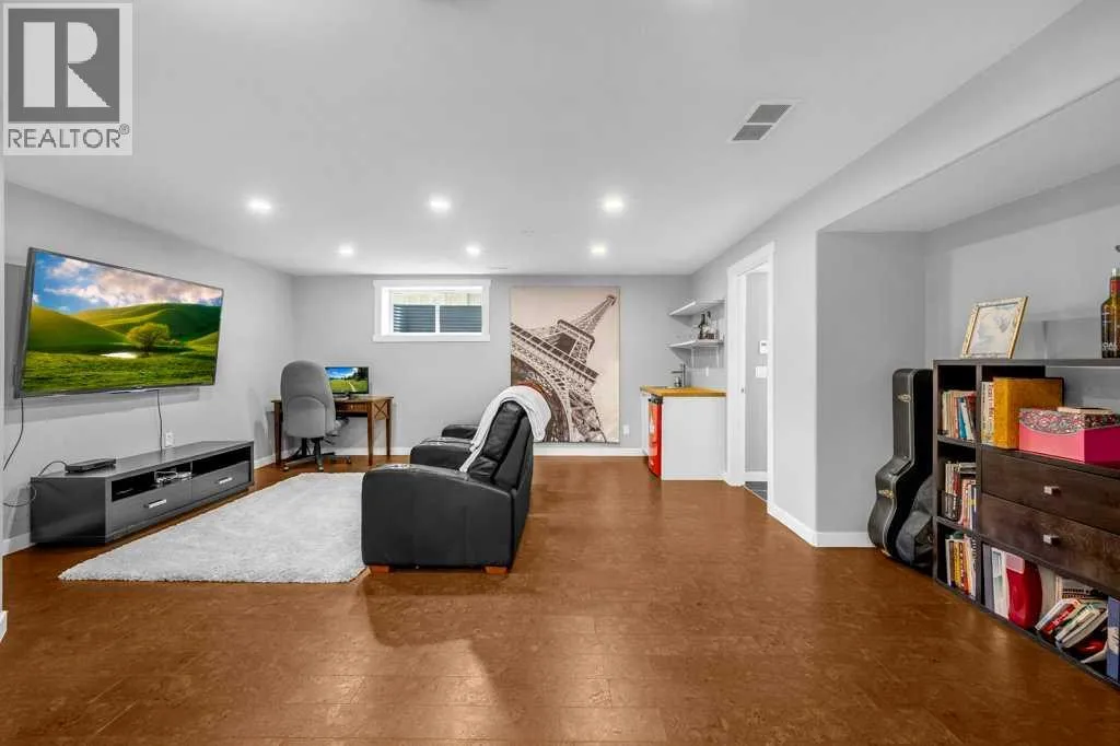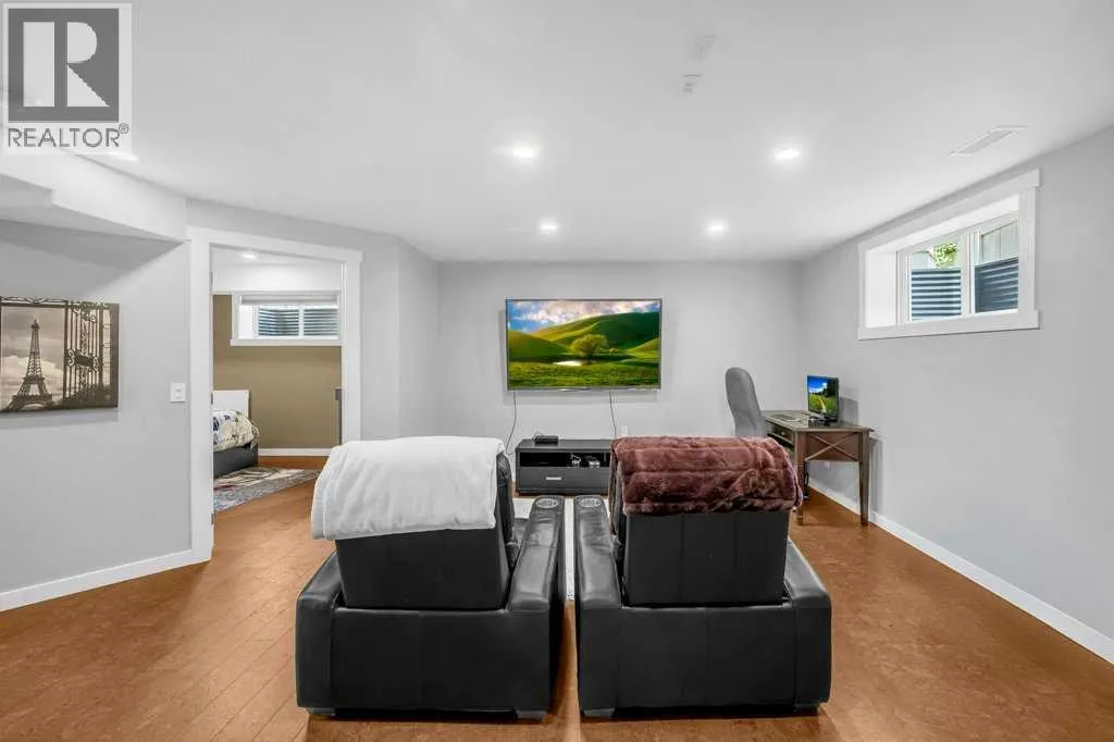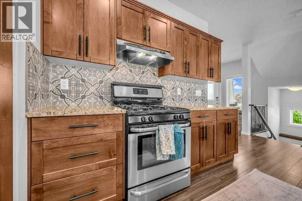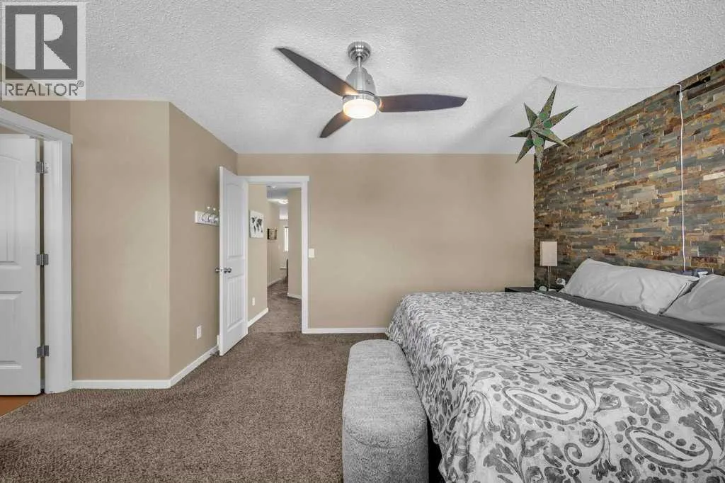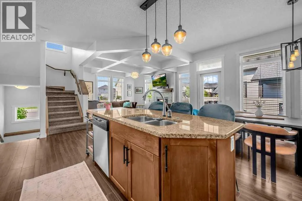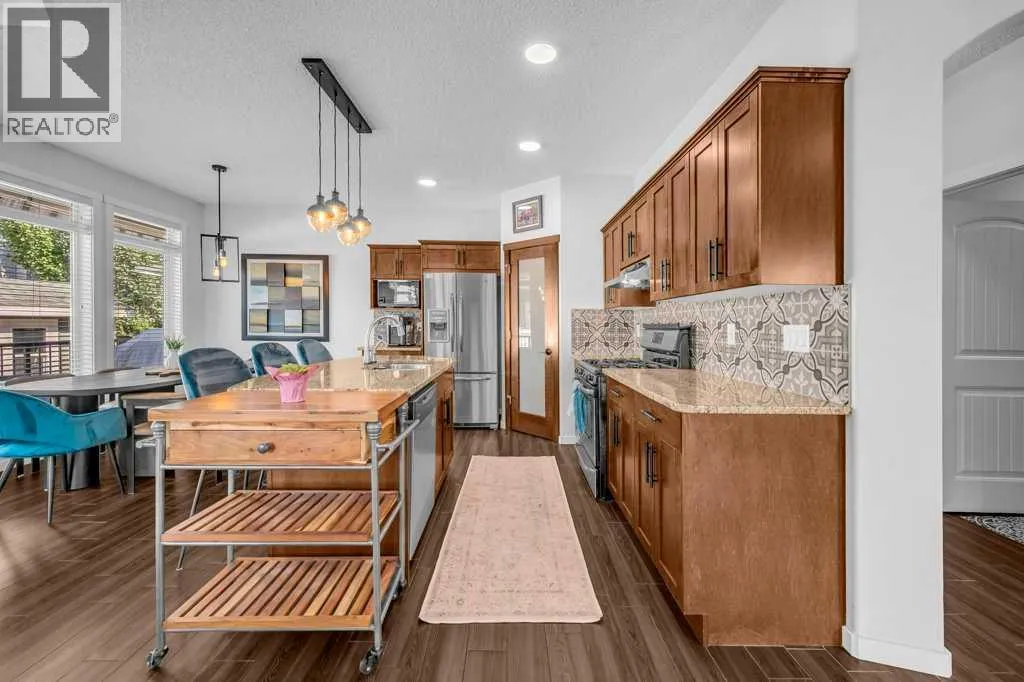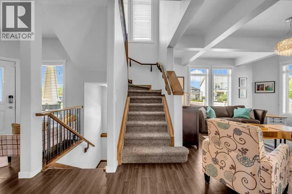 ** Open House - Saturday, November 15th from 2 PM to 4 PM ** Welcome to Kings Heights, one of Airdrieâs most desirable communities! This beautiful home sits on an expansive corner lot, offering over 2,500 sq. ft. of developed living space. From the moment you enter, youâll notice the spacious foyer with soaring ceilings, abundant natural light, and beautiful tile flooring throughout the main level. The main floor features a 2-piece bathroom, a large front closet, and a massive mudroom with access to the oversized heated double attached garage. A walk-through pantry connects the mudroom to the gourmet kitchen, which boasts rich cabinetry, granite countertops, a stylish new backsplash, gas stove, stainless steel appliances, and a large island with a double sink and seatingâperfect for cooking and entertaining. The bright dining area easily accommodates an 8-person table and leads out to a low-maintenance composite deck with an automatic awning, ideal for summer gatherings. The living room offers soaring knockdown ceilings, a cozy gas fireplace, pot lights, and a beautiful chandelier. Upstairs, youâll find plush carpet throughout, a generous master retreat with a stone accent wall, a spa-like 5-piece ensuite (double vanity, soaker tub, walk-in shower, and private water closet), plus a large walk-in closet. Two additional spacious bedrooms, a 4-piece bathroom, a large laundry room with linen storage, and a bright bonus room complete the upper level. The fully finished basement provides even more living space, with a large bedroom and closet, a family room with wet bar (perfect for movie nights), a 4-piece bathroom with in-floor heating, and ample storage. Located just minutes from shopping, schools, and quick access to Deerfoot Trailâthis home combines elegance, comfort, and convenience in one of Airdrieâs best neighborhoods. Recent updates include: new hot water tank (2025), brand-new microwave, and all new fixtures. (id:27476)
