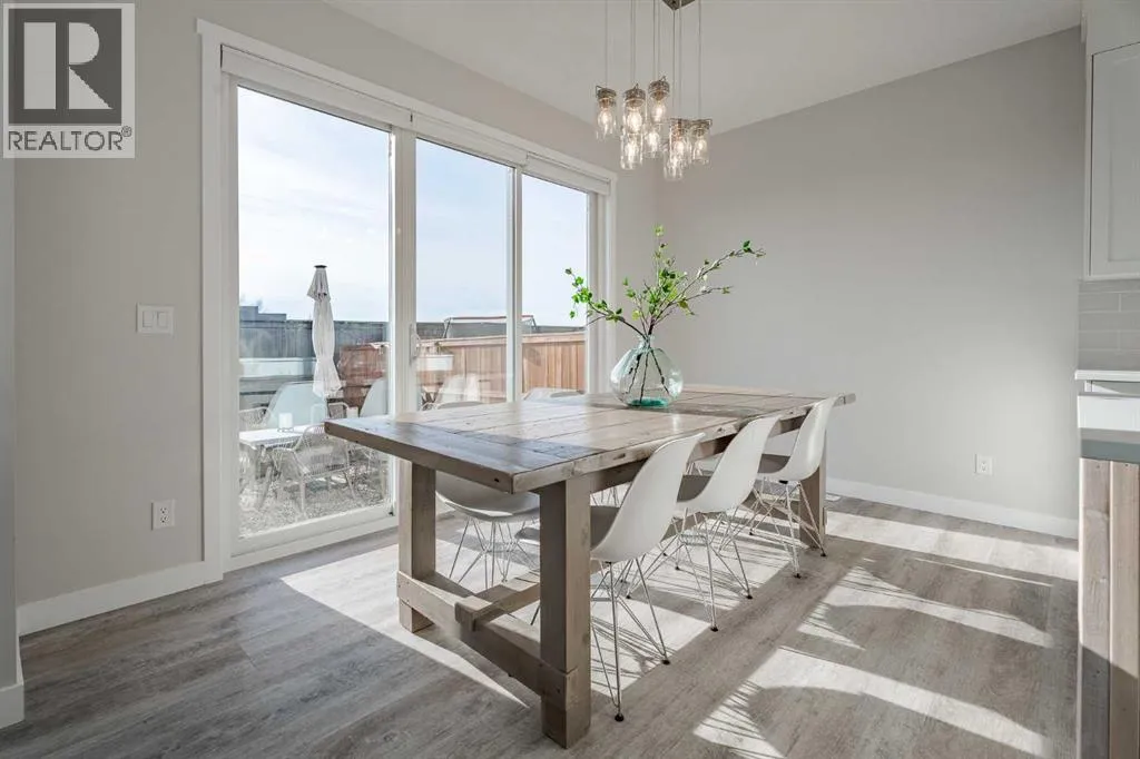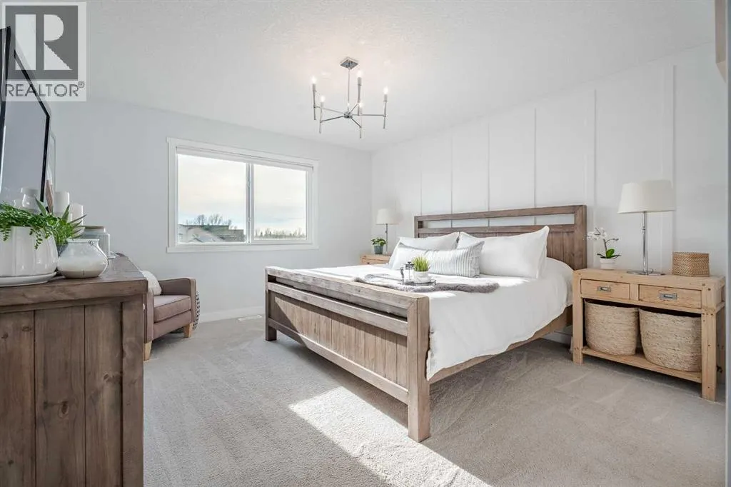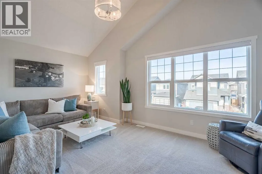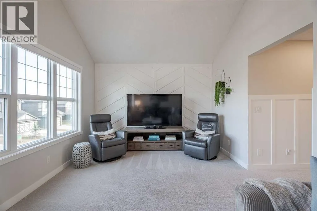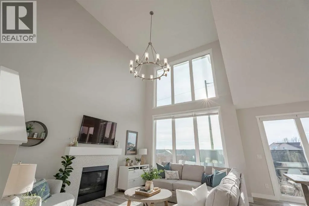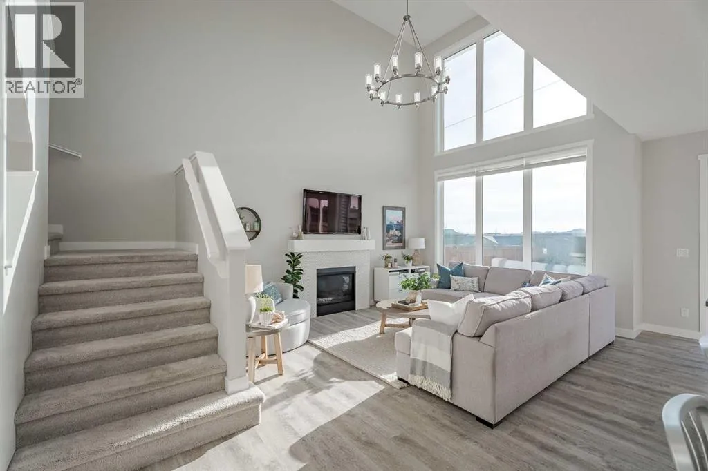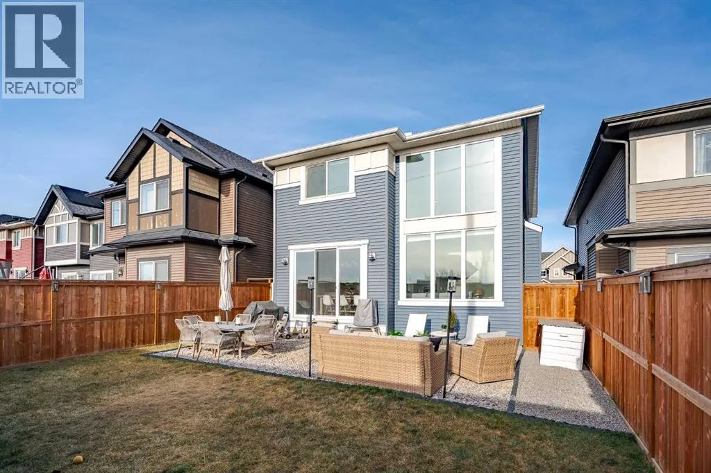 Welcome home to this stunning property in one of Airdrieâs most loved south communities, Kings Heights; with easy and quick access to Deerfoot. Perfectly tucked away on a quiet crescent, this home backs onto beautiful acreage properties, offering a rare sense of space and peaceful, country-style living just minutes from Kingsview Market, its amenities, and a nice selection of nearby schools. Inside, soaring two-storey windows flood the main living area with natural light â a breathtaking view you can also enjoy from the second level. The main floor features ultra-durable laminate floors, a spacious living room centered around a stunning feature fireplace, and a chefâs kitchen with upgraded appliances, and sleek quartz counter throughout. A main floor office/den conveniently placed by the front entrance provides an ideal space for work or study. Upstairs, youâll find three spacious bedrooms, including a primary suite with a large walk-in closet with built-ins and a spa-inspired 5pc ensuite. Youâll love the open view of the main living area below, where sunlight pours through the dramatic windows. A spacious vaulted ceiling bonus room, along with wainscoting and feature walls throughout, add timeless charm and a perfect amount of living space. The undeveloped basement with a rough-in bathroom awaits your finishing ideas, while the double attached garage provides everyday convenience. Step outside to a large backyard with plenty of room to play, relax, and grow. This home perfectly blends light, luxury, and livability, offering the warmth of country charm with the convenience of city life. (id:27476)