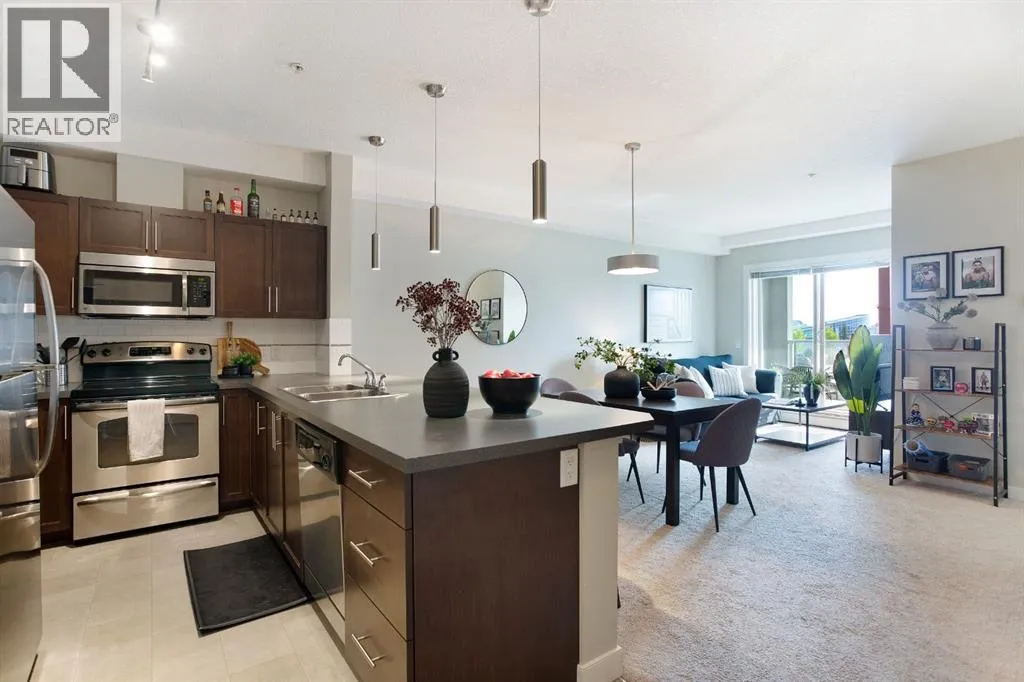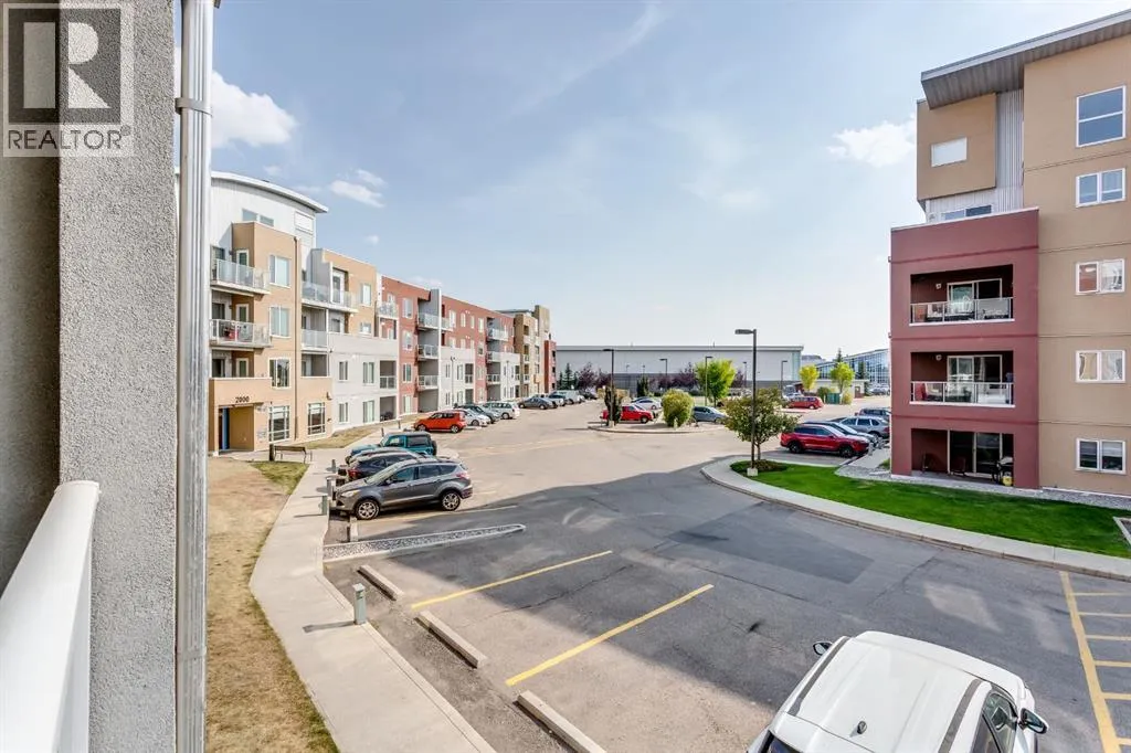 Discover unparalleled convenience and comfort in this beautifully updated, 847 sqft south-facing condo. With 2 bedrooms and 2 bathrooms, the functional floor plan expertly maximizes space and light, delivering a bright, inviting atmosphere through its open-concept design. Enjoy a spacious living room that flows seamlessly out to your exclusive, sunny balcony. The kitchen is a highlight, featuring warm walnut cabinets, a neutral backsplash, and a large island with seating for four, making it perfect for both casual meals and entertaining. Thoughtfully designed for privacy, the primary bedroom boasts a private 3-piece ensuite and is filled with natural light from a large window. This unit also includes a generously sized second bedroom, a full 4-piece main bathroom, and convenient in-suite laundry. The location is simply unbeatable: Situated on East Lake Boulevard, you are literally across the street from Genesis Place! Walk to Bert Church High School, the outdoor hockey rink, tennis courts, and nearby shopping. This bright, modern home in a well-maintained building is move-in ready and the ideal, hassle-free choice for first-time buyers, down sizers, or savvy investors. Book your showing today! (id:27476)