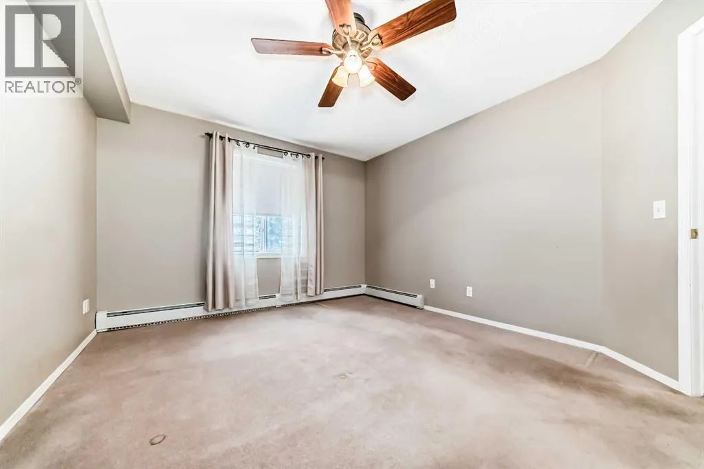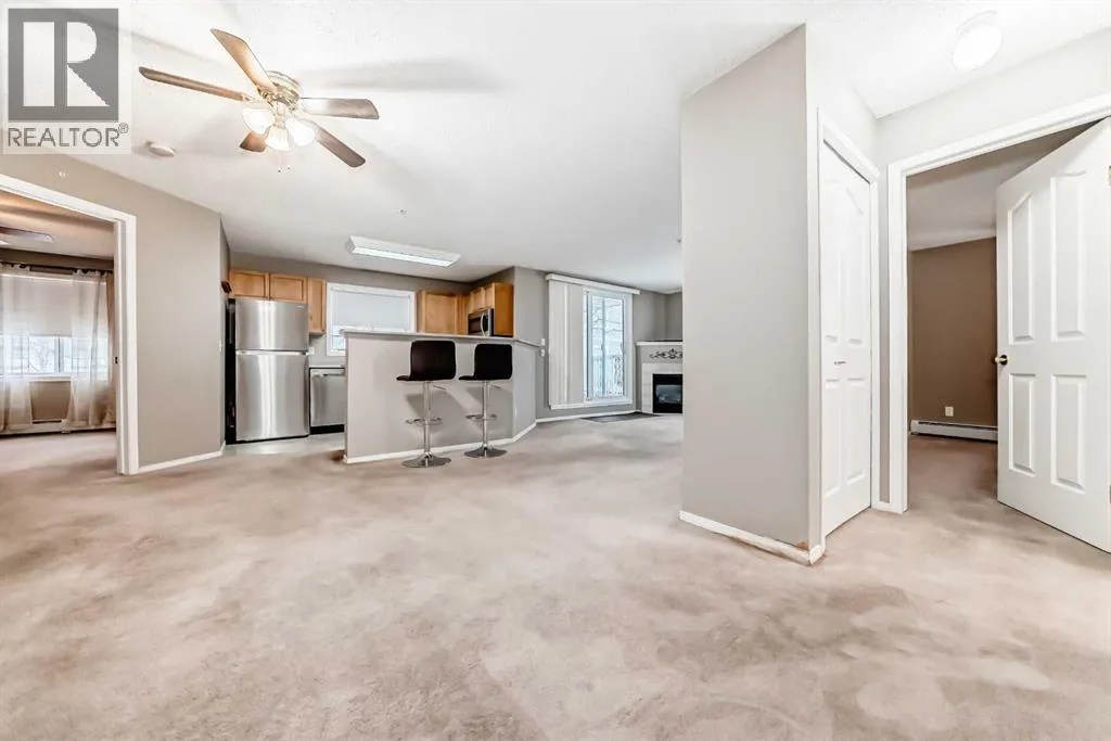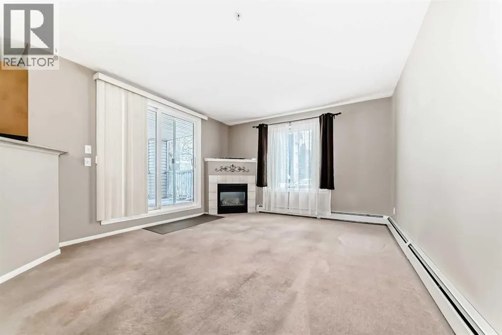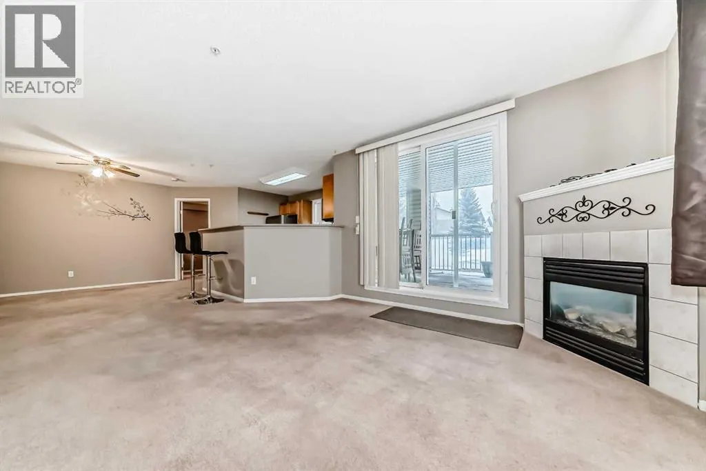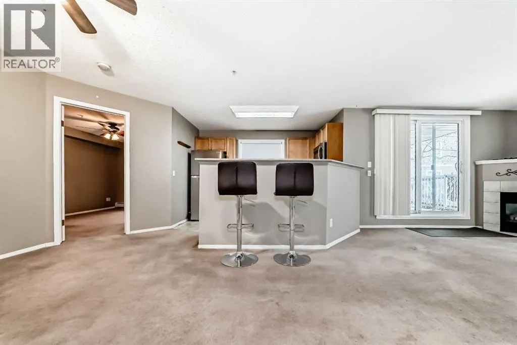 Welcome to this bright and inviting main-floor condo in Airdrie, well-suited for first-time buyers, downsizers, or anyone seeking low-maintenance living.This thoughtfully designed 2-bedroom, 2-bathroom end unit layout offers ideal separation between the bedrooms, including a primary suite with a walk-through closet and private 4-piece en suite.The open-concept main living area features a practical kitchen breakfast bar, a cozy gas fireplace, plus direct access to your south-facing, fenced patioâperfect for morning coffee or simply enjoying extra privacy. The carpet has just been replaced too, offering a fresh start!Youâll appreciate the convenience of a titled underground parking stall with secure storage, plus on-site visitor parking for guests. (This unit currently enjoys a long-term lease surface parking spot, as well.) Among other benefits, the condo fees include heat, electricity, and water, making budgeting a breeze.A comfortable, functional, and well-located home in a low-rise building close to Airdrie amenitiesâthis one is ready when you are! (id:27476)