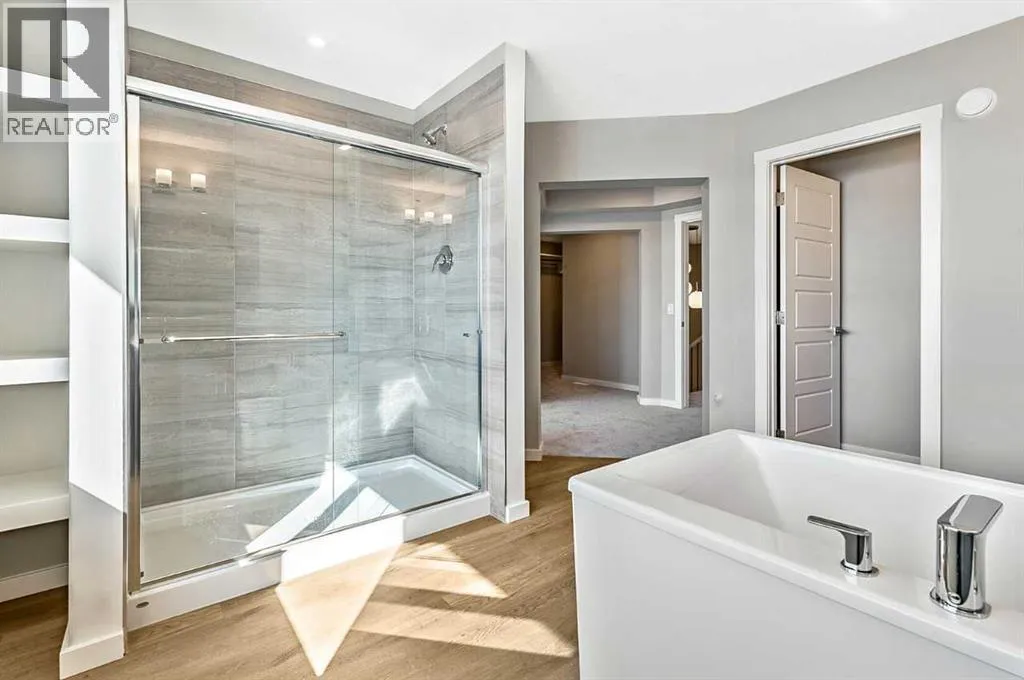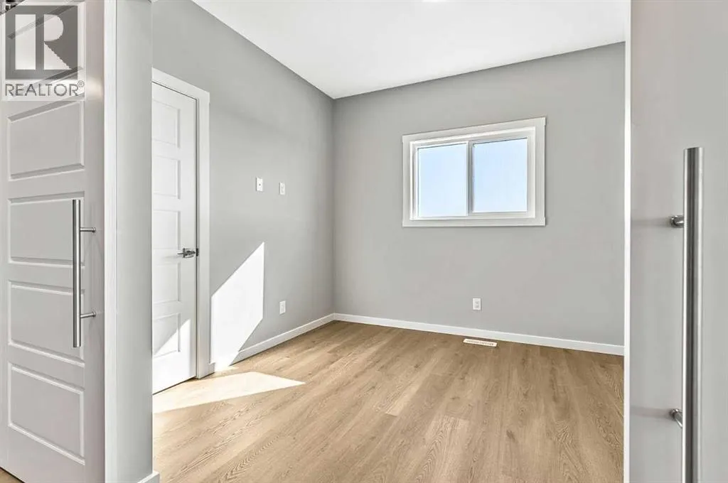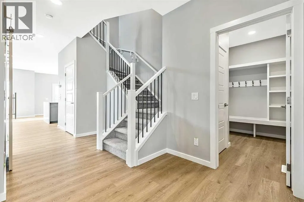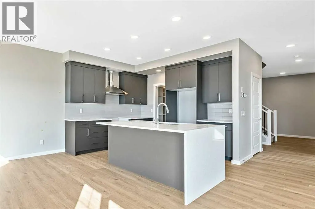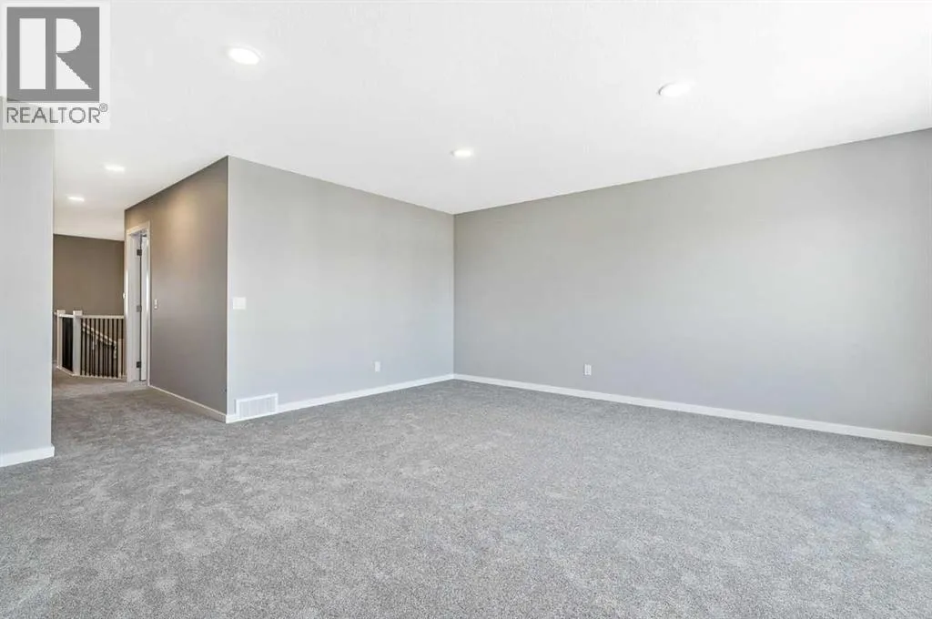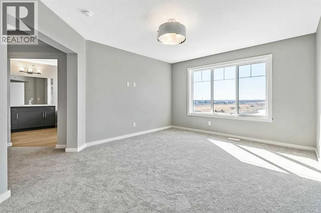 This home is located in the peaceful community of Key Ranch, Airdrie, Alberta. This beautiful two storey home sits on a spacious traditional lot and has no rear neighbors. It includes a walkout basement to the south facing backyard and includes a rear deck off the main floor, and patio off the walkout basement. This home has a spacious main floor flex room for an office or guests. The main floor boasts 9ft knockdown ceilings for a bright and open feel. Including high-end kitchen finishes such as; chimney hood fan, soft-close cabinets to the ceiling, quartz countertops, and an undermount sink. Primary bedroom retreat featuring a 5-piece ensuite with dual vanity sinks, free-standing soaker tub, walk-in shower with tiled walls, and a private water closet. Custom melamine shelving in the pantry and primary walk-in closet for optimal storage. Triple-pane windows, high-efficiency furnace, hot water tank, and HRV system for superior energy efficiency. (id:27476)