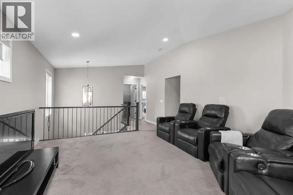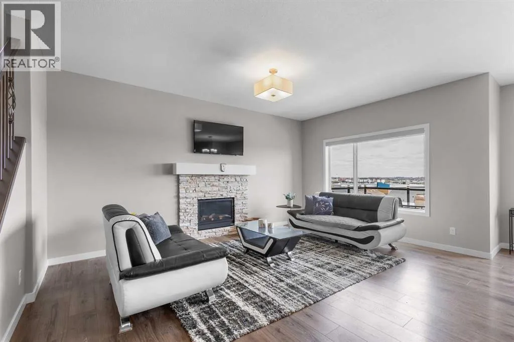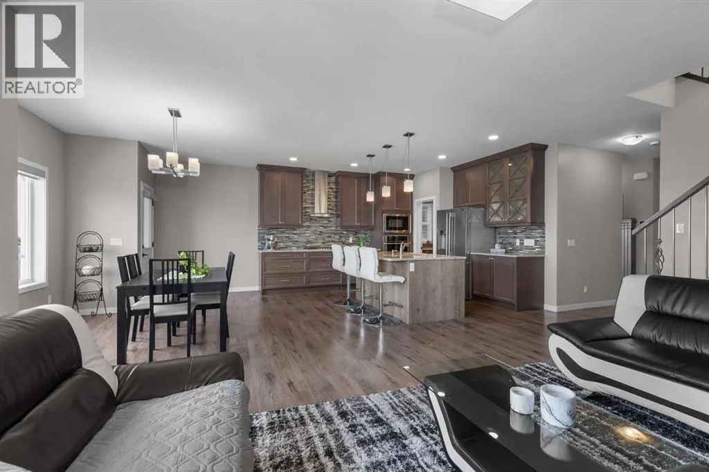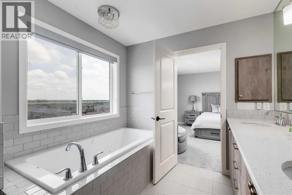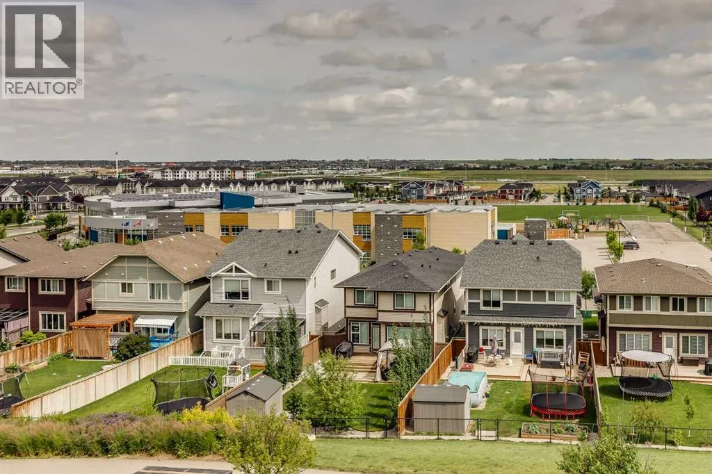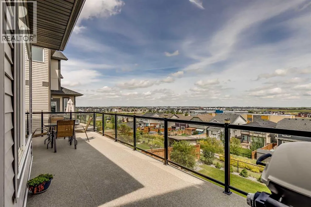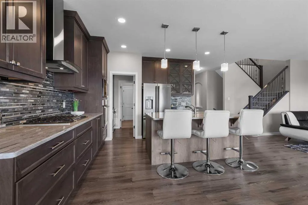 Beautifully appointed & ideally located, this 6-bedroom walkout home with a LEGAL suite, dream garage & premium upgrades delivers upscale comfort, functional design & long-term versatility. Backing onto a scenic pathway leading to Northcott Prairie School & a peaceful pond, this home blends family-friendly convenience with elevated style. Smart lights & switches are installed throughout, with cameras & door sensors on all entry points. Wide plank flooring, curved staircase & railings, bullnose corners, a soft neutral palette & expansive windows create a warm, welcoming atmosphere. The open layout encourages connection, from quiet evenings by the gas fireplace to lively gatherings in the oversized dining area. The modern kitchen inspires culinary creativity with full-height cabinetry, glass backsplash, gas cooktop, built-in wall oven, under-cabinet lighting rough-in & a statement island for casual meals. A walk-through butlerâs pantry adds efficiency with a second gas stove, prep sink & extra storage. Two spotlight-lit alcoves add stylish display options. Step outside to the full-width upper deck with glass railings, gas & water lines & take in tranquil views. A private den provides a quiet space for work or study. Upstairs, a spacious bonus room invites family downtime, while four large bedrooms ensure room for all. The elegant primary retreat includes a walk-in closet & spa-inspired ensuite with dual sinks, soaker tub & glass shower. A secondary bedroom with private 3-pc ensuite is perfect for guests or teens, while a shared 4-pc bath & upper laundry add daily ease. The finished walkout level adds incredible flexibility with a bright, open-concept legal suite featuring two bedrooms, a full kitchen with gas rough-in, professional metallic epoxy floors, under-cabinet lighting rough-in, separate laundry, 3-pc bath & private entryâideal for multi-gen living or long-term guests. Outside, the yard features a covered lower patio with rough-in for a hot tub, both gas & wat er lines, garden beds & direct access to the pathway network. The charming front porch boosts curb appeal & makes a perfect morning coffee spot. The garage is a standout with gas line for future heater, hexagon LED lighting, pro-grade floor tiles, overhead storage & handy man door. Just a 5-min walk to school & 18-min stroll to shops, with easy access to QEII, CrossIron Mills & Calgaryâthis is a rare chance to live beautifully in a prime Airdrie location. (id:27476)
