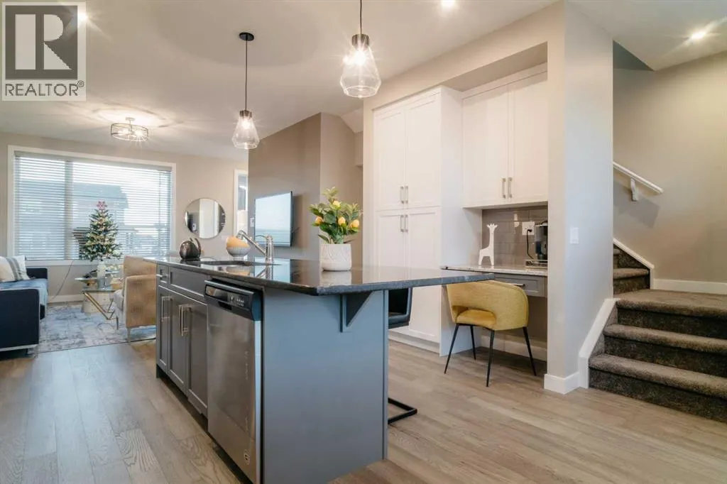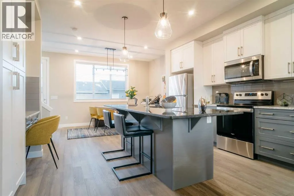 END UNIT, THIS HOME IS UNDER CONSTRUCTION, 30 TO 45 DAYS TO COMPLETION. DOUBLE DETACHED GARAGE, DECK, FENCED AND LANDSCAPED, NO CONDO FEES. PICTURES ARE OF SAME MODEL, NOT SUBJECT PROPERTY. Welcome to the "Glasgow" townhome, by Award winning, Master Builder, Douglas Homes Ltd. From the front covered porch, the entry opens onto the spacious great room with 9ft ceiling and gleaming hardwood floors throughout the main floor. The aspiring chef will appreciate the well planned "island" kitchen. From the upgraded 42 inch, soft close cabinets, to the gorgeous quartz countertops, everything is within easy reach. The sparkling stainless steel fridge, the glass top, self cleaning electric range, dishwasher, and over the range microwave/hoodfan are all just an arms length from the kitchen sink. Opposite side of the island, provides a convenient pantry, and desk with upper cabinet for all those recipe books you will collect. The spacious dining area features a large picture window looking out upon the back yard with room for the kids to play, with a rear entry door to the deck for those summer bbq's. Here also is a 2pc powder room for your guests convenience, Upstairs includes 2 good sized secondary bedrooms, a 4pce bathroom with quartz vanity and tile floors, a convenient upstairs laundry, and a spacious primary bedroom with large upsized window and ensuite bath, with walk in shower, with glass front, tile floor and twin sinks and quartz vanity. The full basement provides rough in plumbing for a future bath, one window for future bedroom, and enough space remaining for a spacious future family room if you decide your family needs room to spread. All this in the desirable new subdivision Cobblestone Creek, with tennis courts, playgrounds, future school reserve, pathways and numerous green spaces, on the western edge of Airdrie, with wide open country side, and views to the west.Directions: (id:27476)
