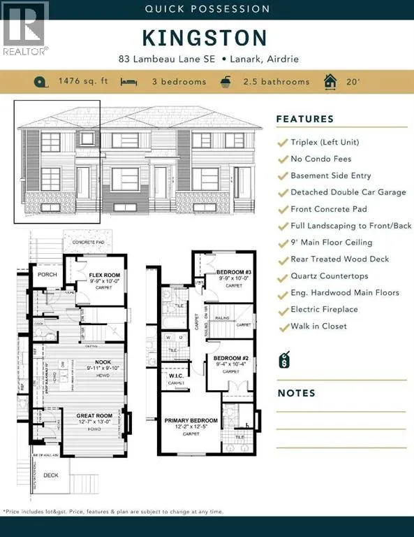 PLEASE NOTE: UNTIL JAN 18 LIST PRICE CAN BE REDUCED BY ADDITIONAL $7500 AS DEVELOPER BONUS. IMMEDIATE POSSESSION, END UNIT, SIDE ENTRY TO BASEMENT. ,DOUBLE DETACHED GARAGE, DECK, FENCED AND LANDSCAPED, NO CONDO FEES. Welcome to the "Kingston" townhome, by Award winning, Master Builder, Douglas Homes Ltd. From the front covered porch, the entry opens onto the front flexroom/den with close by 2pc powder room. 9ft ceiling and hardwood floors throughout the main floor. The aspiring chef will appreciate the well planned "island" kitchen. From the upgraded 42 inch, soft close cabinets, to the gorgeous quartz countertops, everything is within easy reach. The sparkling stainless steel fridge, the glass top, self cleaning electric range, dishwasher, and over the range microwave/hoodfan are all just an arms length from the kitchen sink in the huge island. The spacious dining area features a large picture window. The spacious greatroom with feature electric fireplace, with large picture window looking out onto the large back yard, with lots of space for the kids to play. Also a rear entry door to the deck for those summer bbq's. Upstairs includes 2 good sized secondary bedrooms, a 4pce bathroom with quartz vanity and tile floors, a convenient upstairs laundry, and a spacious primary bedroom with large upsized window and ensuite bath, with walk in shower, with glass front, tile floor and again a quartz vanity with his n her sinks. The full basement provides rough in plumbing for a future bath, one window for future bedroom, and enough space remaining for a spacious future family room if you decide your family needs room to spread. . THIS IS AN END UNIT WITH SIDE ENTRY TO THE BASEMENT. (id:27476)