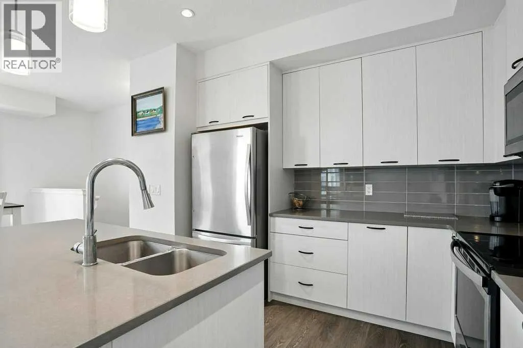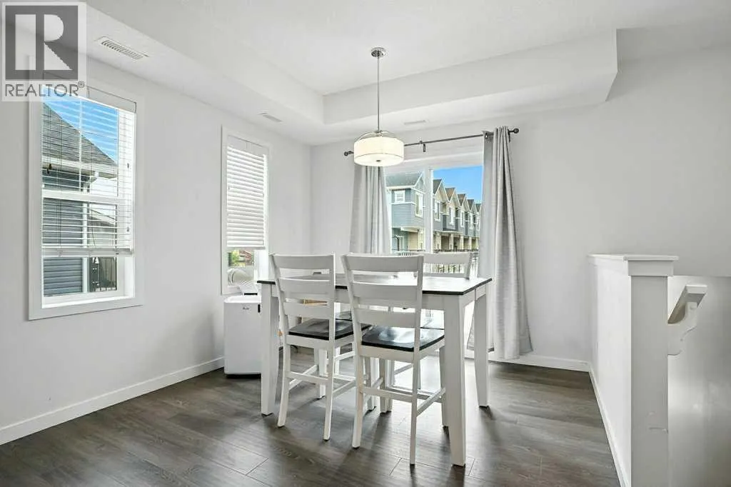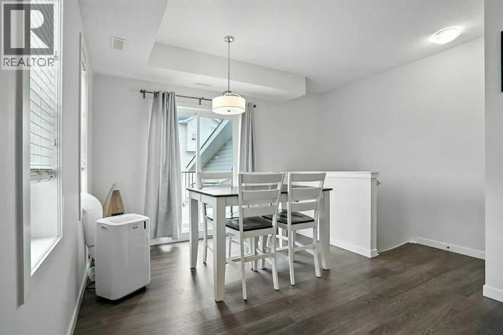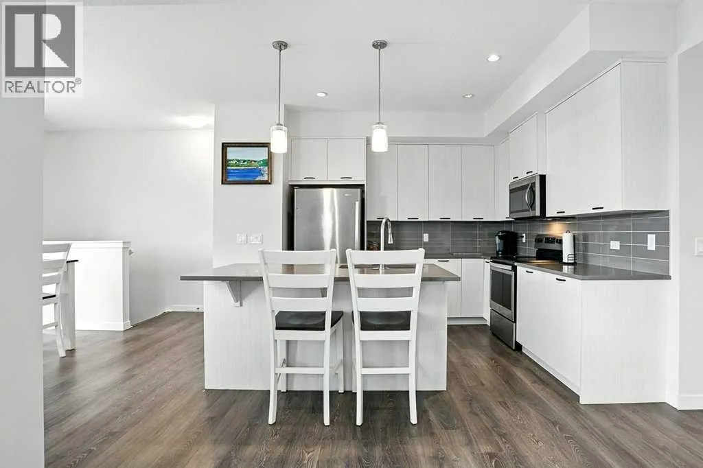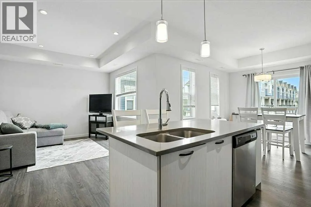 Welcome to this beautifully appointed 2-bedroom, 1-bathroom raised townhome in the vibrant community of the Canals. Offering a thoughtful layout with 9 ft knockdown ceilings and an abundance of natural light, this home feels open and inviting from the moment you step inside. The bright kitchen is designed with both style and function in mind, featuring quartz countertops, stainless steel appliances, ample cabinet space for storage, and modern pendant lighting over the island. The dining area is perfectly positioned beside large windows, creating a warm and welcoming space for everyday meals or entertaining guests. The spacious living and dining areas flow seamlessly onto a huge elevated deck, providing plenty of room for relaxing outdoors, enjoying summer barbecues, or simply taking in the fresh air. Both bedrooms are generously sized with easy access to the well-appointed 4-piece bathroom. Additional highlights include laminate flooring throughout, a modern colour palette, and an overall design that blends comfort with convenience. The ground floor features a welcoming foyer and a single attached garage. Very well maintained condo complex, beautifully maintained grounds & landscaping and visitor parking throughout the complex. Located in one of Airdrieâs most sought-after communities, this property is within walking distance to schools, soccer fields, churches, and picturesque ponds. Whether youâre a first-time buyer, downsizing, or looking for a smart investment, this home offers excellent value in a prime location with easy access to amenities, parks, and pathways. Donât wait, call your favourite realtor and book a showing today! (id:27476)