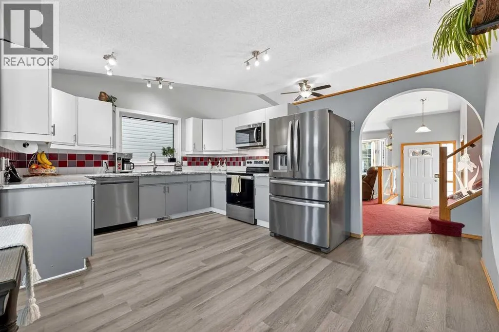 They donât make them like this anymore !! This splendid 3 bed/2.5 bath large family home has been lovingly maintained and updated through the years and offers features unique to other 4-level splits. A wide and inviting entrance leads to an expansive main floor with vaulted ceilings, front living room, formal dining room, and updated kitchen featuring new vinyl flooring, stainless steel appliances (2024), updated counters, and trendy two-tone cabinets. Stunning glass wall insert looks into the third level family room â excellent for watching the little ones while preparing lunch! Upper level offers a king-sized primary bedroom with large walk-in closet & closet organizers and updated 3-piece ensuite with oversized shower! Secondary bedrooms are of generous size and share an updated full bathroom with full vanity (both drawers and cupboards!) and plenty of counter space! Skylight and glass inserts in the railings to the upper landing provide even more light and openness! The third level is a cozy place with a huge family room and updated 2-piece bathroom & laundry combination. Over-sized windows, updated gas fireplace and plenty of room for toys or crafts makes this area a family favourite! Level four is almost fully developed and presents ANOTHER space to socialize! The rec room is perfect for the gaming teenager, and the flex room is ideal as an exercise room, has a plumbed sink and rough-in for a future fourth bathroom! Unlike other 4th levels, this one has windows! If that isnât enough, wait until you see the incredible storage in the 5â tall crawl space! Wow! Other upgrades and features include New Vinyl Flooring in all bathrooms and kitchen, New Toilets, Sinks & Faucets, Newer windows (2013), H2O tank (2025), Roof & Siding (2014), Skylight (2025) and Newer lighting! New exterior doors are on order and will be installed prior to possession! Check out the sweet Over-sized, Heated and Fully Finished garage! New dedicated electric panel with 220, New garage door & door opener and New lighting! The front yard provides a sprinkler system and a nice patio to sit in the morning while the backyard features an expansive brick patio and lots of space for play. With a lot over 5000 sq.ft, there is plenty of room to build an additional detached garage with back lane access. Current owner already has City permits and plans, even a carriage house above is an option! Located on a quiet street 5 minutes to Deerfoot, schools, walking paths and shopping, the family-friendly neighbourhood of Meadowbrook is the perfect place to start or grow your own! (id:27476)