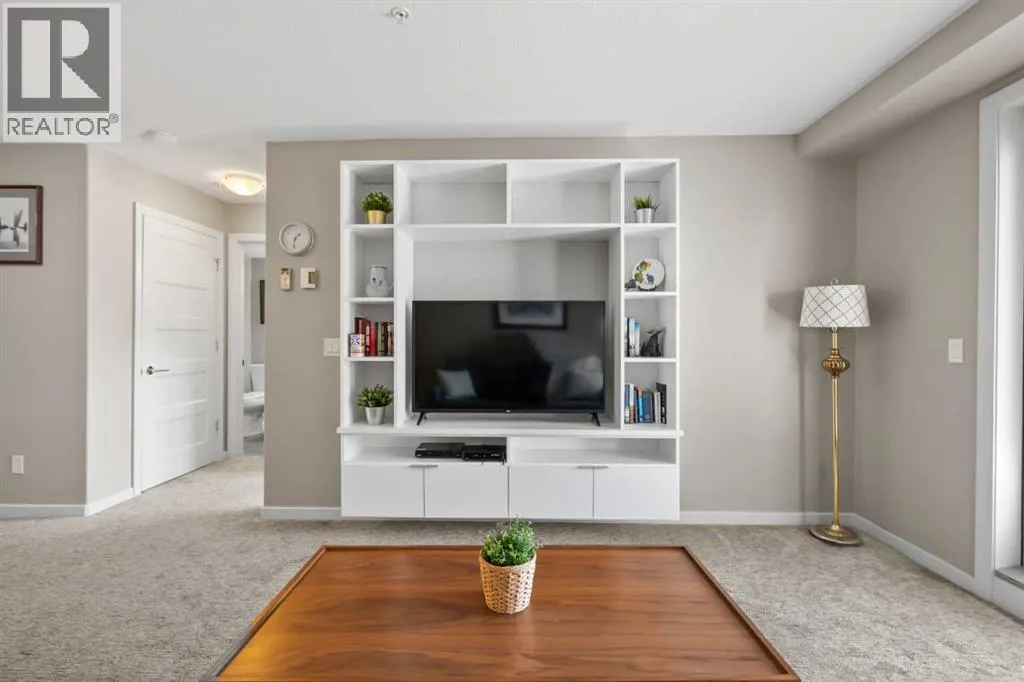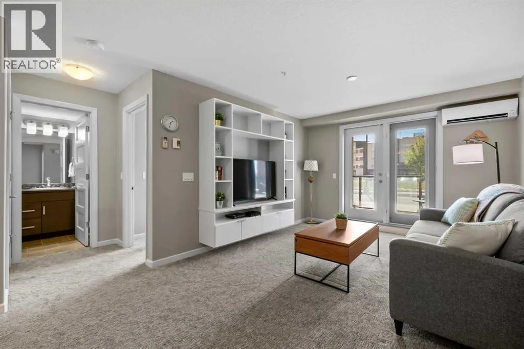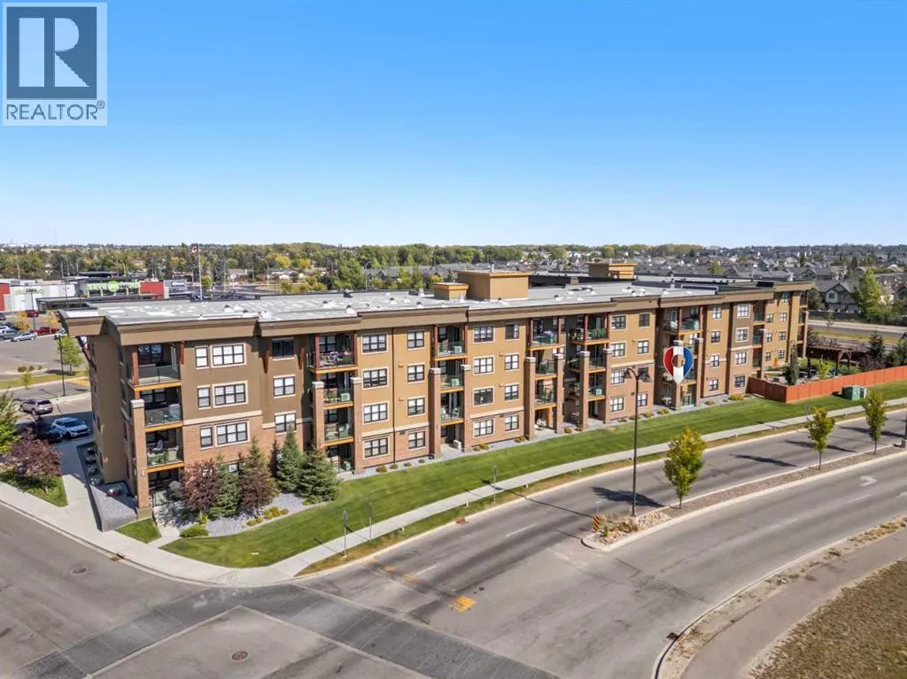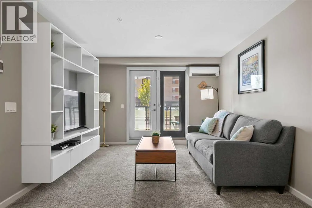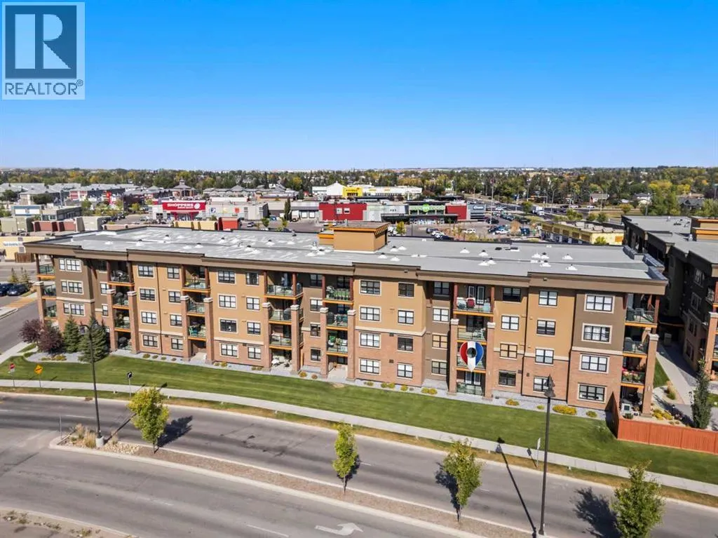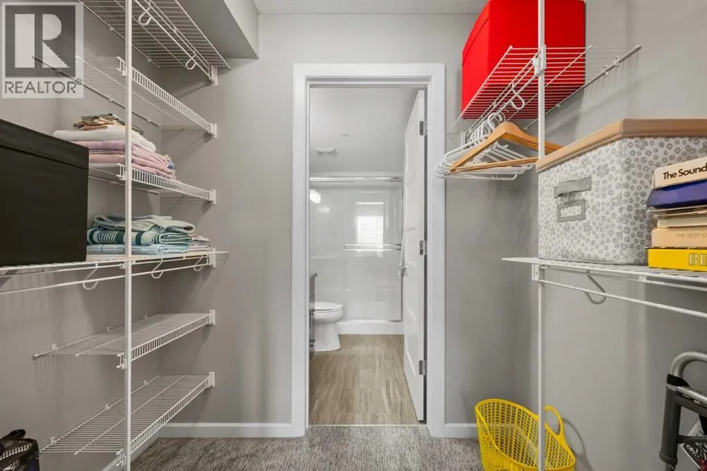 Welcome to The Chateaux! Airdrie's premier 55+ condo building in the wonderful community of Kings Heights known for its sophistication, exceptional pride of ownership and unbeatable access to nearby amenities. Upon entering this unit, you'll be impressed by the abundance of natural light, enhanced by its south-facing exposure. You're greeted by beautiful tile flooring that leads into a welcoming front entrance, where you'll find a spacious coat closet with built-in shelves, perfect for storing coats, keys and shoes. To your right is the kitchen, you will love not only the generous counter space but also the ample cabinetry this layout offers. The kitchen features granite countertops, a large sink, a lazy Susan in the corner cabinet, a garburator and a counter overhang for bar stool seating, ideal for casual meals. Stainless steel appliances and a well-appointed pantry with pull-out drawers complete this thoughtfully designed space. Moving into the living room, enjoy a spacious layout complemented by a beautiful custom California Closets media centre that is perfect for your TV, artwork and storage needs. Stay cool in the summer with a wall-mounted A/C UNIT! Your southwest-facing balcony offers year-round afternoon sun, making it the perfect place to enjoy your morning coffee, tea or an evening drink. This balcony was upgraded at the time of construction with glass panels and a gate, offering convenient direct access to the landscaped common areas, especially great for pet owners. The primary bedroom is a dream, with a large south-facing window and a spacious walk-through closet that leads into your ensuite bathroom. The ensuite features a walk-in shower with a built-in seat and elegant glass doors. The second bedroom is impressively sized and bright with custom built-in California Closet organizers that provide exceptional storage and organization. A second full bathroom is located just outside this room, complete with a beautiful vanity and a large bathtub. In-suit e laundry is neatly tucked into a dedicated closet with room for storage and laundry supplies. This apartment also features a versatile den to the left of the front door that is ideal for a home office, additional storage or exercise space. For parking, enjoy the convenience of a titled underground stall located just steps from the elevator. In front of your stall, youâll find a large, secure storage locker. Plus, thereâs ample outdoor visitor parking for your guests. The Chateaux features a beautifully landscaped courtyard with a gas fireplace, and an amenity room available for private bookings where residents regularly gather here for social events and happy hours. There's also a secure underground workshop for woodworking enthusiasts. Located in Kings Heights, youâre within walking distance to Save-On-Food, Shoppers Drug Mart, banks, salons, restaurants and more meeting all your grocery, shopping and healthcare needs. Call for a private viewing today! (id:27476)