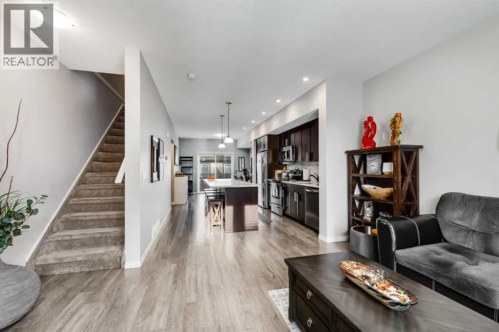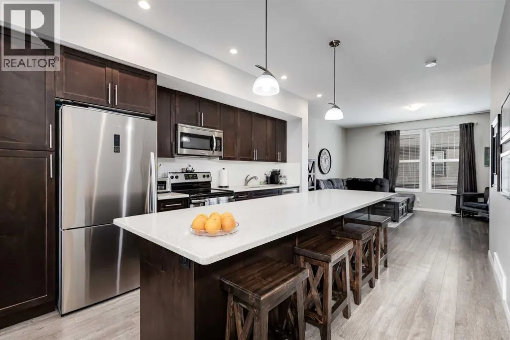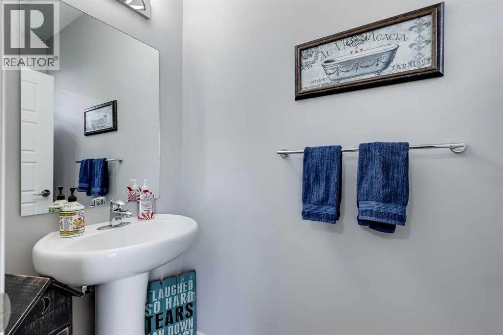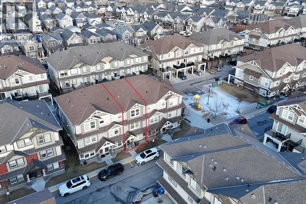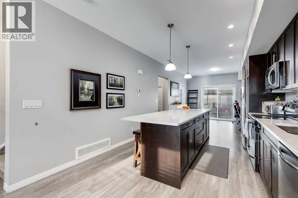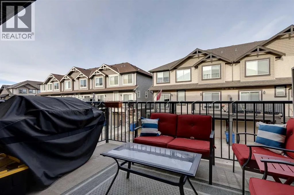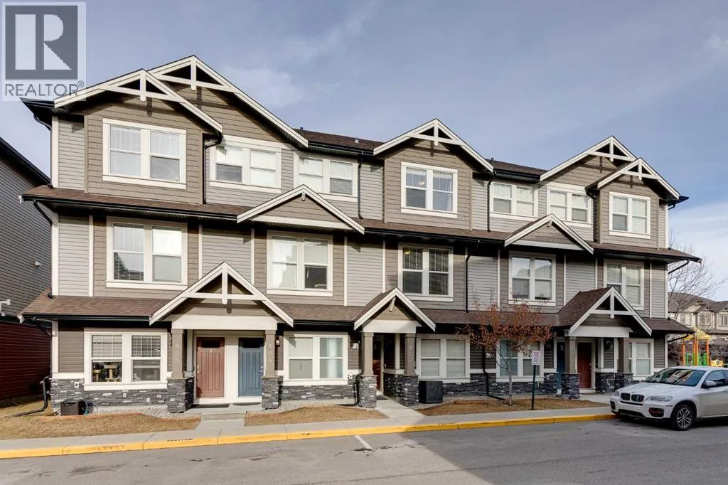 Bright and open 2-bedroom townhome in the community of Williamstown. An excellent value with condo fees that include the Airdrie monthly water and sewer bill. Before you enter you'll notice the playground right beside the home, and the visitor parking stalls right in front, making it ideal for guests. The entry level offers a 40' Long OVERSIZED DOUBLE GARAGE, plus driveway, allowing parking for up to 3 vehicles, plenty of storage, and a rare additional access door from the garage to the back, making taking out the garbage very easy! The open-concept main floor is complete with 9-foot ceilings, upgraded cabinetry, quartz countertops, stainless steel appliances, and an impressive 10 FOOT LONG KITCHEN ISLAND making for lots of counter space. Central AIR CONDITIONING makes this home comfortable all year round. The dining area is large enough for a big table, and with the balcony right here, it makes for the perfect space for entertaining. The living room features an electric fireplace and A main floor half-bath completes this level. Upstairs, the third floor features a large primary suite, including a walk-in closet and a 4-piece en-suite with Double Sinks. The second bedroom is also a great size and features double closets. The upstairs is complete with the main 4-piece bathroom, and UPPER LAUNDRY. In the community of Williamstown you can enjoy the environmental reserves thats just steps away with wetlands, walking paths, playgrounds. You're also just a short walk from Herons Crossing K-8 School. Book your showing today! (id:27476)