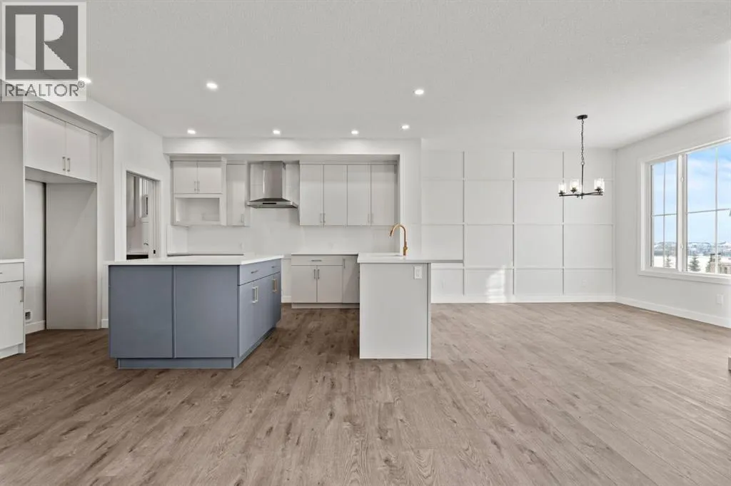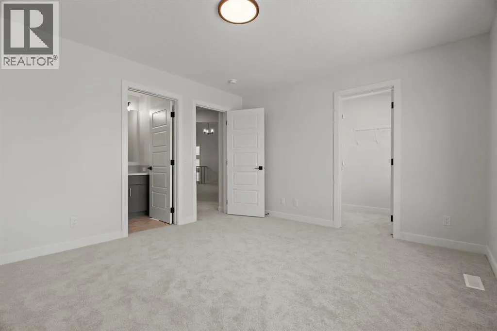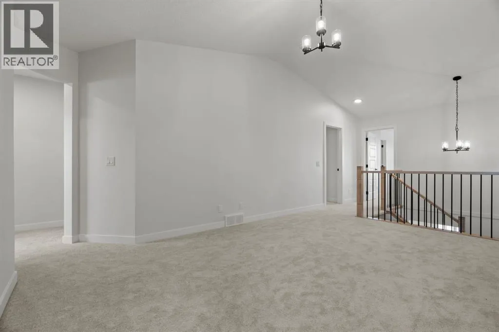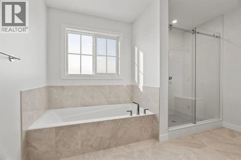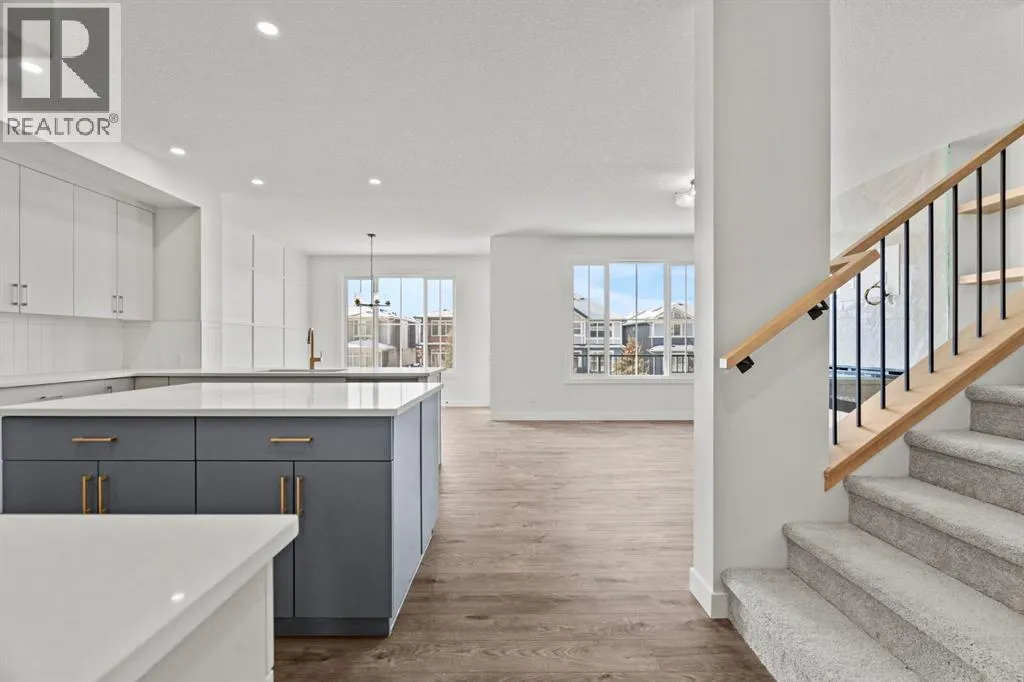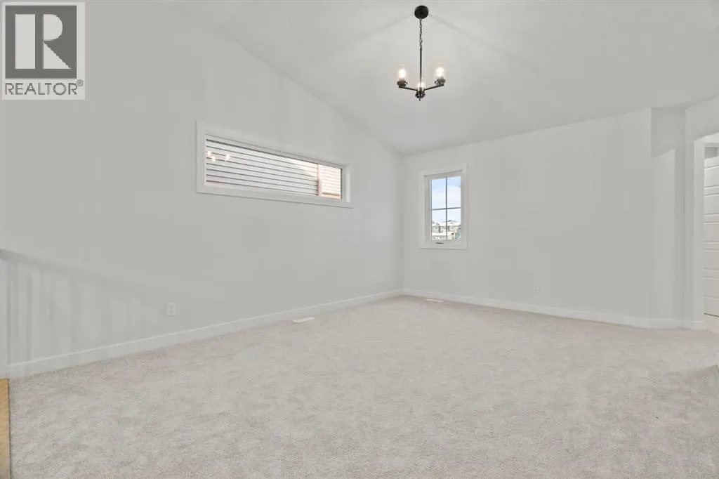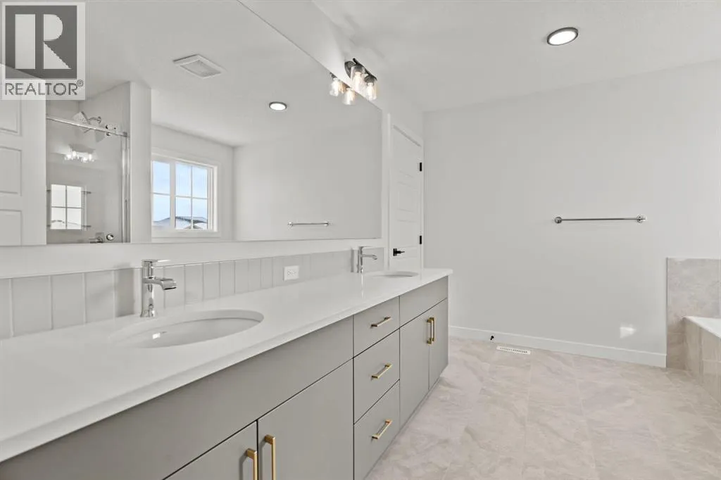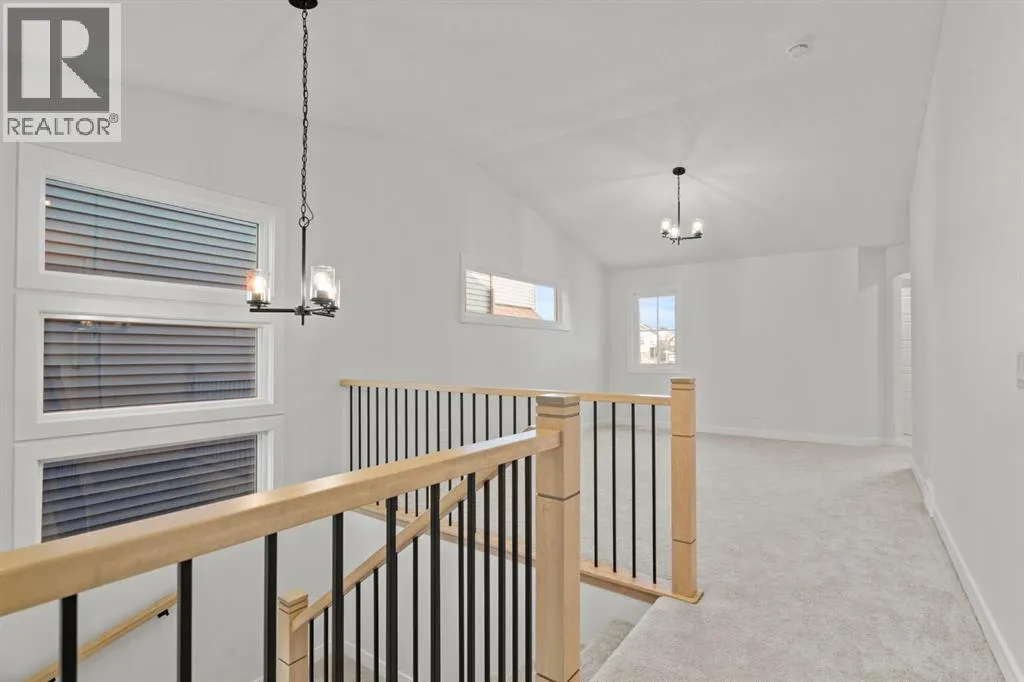 Welcome Home. Built by award winning home builder Sterling Homes âPierce 2â model at 2220 Lancaster Heights SE, is a beautifully designed home offering 2,541 sq ft, 4 bedrooms, 4 bathrooms, and a layout that blends modern style with everyday practicality.The main level is flooded with natural light and showcases wide plank flooring, oversized windows, and a seamless open-concept design. The kitchen is a true showpiece, featuring full-height cabinetry, quartz countertops, a large central island, stainless steel appliances, chimney hood fan, and elegant gold hardware and faucet. A highly desirable spice kitchen with gas line and pantry adds exceptional functionality for cooking and entertaining. The dining area is anchored by a striking custom wall detail and modern lighting, creating a warm yet elevated space for gatherings.The living room is both stylish and inviting, centered around a sleek electric fireplace with built-in shelving, while large windows frame peaceful views of the surrounding greenspace. A main floor flex room with double pocket doors offers versatility as a home office, guest room, or playroom, complemented by a full main floor bathroomâideal for multi-generational living.Upstairs, the thoughtfully designed layout includes four bedrooms, highlighted by a rare dual primary bedroom configuration. The main primary retreat features a luxurious 5-piece ensuite with dual sinks, tiled shower, private water closet, and ample storage, while the second ensuite is finished with tiled shower walls and modern fixtures. A vaulted ceiling bonus room provides an airy second living space, perfect for relaxing or family movie nights, and upper-level laundry adds everyday convenience.Additional features include 9â basement ceilings, side entrance, maple railing with iron spindles, tile flooring in bathrooms and laundry, and a rear 13â6â x 9â deck overlooking green spaceâperfect for enjoying sunny afternoons and peaceful views.Built with Sterling Homesâ Smart Ene rgy Package, this BUILT GREEN® certified home offers improved efficiency, comfort, and long-term savings. A fantastic opportunity to own a brand new, thoughtfully upgraded home in a growing southeast Airdrie community. (id:27476)