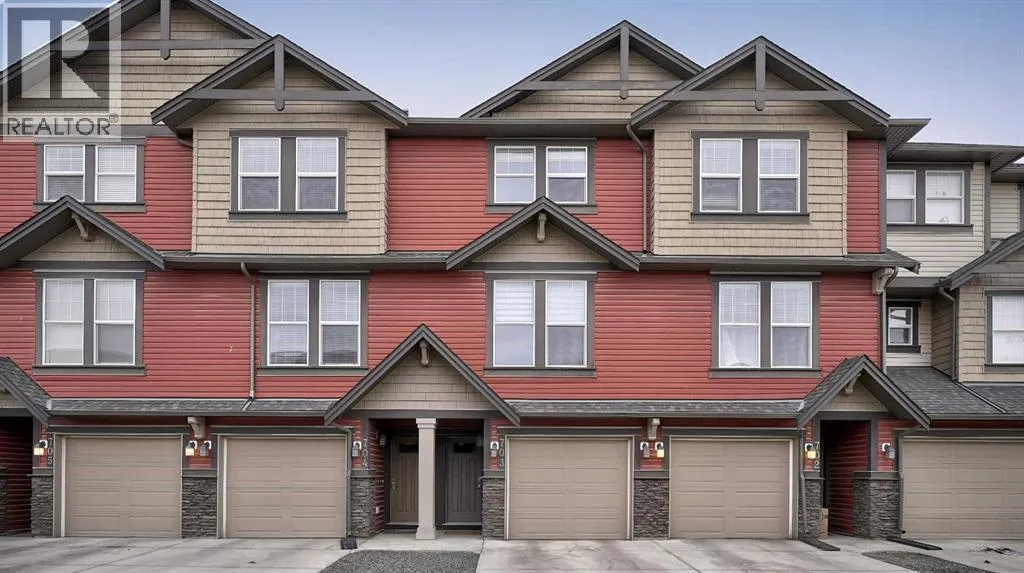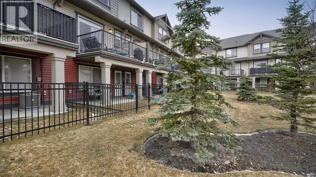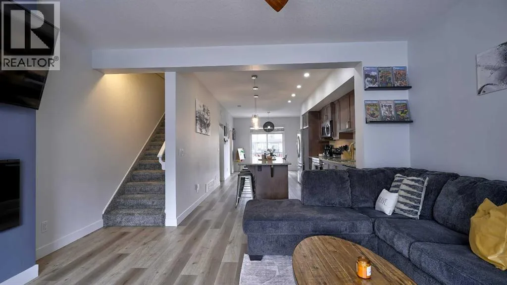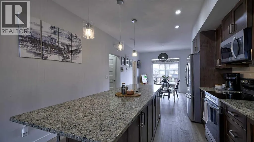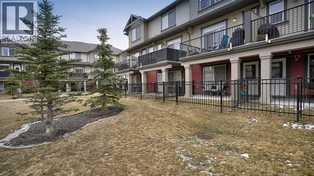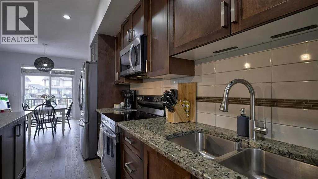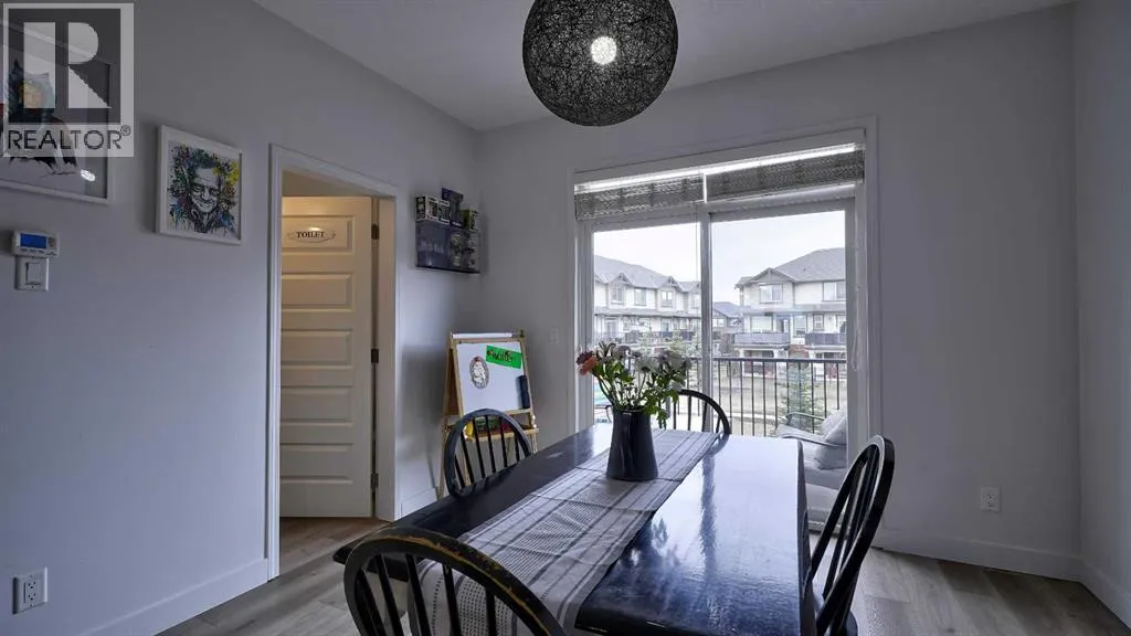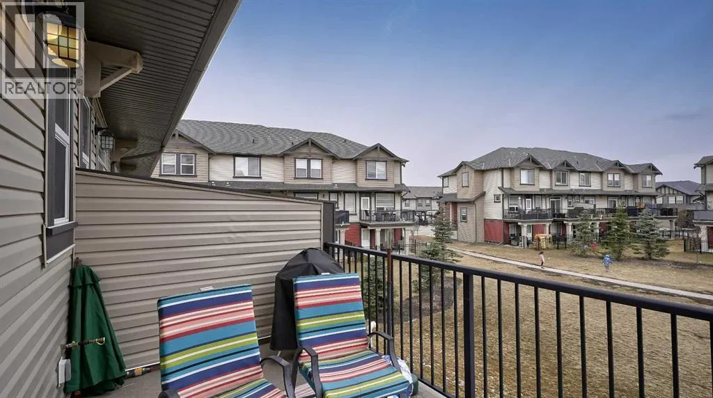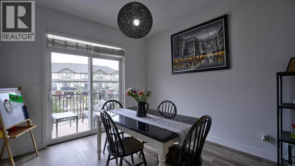 Low maintenance lifestyle living here, w/ quick access to outdoor active living. Entrance way spacious and plus amazing thick newer carpet starting on the stairs. Main floor is perfect for entertaining, being open concept, w/ an abundance of natural lighting. Cozy living room w/ large windows and electric fireplace plus brand new ceiling fan. Massive eat up island, space for all to gather around, w/ granite countertops. Modern pendulum lighting & newer luxury vinyl planking throughout this level. Convenient powder room. Dining room has plenty of space for entertaining, & an unobstructed view of the courtyard. Deck is good sized for enjoying those summer evenings. Laundry facilities are favorably located on the upper level. Master ensuite has double sinks, oversized walk in shower & walk in closet. Carpeting that is throughout is newer, lush and feels amazing on your feet. Tandem parking in this garage, plenty of storage space, plus parking on the driveway. Access to the small fenced yard from the garage. Heron's Crossing Elementary School is just a walk across the street. 60 acres of protected environmental reserve, parks, ponds, playground, bridge, plus miles of trails along Nose Creek are a stones throw away. (id:27476)