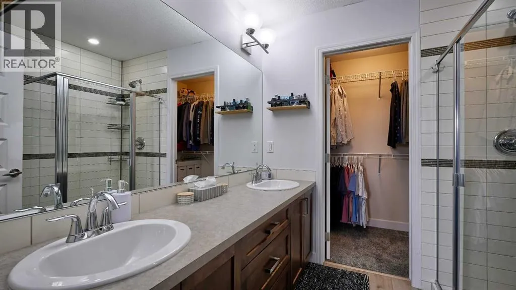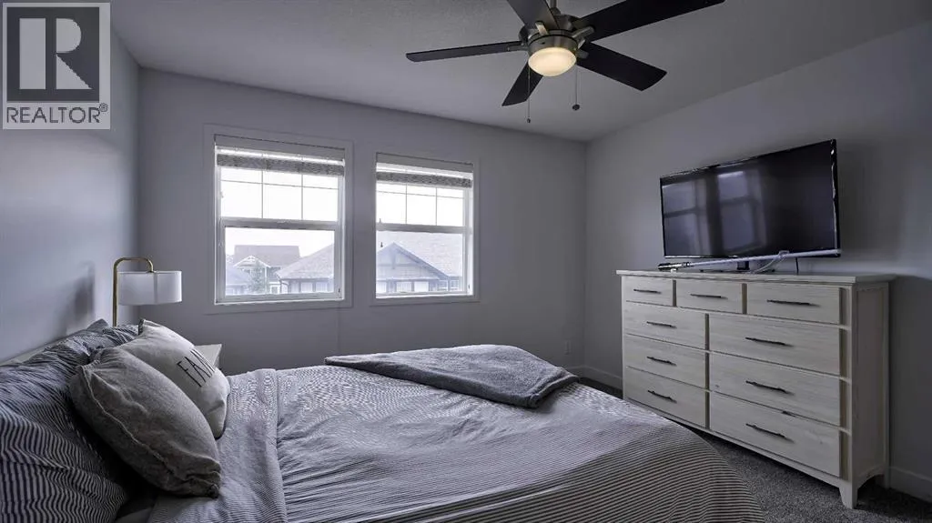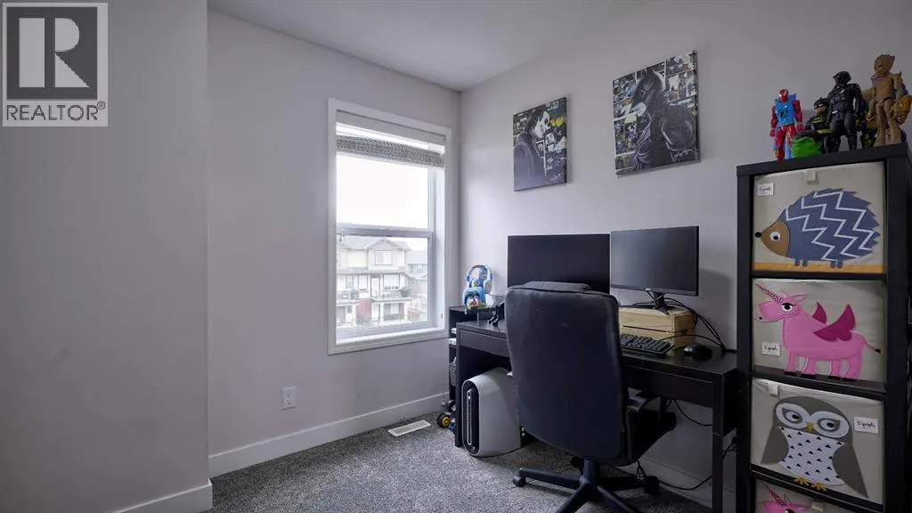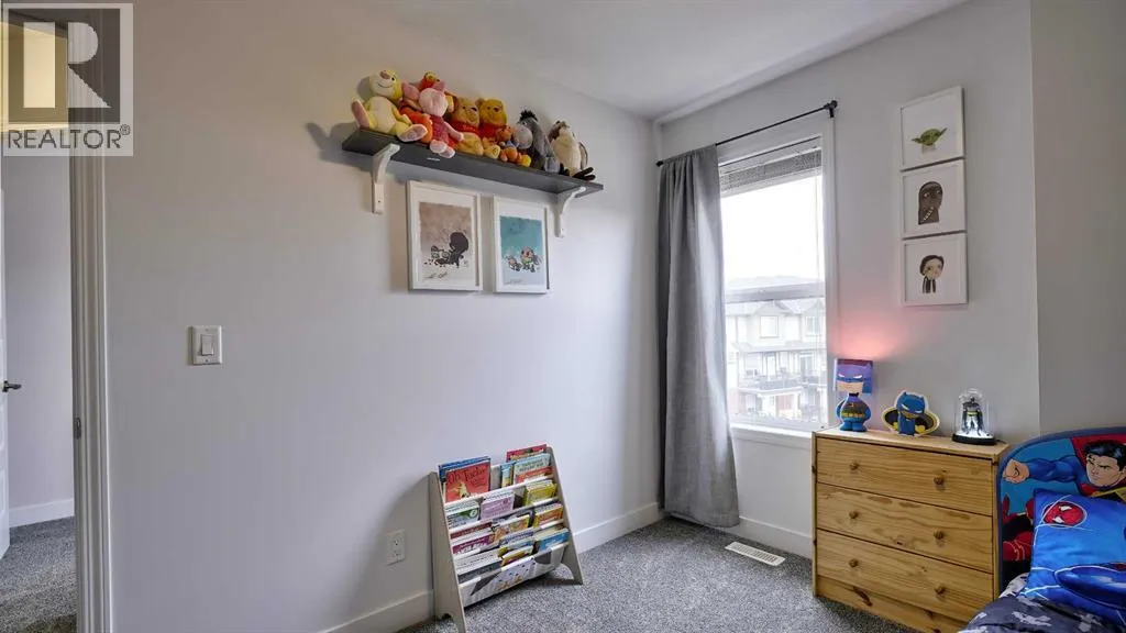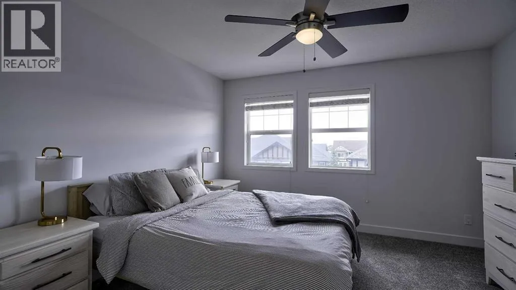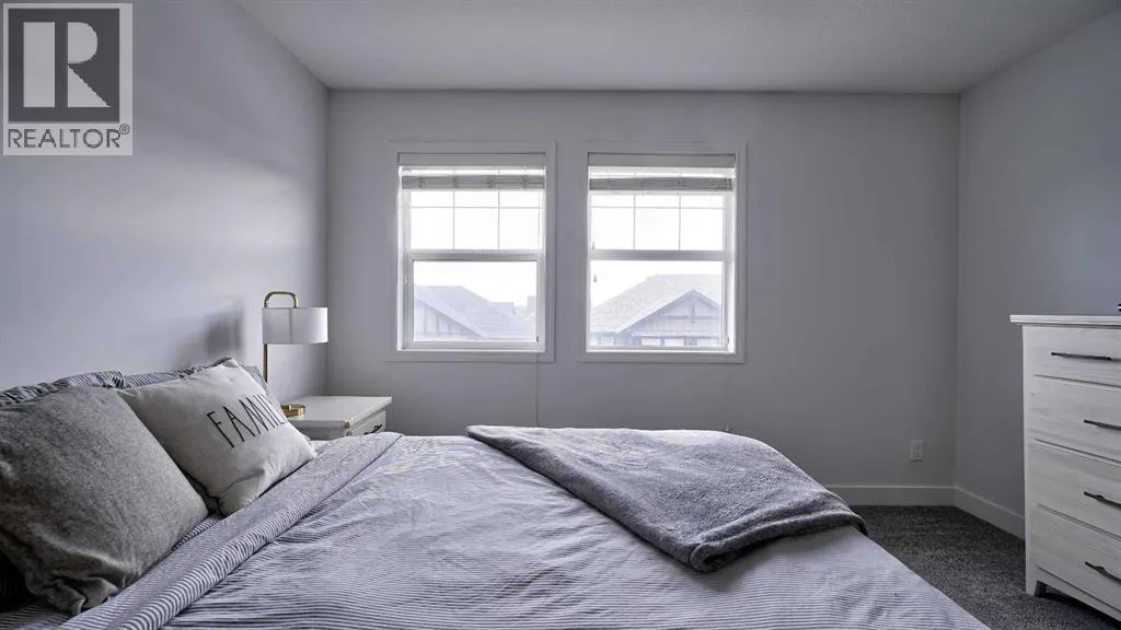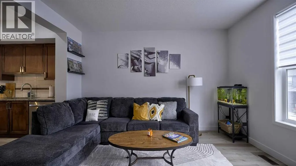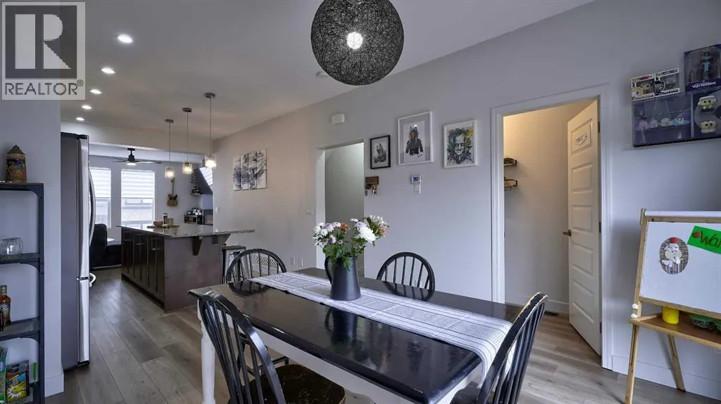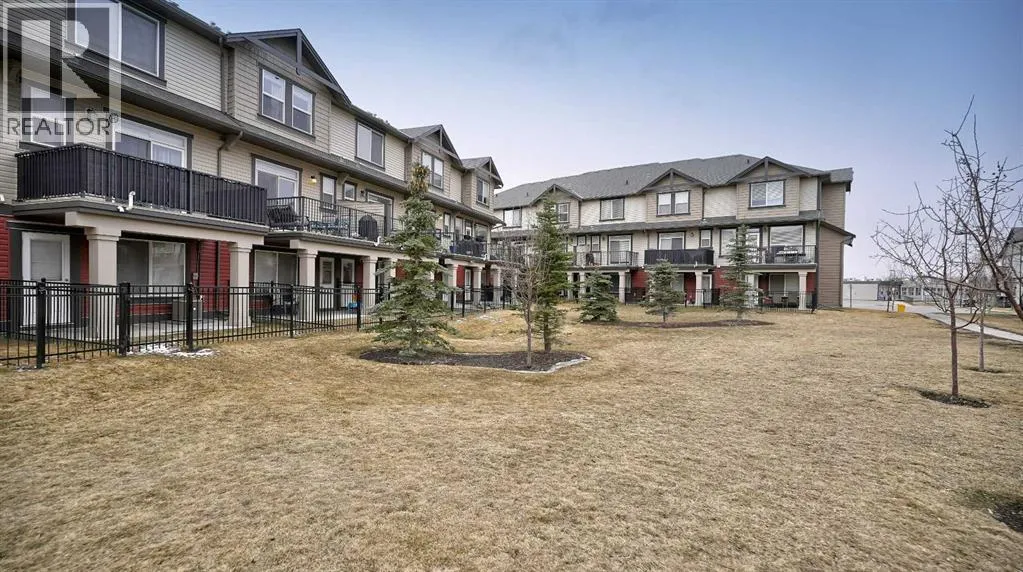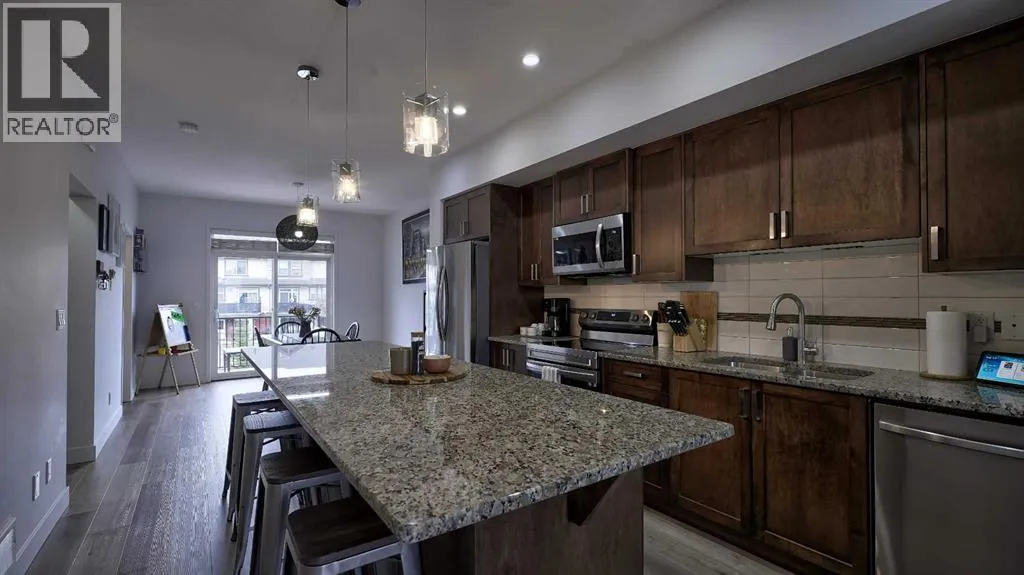 Low maintenance lifestyle living here, w/ quick access to outdoor active living. Entrance way spacious and plus amazing thick newer carpet starting on the stairs. Main floor is perfect for entertaining, being open concept, w/ an abundance of natural lighting. Cozy living room w/ large windows and electric fireplace plus brand new ceiling fan. Massive eat up island, space for all to gather around, w/ granite countertops. Modern pendulum lighting & newer luxury vinyl planking throughout this level. Convenient powder room. Dining room has plenty of space for entertaining, & an unobstructed view of the courtyard. Deck is good sized for enjoying those summer evenings. Laundry facilities are favorably located on the upper level. Master ensuite has double sinks, oversized walk in shower & walk in closet. Carpeting that is throughout is newer, lush and feels amazing on your feet. Tandem parking in this garage, plenty of storage space, plus parking on the driveway. Access to the small fenced yard from the garage. Heron's Crossing Elementary School is just a walk across the street. 60 acres of protected environmental reserve, parks, ponds, playground, bridge, plus miles of trails along Nose Creek are a stones throw away. (id:27476)