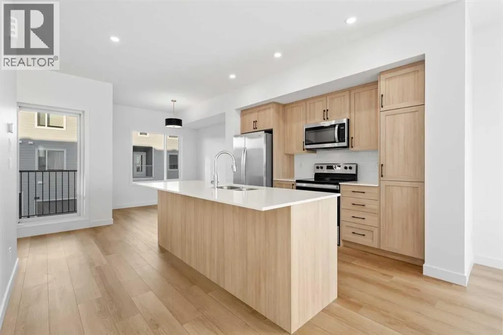 NEW BUILD TOWNHOME | LOW CONDO FEES | 4 BED (3 UP, 1 DOWN) / 2.5 BATH / 1,462 SQ FT | OVERSIZED SINGLE ATTACHED GARAGE + DRIVEWAY | IMMEDIATE POSSESSION â Welcome to the Elm 2 townhome by Minto Communities, an award-winning Canadian builder, located in Wildflower, proudly voted Best New Community in Canada. This vibrant, master-planned community in Airdrie is designed with lifestyle and connection in mind, offering a thoughtful mix of home styles in a neighbourhood built to grow with you.This brand-new townhome features a functional and modern layout ideal for todayâs homeowner. The main floor offers a well-designed living space at the front of the home, creating a welcoming area to relax or entertain. The kitchen is centrally located and showcases stainless steel appliances, a large island, modern finishes, ample cabinetry, and storage. The dining area is positioned at the rear of the home with direct access to a private balconyâperfect for morning coffee or unwinding at the end of the day. A convenient 2-piece bathroom completes this level.Upstairs, the spacious primary bedroom includes a walk-in closet and a private 3-piece ensuite. Two additional bedrooms, a full 4-piece bathroom, and conveniently tucked-away upper-floor laundry provide excellent functionality for families, guests, or home office needs.The lower level features a large foyer with direct access to the oversized single attached garage, along with a fourth bedroomâideal for guests, a home office, or flex space. A full driveway adds valuable additional parking, offering everyday convenience rarely found in townhome living.Residents of Wildflower enjoy exclusive access to The Hillside Hub, a standout amenity centre featuring Airdrieâs first outdoor pool, a hot tub, open-air sports court, and a variety of shared indoor and outdoor spaces designed for gathering, recreation, or quiet retreat. With nearby parks, pathways, amenities, and easy access to major routes, Wildflower delivers a truly well-rou nded lifestyle.Combining award-winning community planning, modern design, low condo fees, and immediate possession, this is an outstanding opportunity to own a stylish new build townhome in one of Canadaâs most celebrated communities. Donât miss your chance to make Wildflower home! Book your visit today! (id:27476)