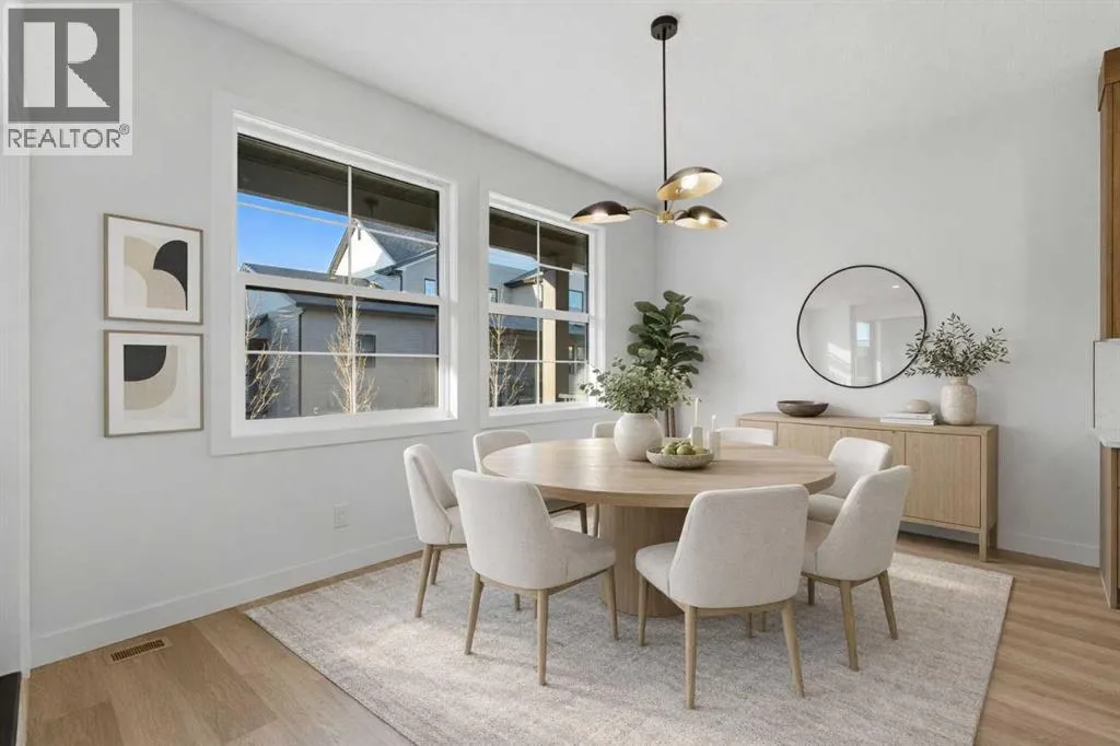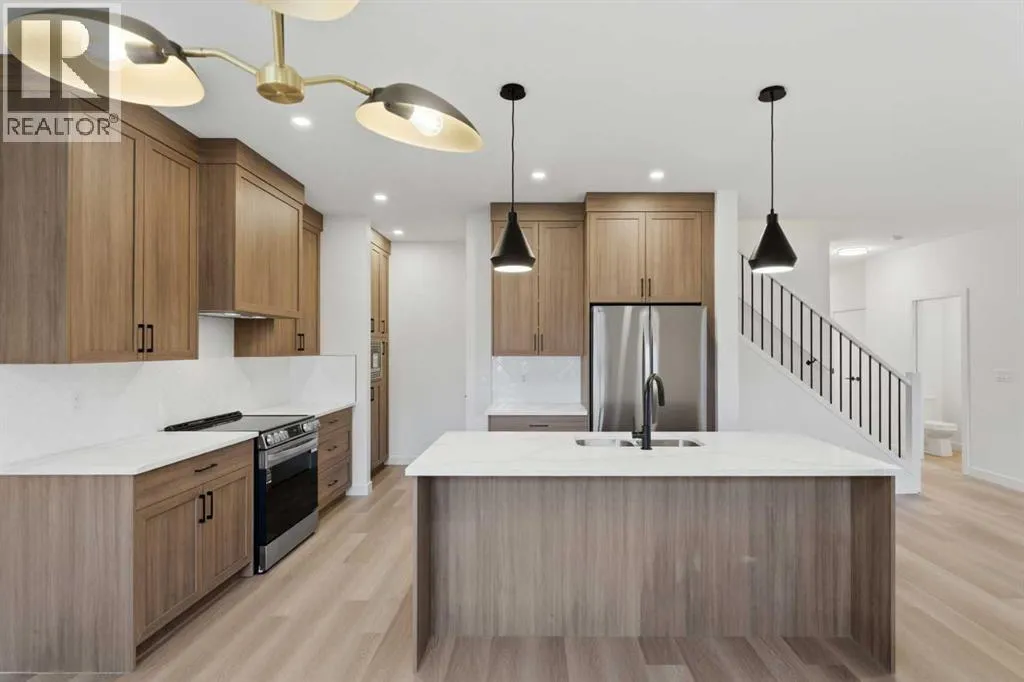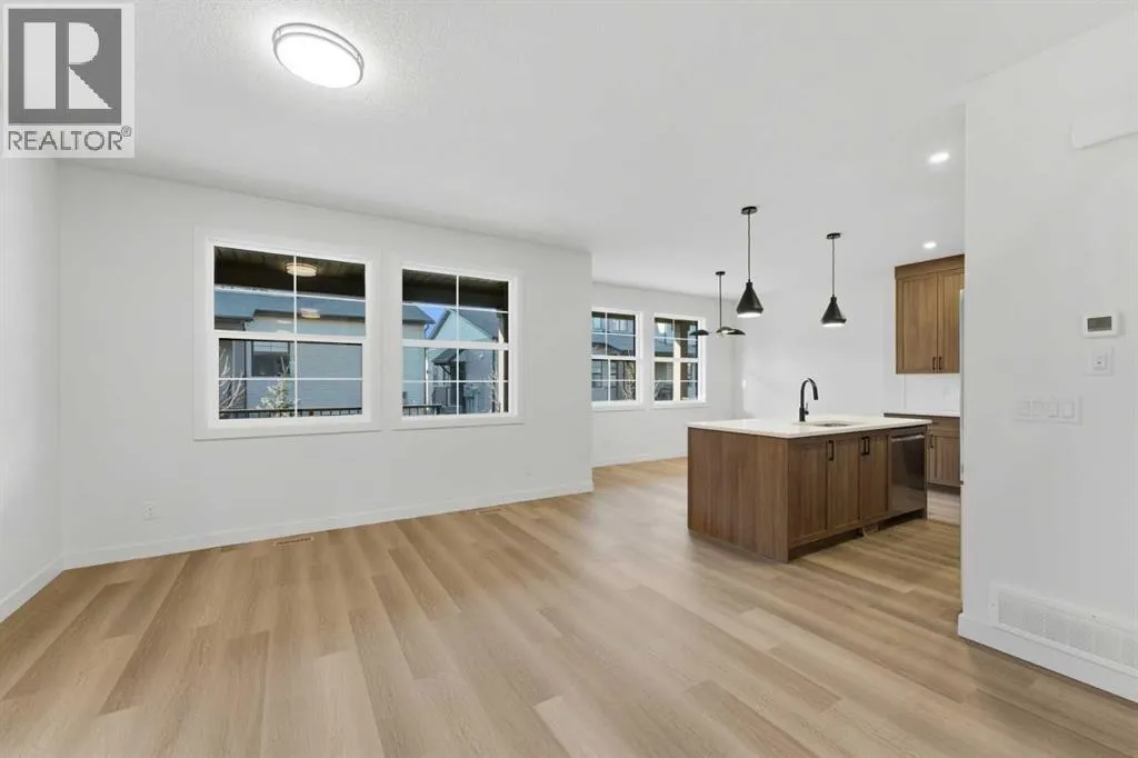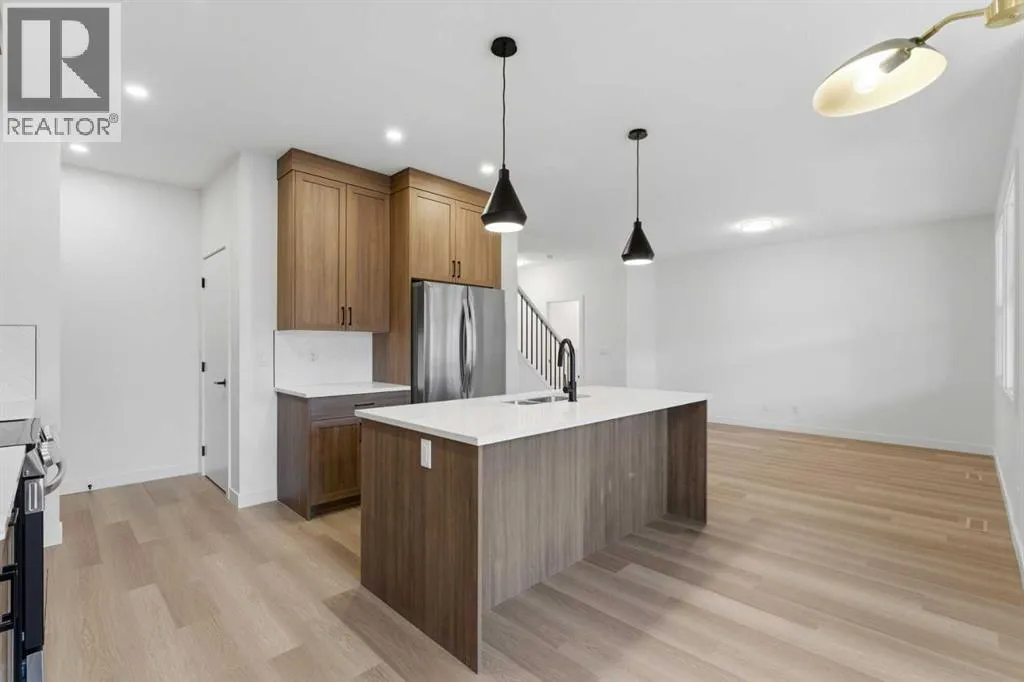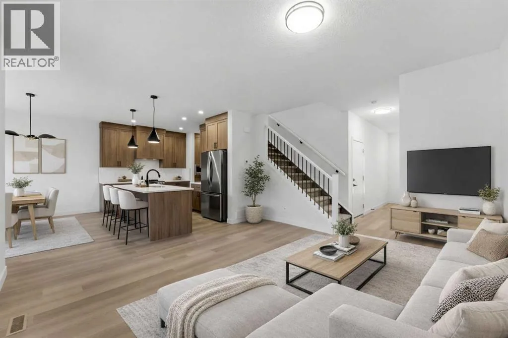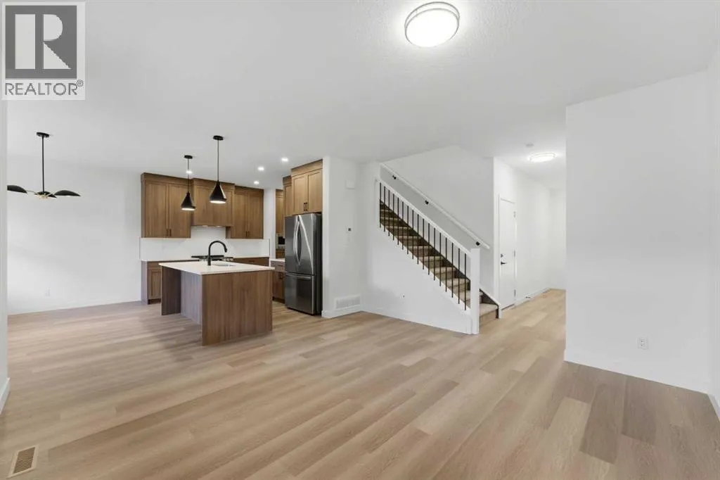 Welcome to luxury and convenience built by Vesta Properties - in the heart of Airdrieâs award-winning community of Cooperâs Crossing. This brand-new beautifully crafted interior-unit townhome combines everyday comfort with smart design. Step inside to discover a bright, functional main level that includes a stylish gourmet kitchen with an oversized island and stainless steel appliances, a cozy family room. Upstairs, a sun-soaked bonus room offers the perfect space to unwind, work from home, or enjoy family time. Just off the bonus area, youâll find two additional bedrooms, a full bathroom, and a convenient upstairs laundry space ( No washer and dryer in unit). Also you will find your primary bedroom, which is a retreat complete with vaulted ceilings and a spa-inspired ensuite. Enjoy the added luxury of 9-foot ceilings on both the main floor and the basement, creating a spacious and airy atmosphere throughout. Summer evenings are made better on your covered west-facing balcony, with a gas line for your BBQ and views of the landscaped green space, offering a peaceful, family-friendly backdrop. Additional highlights include a double attached garage, modern contemporary exteriors, and fully landscaped yards designed for ease and curb appeal. And hereâs the best part... These homes offer a true Lock & Leave lifestyleâexperience it at its best! Whether you're off traveling, managing a busy career, or simply done with yard work and snow removal, you can lock the door and go. No stress. No fuss. Just effortless, carefree living. Book your exclusive tour today! (id:27476)